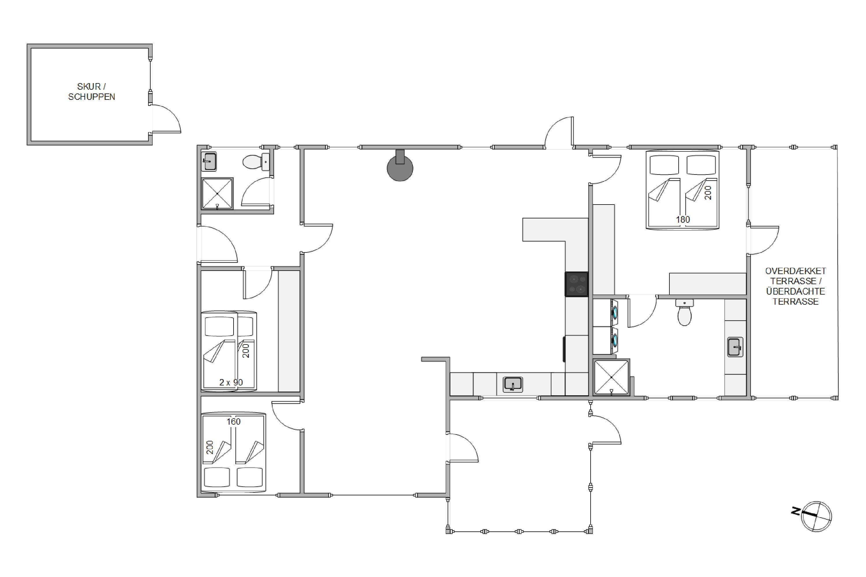 Feriehusets træterrasse går næsten hele vejen rundt om huset. Dette er med til at give jer en masse hyggelige læ kroge, hvor I kan nyde solens stråler. Her er også en overdækket terrasse, som giver jer mulighed for at sidde ude, selv på de dage hvor vejret ikke er helt i top.
