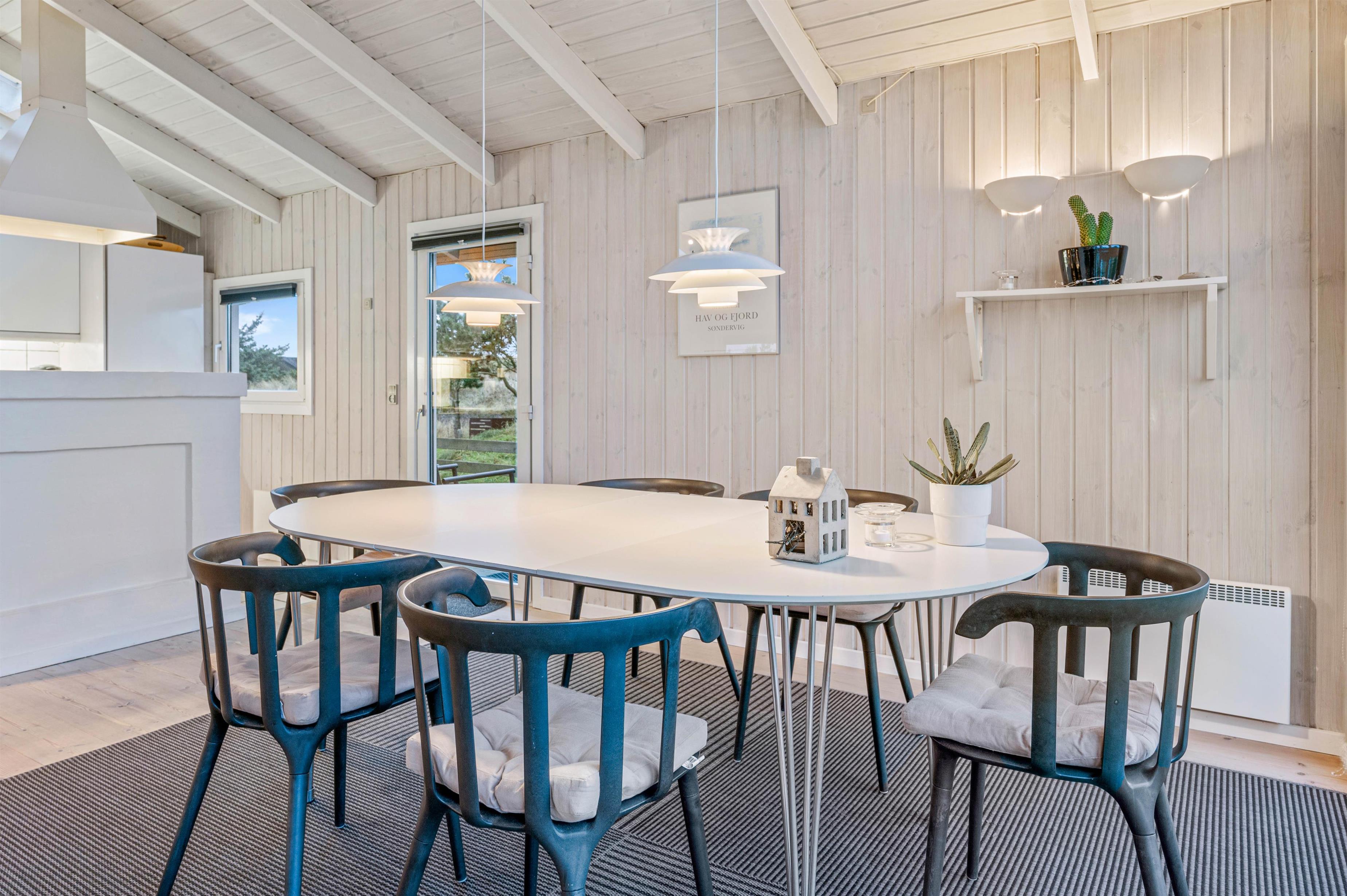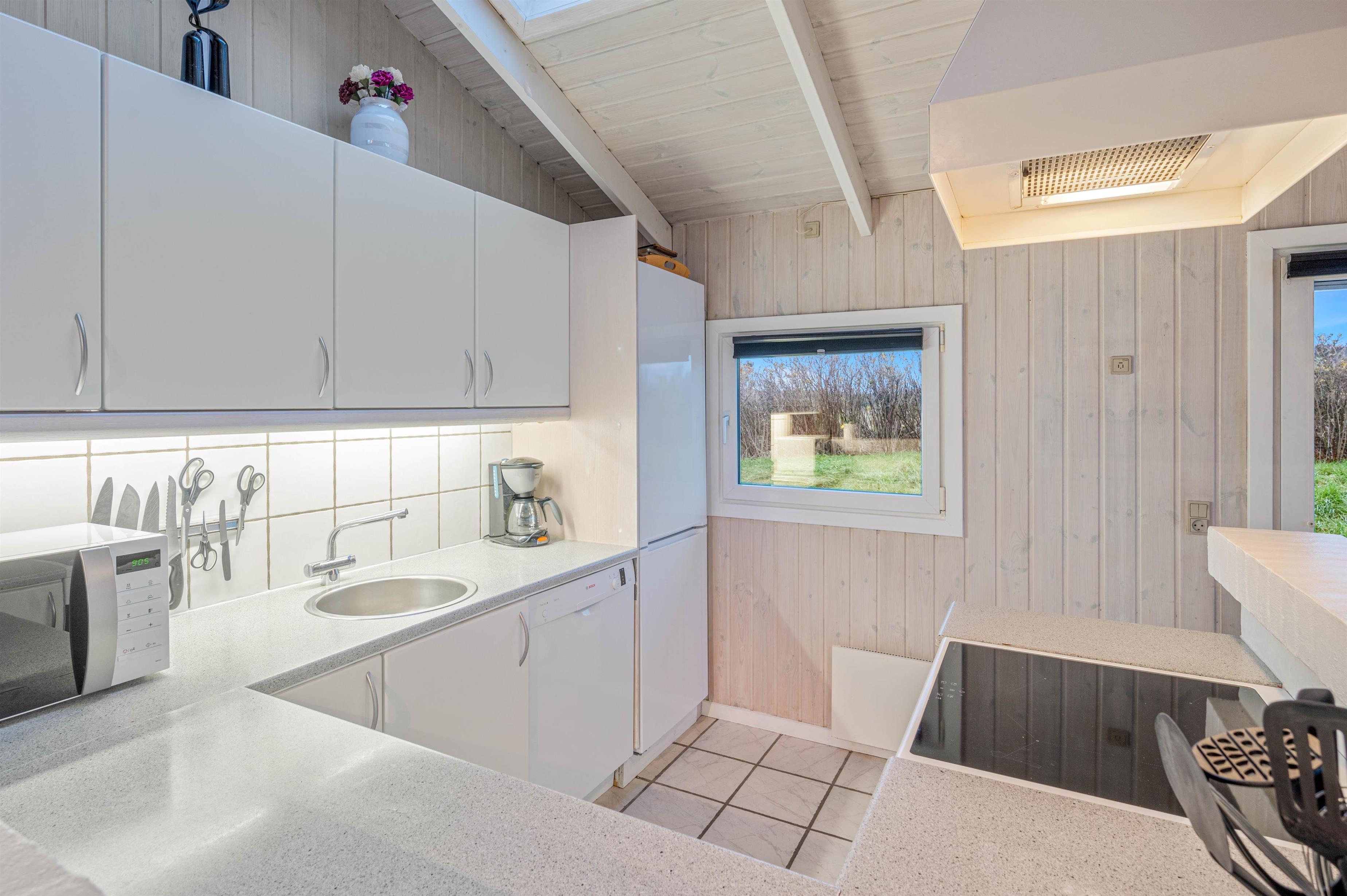 Marehalmen 52 byder jer velkommen til en dejlig lys opholdsstue som er i direkte åben forbindelse med både stue og køkken. Stilen er klassisk sommerhusstil i sort og hvidmalet interiør og køkkenet er fuldt udstyret med alt det nødvendige køkkenudstyr I skal bruge på ferien. Opvaskemaskinen klarer hurtigt opvasken på ferien og der er og der er god plads til at samles samt nyde et glas vin, imens børnene slapper af og lader op i alkoven med en iPad, så længe maden simrer.