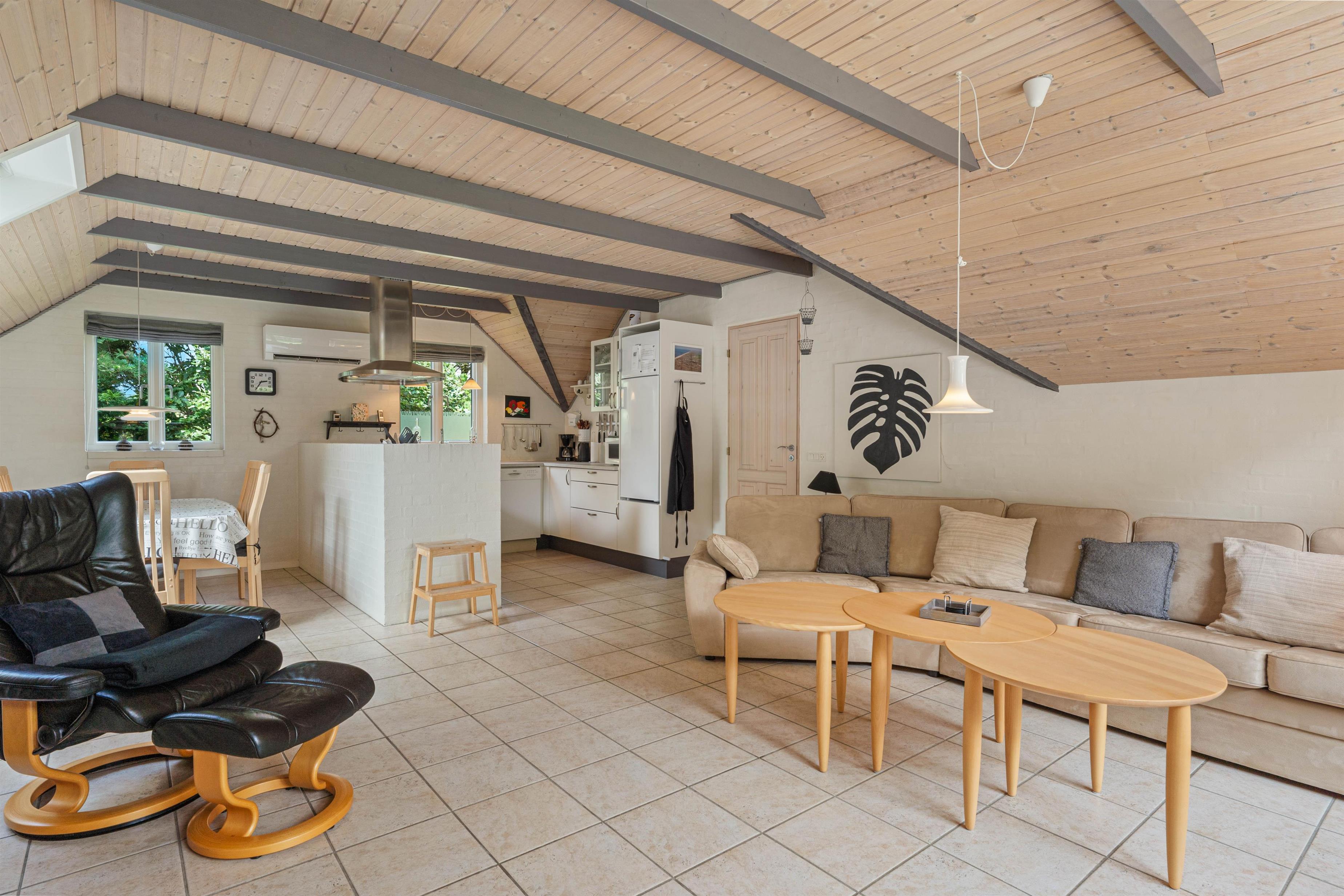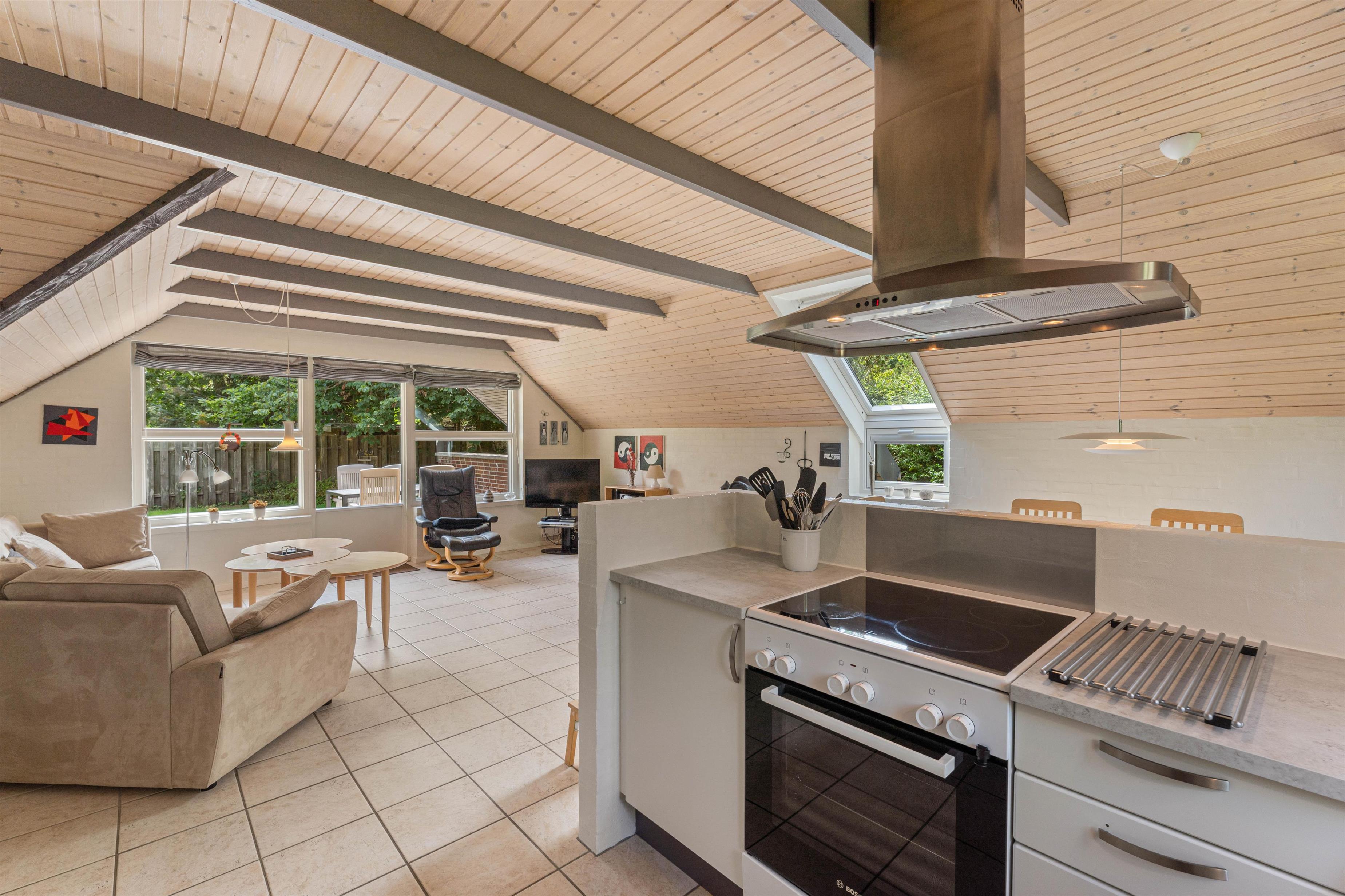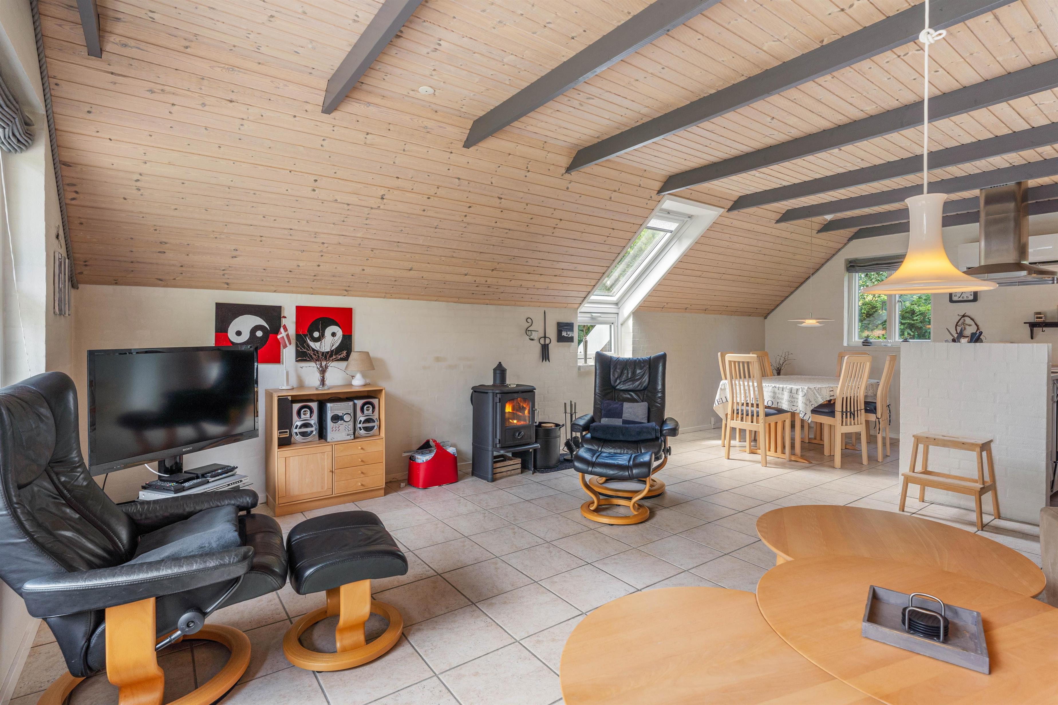 Husets hjerte er det åbne køkkenalrum med stuen i forlængelse, og her vil der med garanti blive skabt masser af nye, gode ferieminder. Køkkenet er veludstyret med opvaskemaskine, og den klassiske brændeovn står klar til at varme jer på de kolde feriedage.