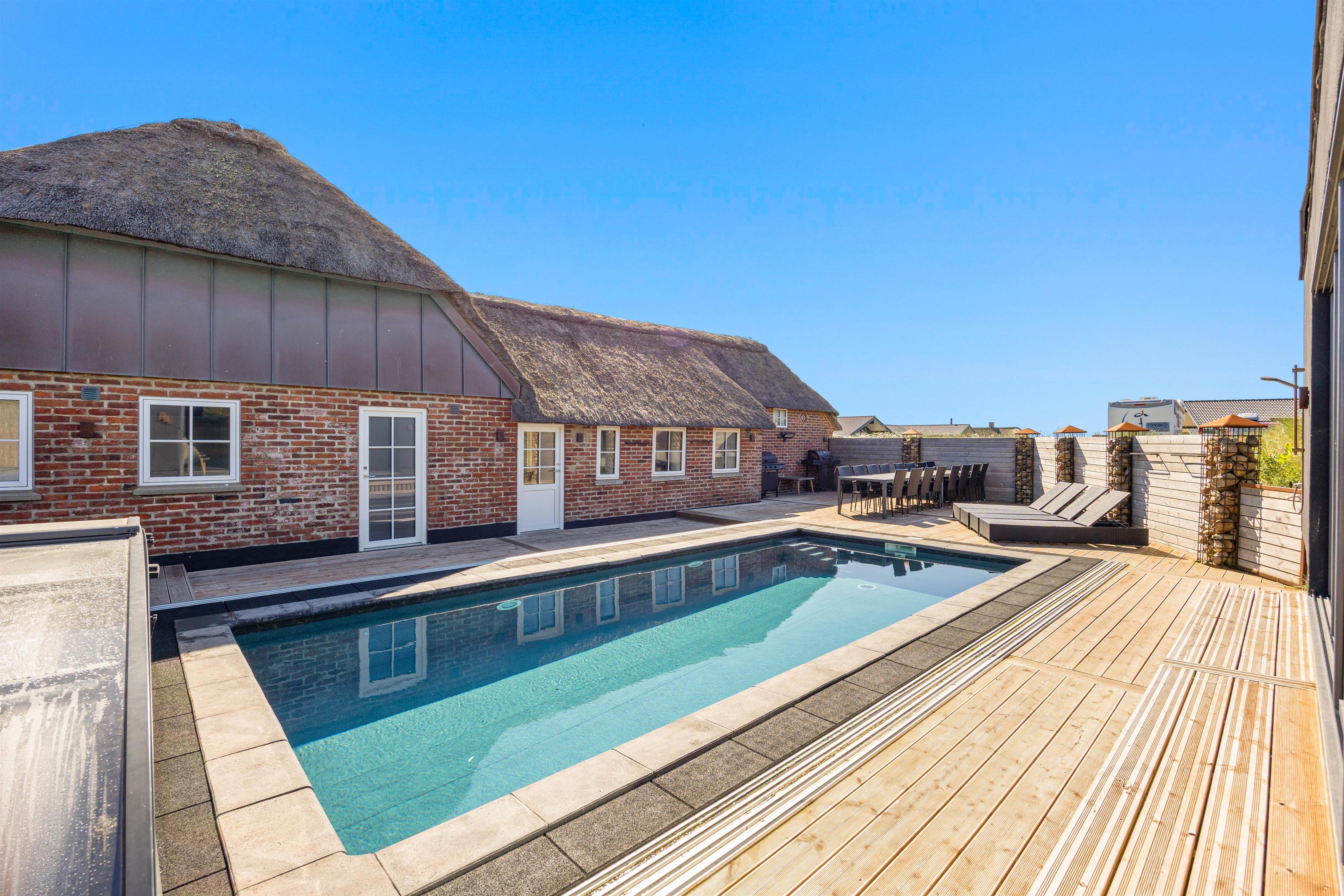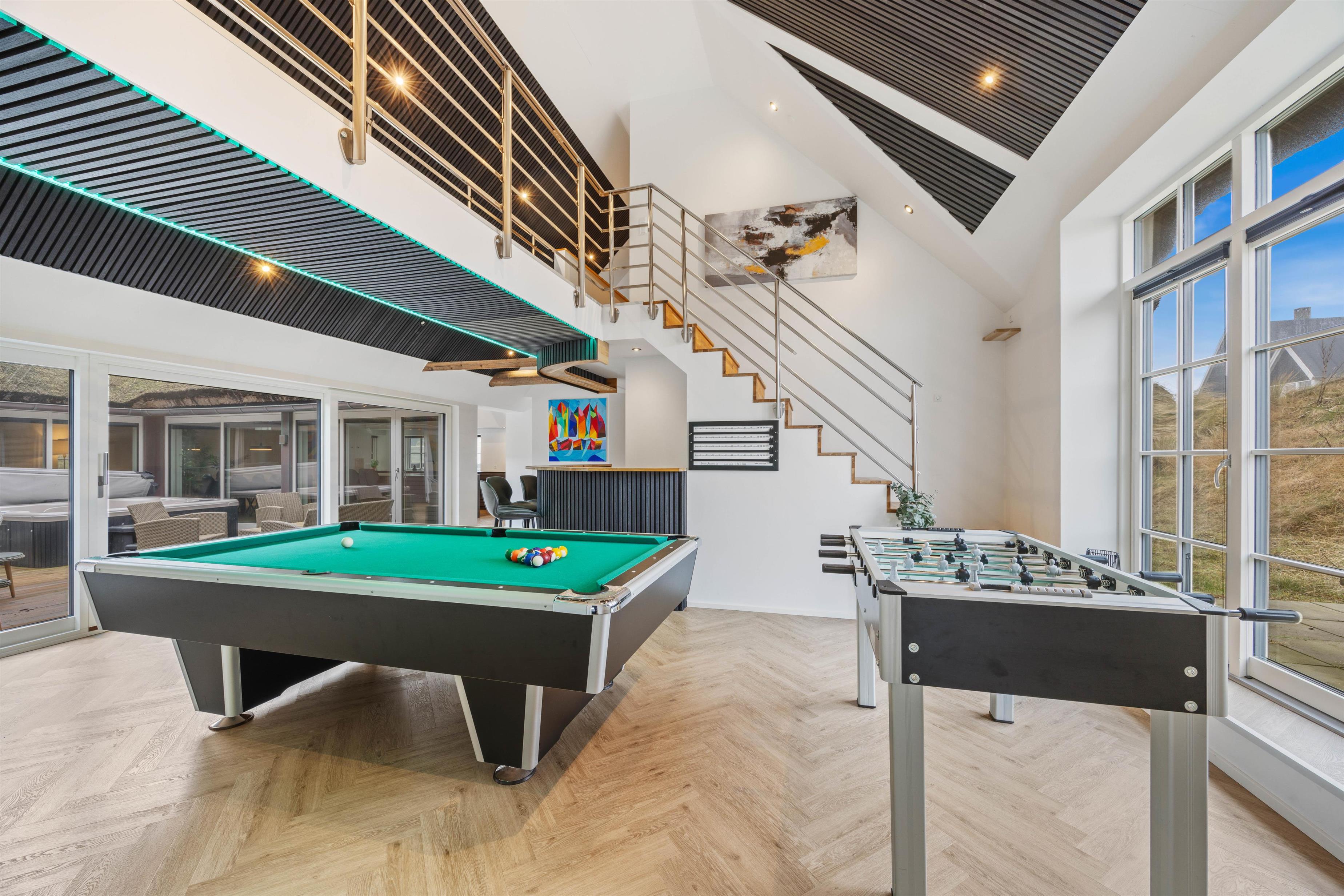 Dette sommerhus i Søndervig er et sandt aktivitetshus, hvor I kan nyde timevis af underholdning. Hop en tur i den opvarmede swimmingpool på 24 m2, og brug en masse aktive timer her. For ekstra aktivitet, er der her mulighed for at benytte sig af svømmetræneren, der er ideel til både store og små vandhunde. For de spil glade sjæle er der desuden mulighed for at tage et spil poolbillard eller bordtennis.