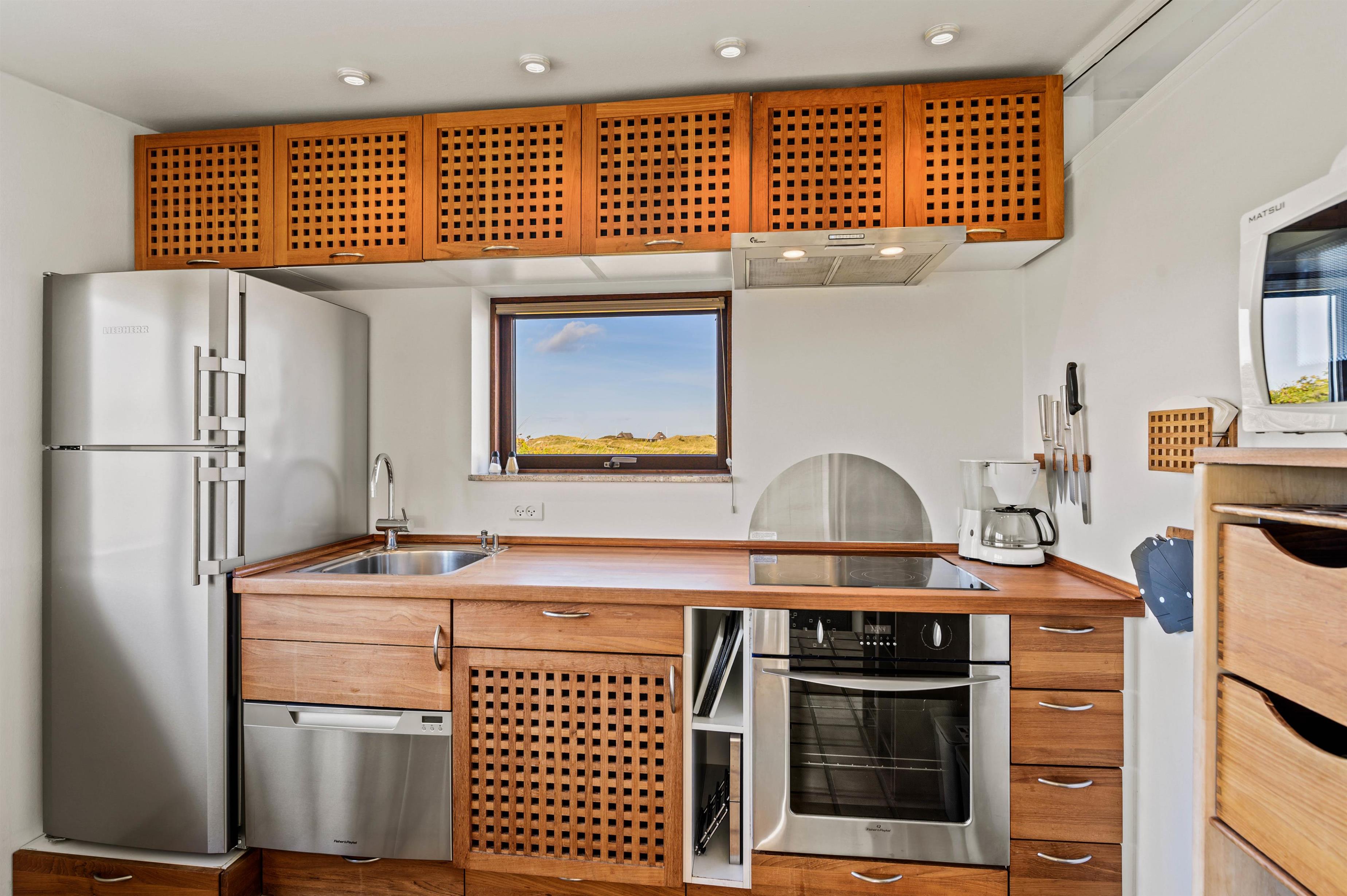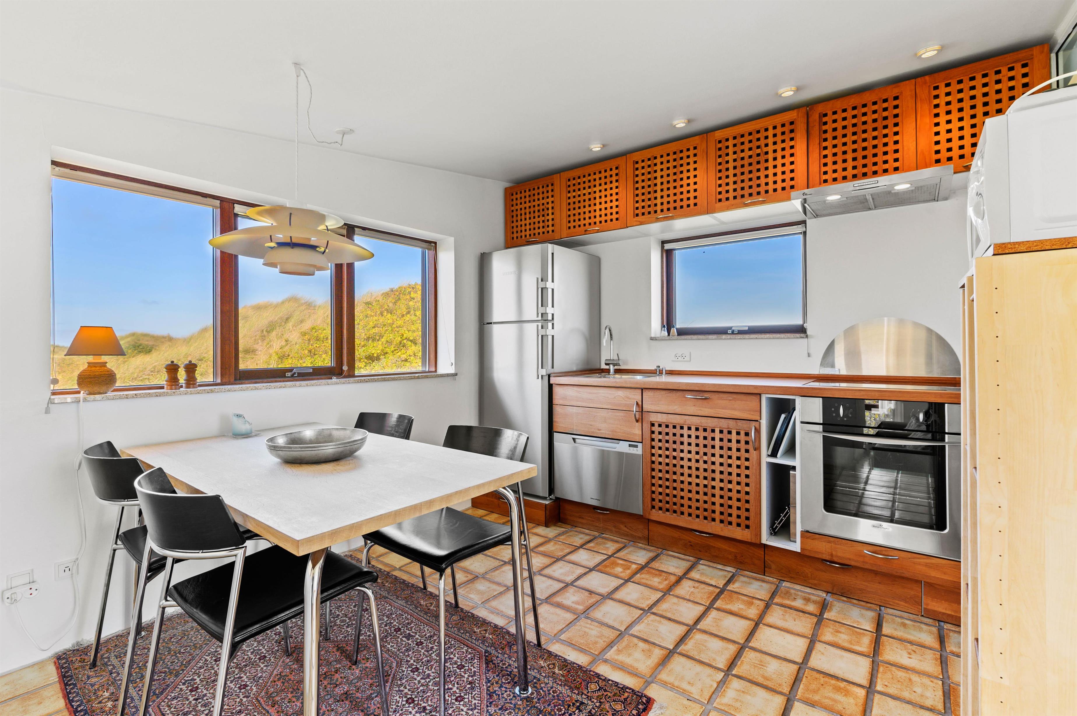 Når I træder ind i sommerhusets hyggelige køkken og stue, vil I blive mødt af den mest utrolige udsigt over det smukke klitlandskab. Uanset hvilket vindue I kigger ud af, vil I have mulighed for at se mod enten hav eller fjord. Derudover rummer sommerhuset en skøn brændeovn, hvor I kan varme jer på de kolde feriedage.