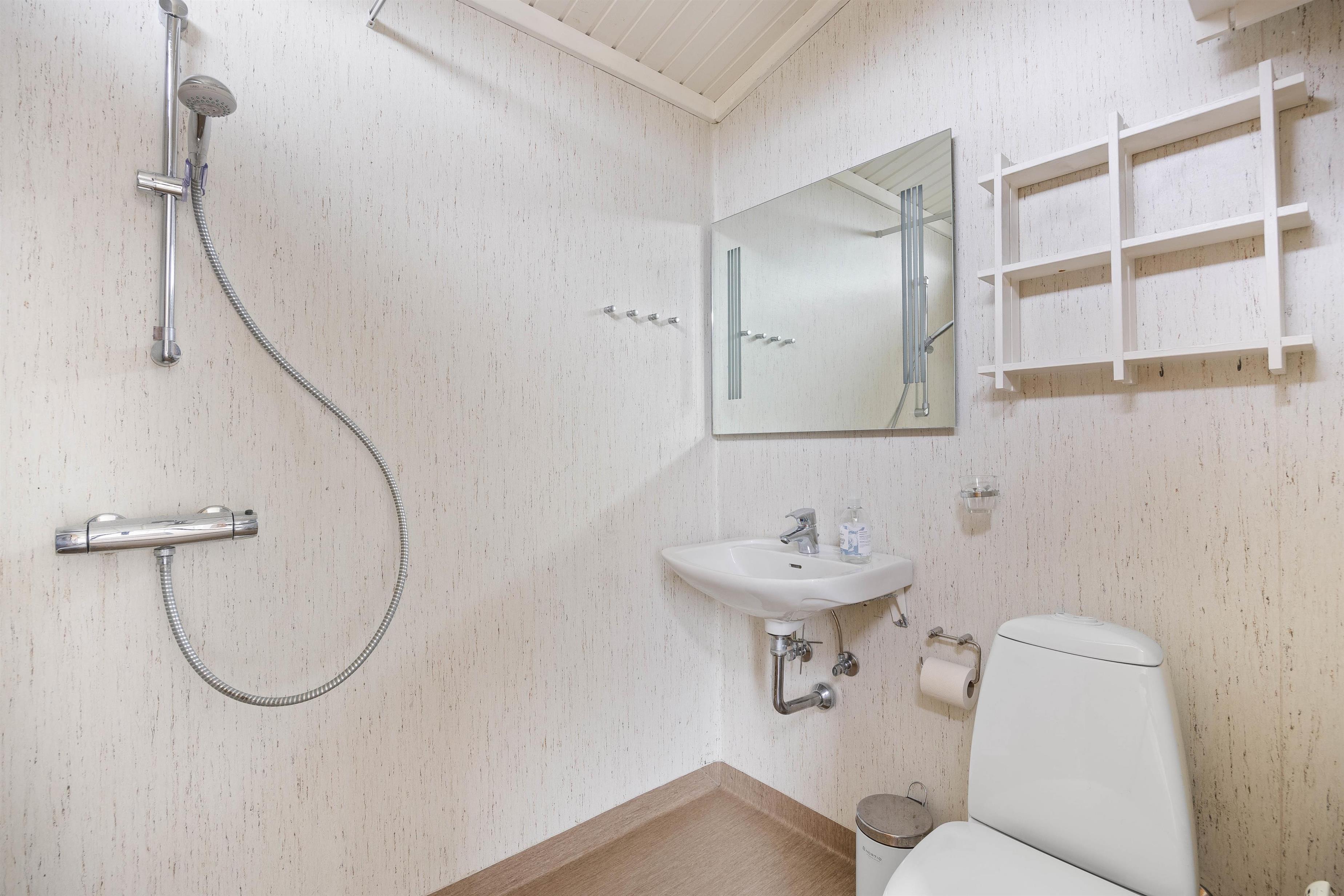 Den røde tråd går igen igennem hele huset. Hele sommerhuset er med loft til kip, hvilket giver en dejlig rumfornemmelse og samtidig giver de hvide trælofter et dejligt lyst indtryk, der er med til at I kommer i den helt rigtige feriestemning.