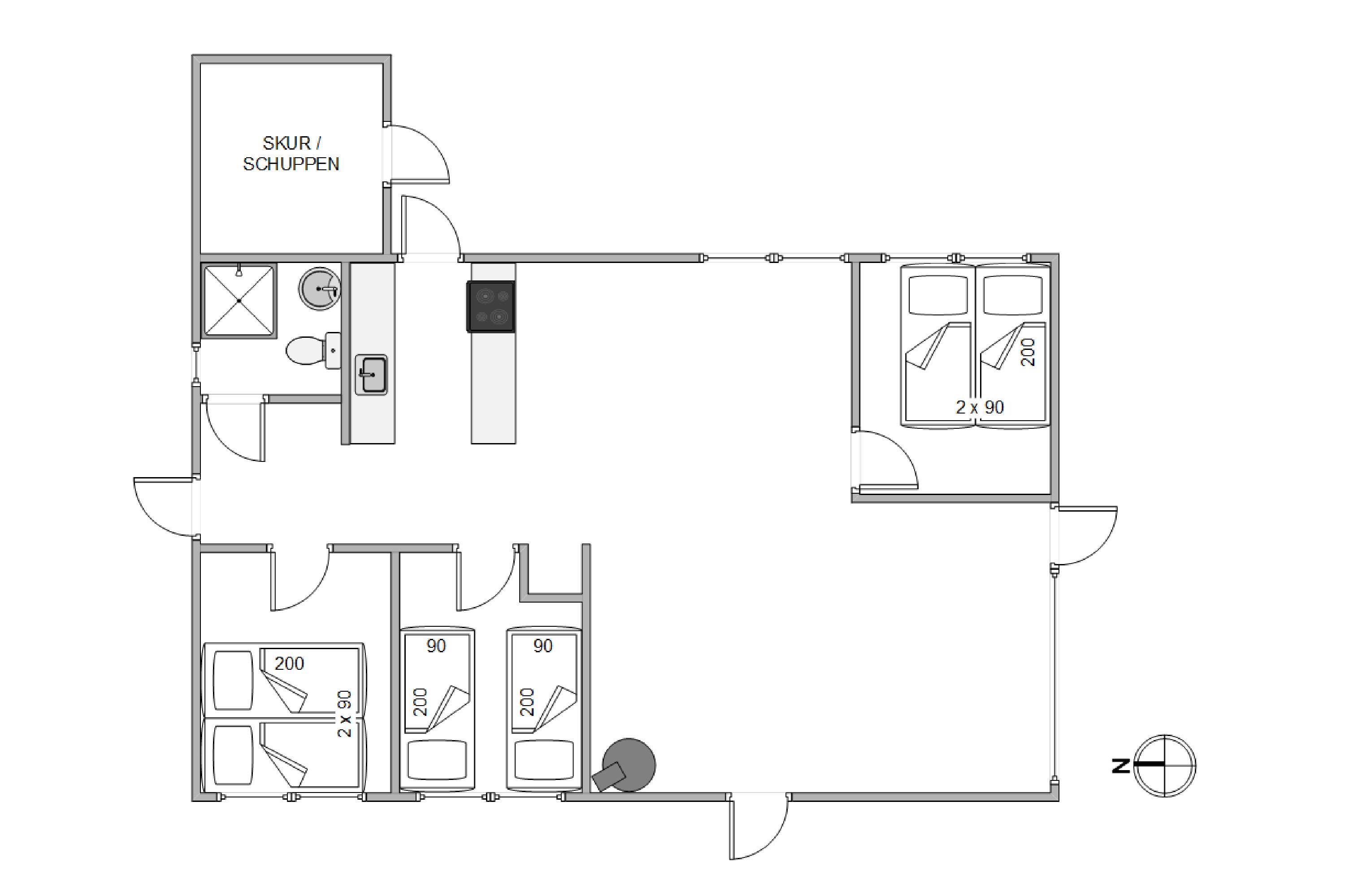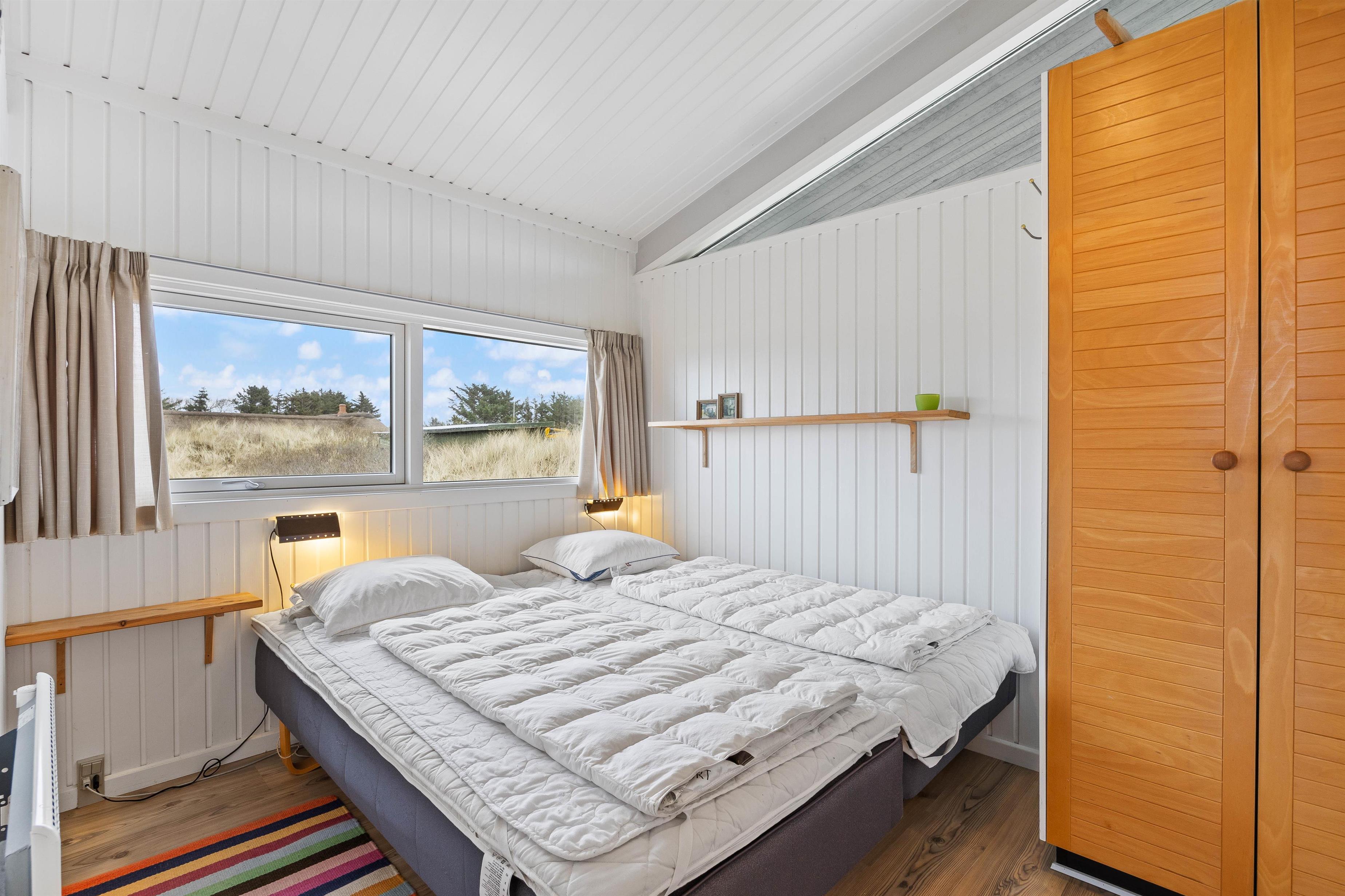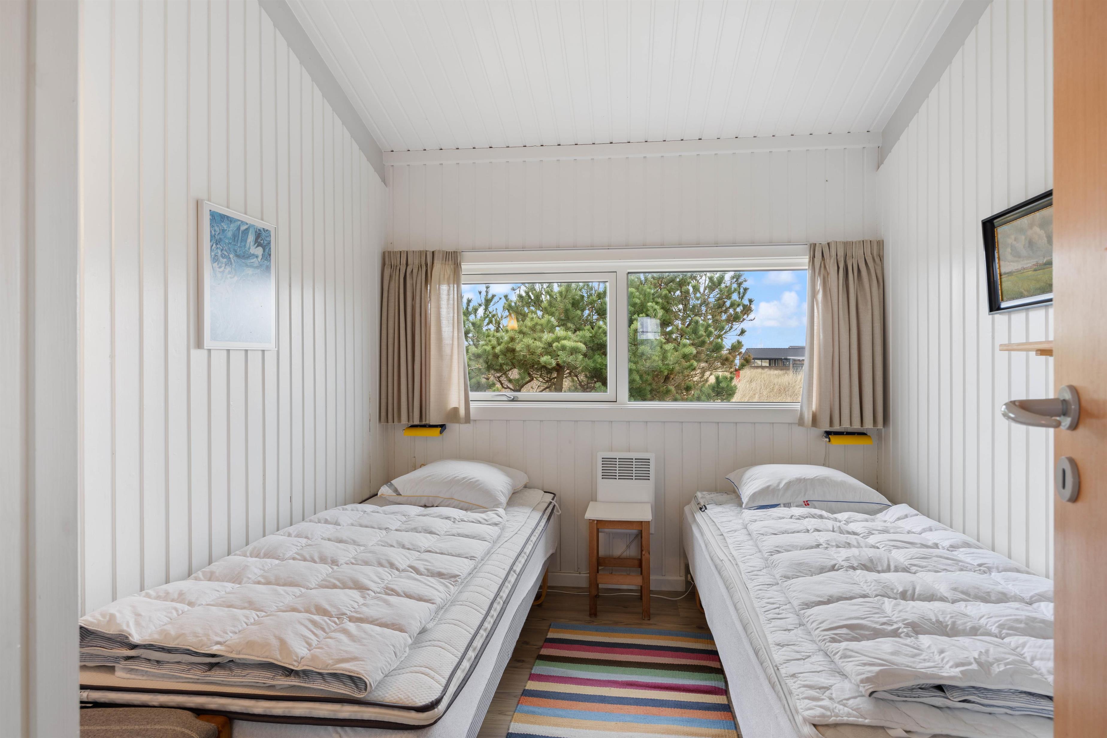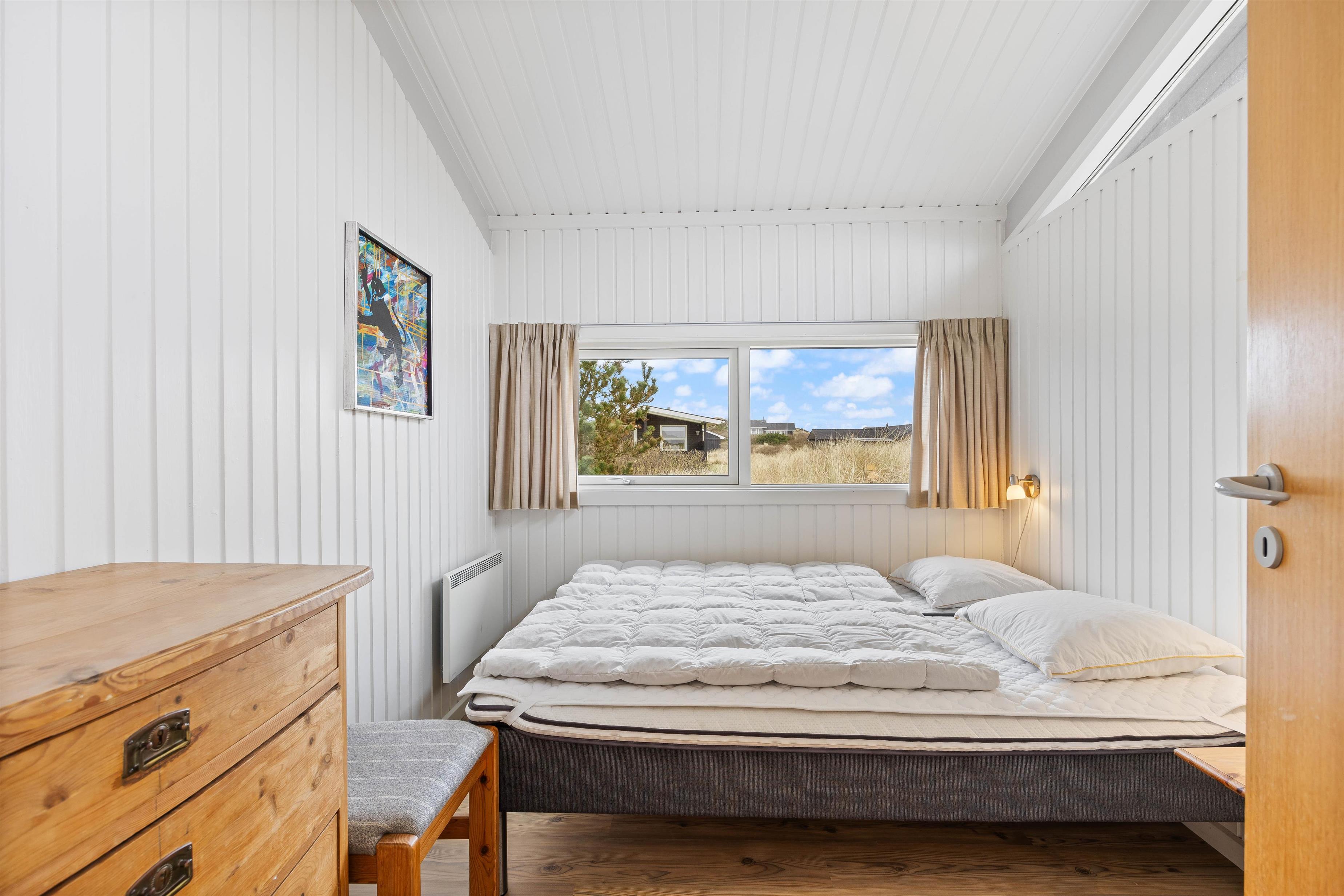 Feriehuset råder over tre soverum og med plads op til 6 personer – Hvor to af soveværelser er indrettet med dobbeltseng og det sidste værelse er udstyret med to enkeltsenge. Sommerhuset er derfor oplagt til børnefamilien, en gruppe venner der ønsker at holde ferie sammen, hvor hygge og nærvær har mulighed for at være i fokus.