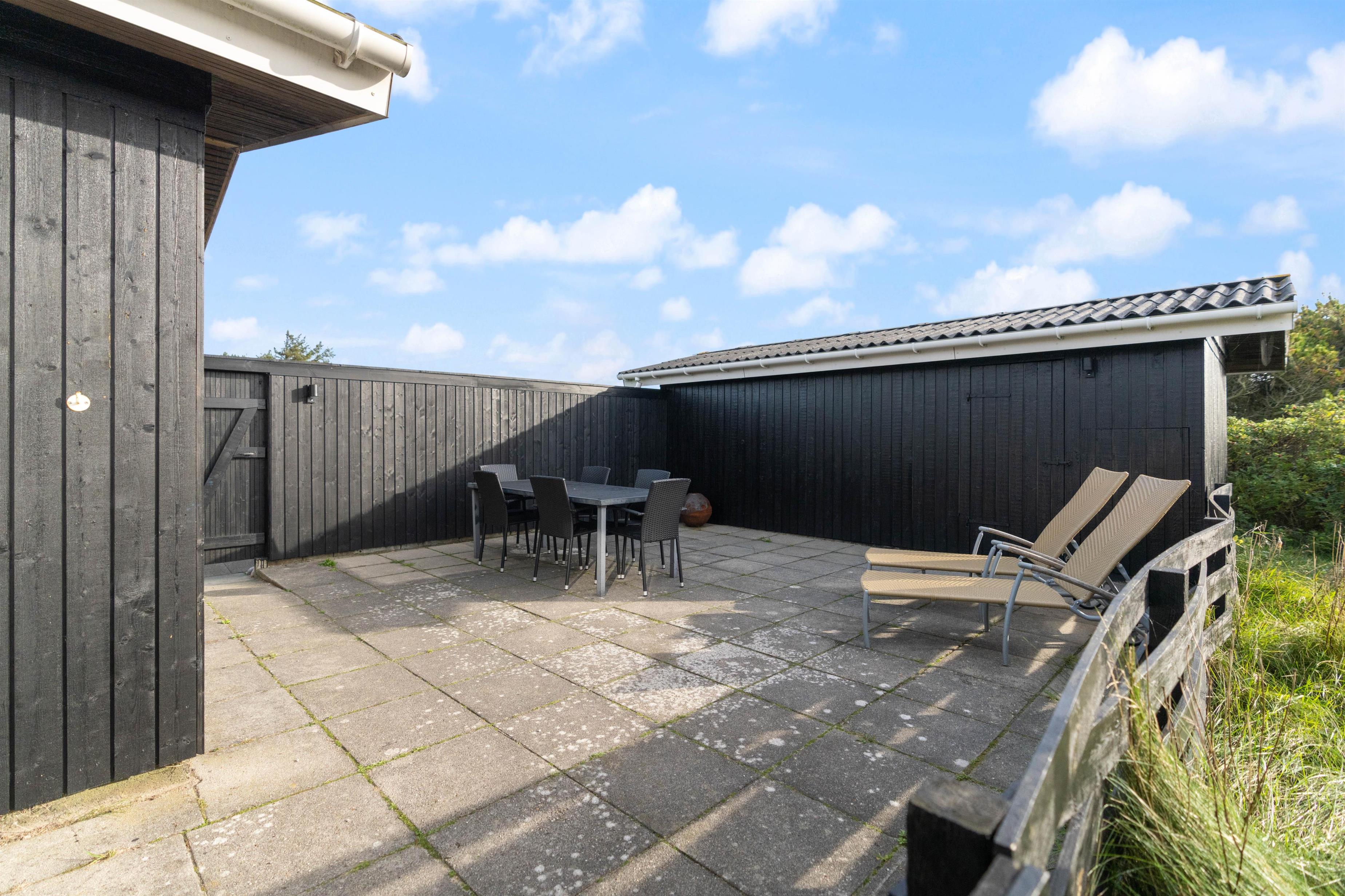 Sommerhuset er placeret på en dejlig naturgrund kun 750 meter fra Vesterhavet. Rundt om huset løber en stor terrasse, således I har flere forskellige områder at slå jer ned i. Det giver jer en enestående mulighed for at følge solens stråler i løbet af dagen. Og der er selvfølgelig både grill og havemøbler til rådighed, så I er sikret både solbadning og grillhygge.