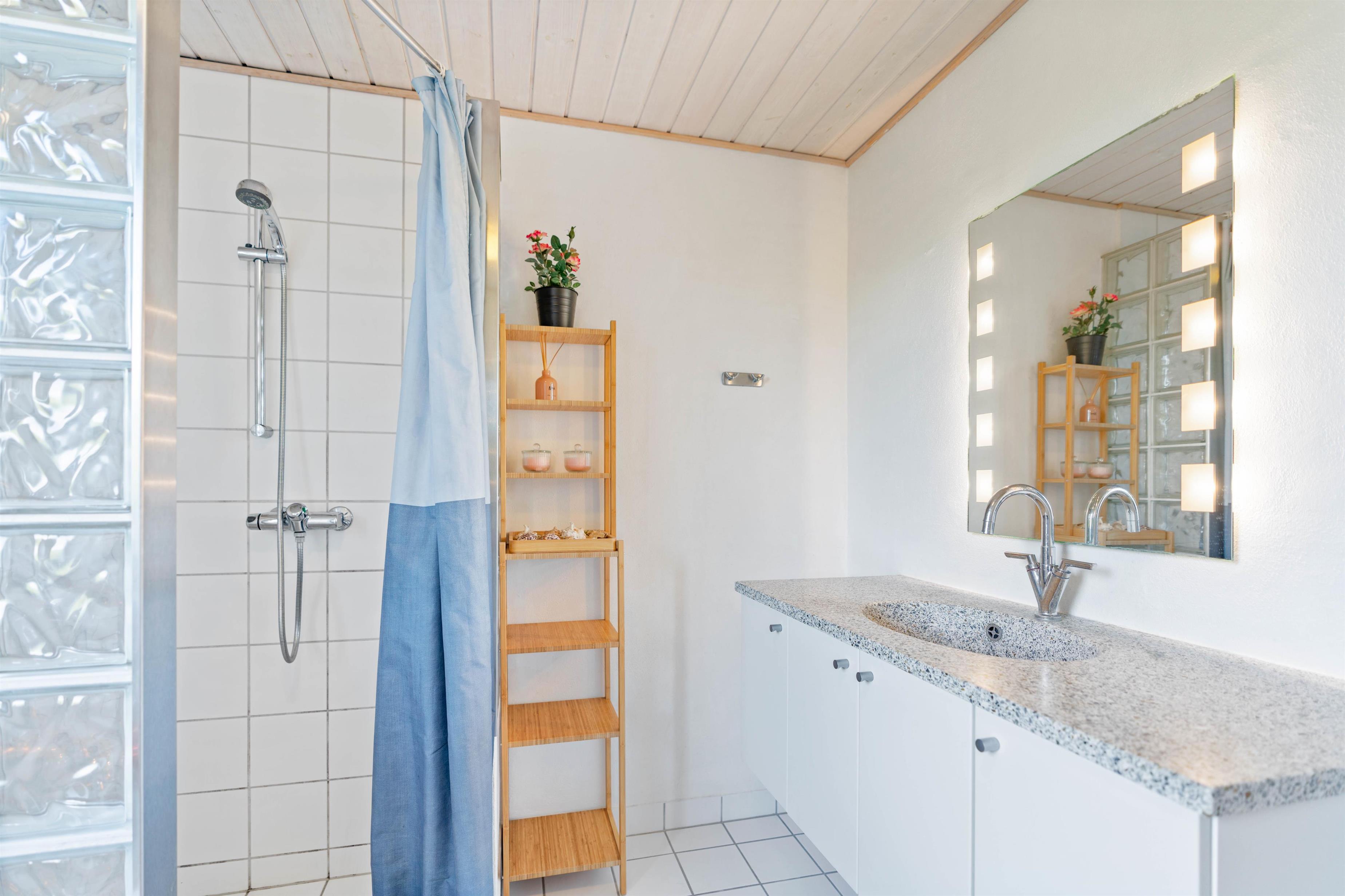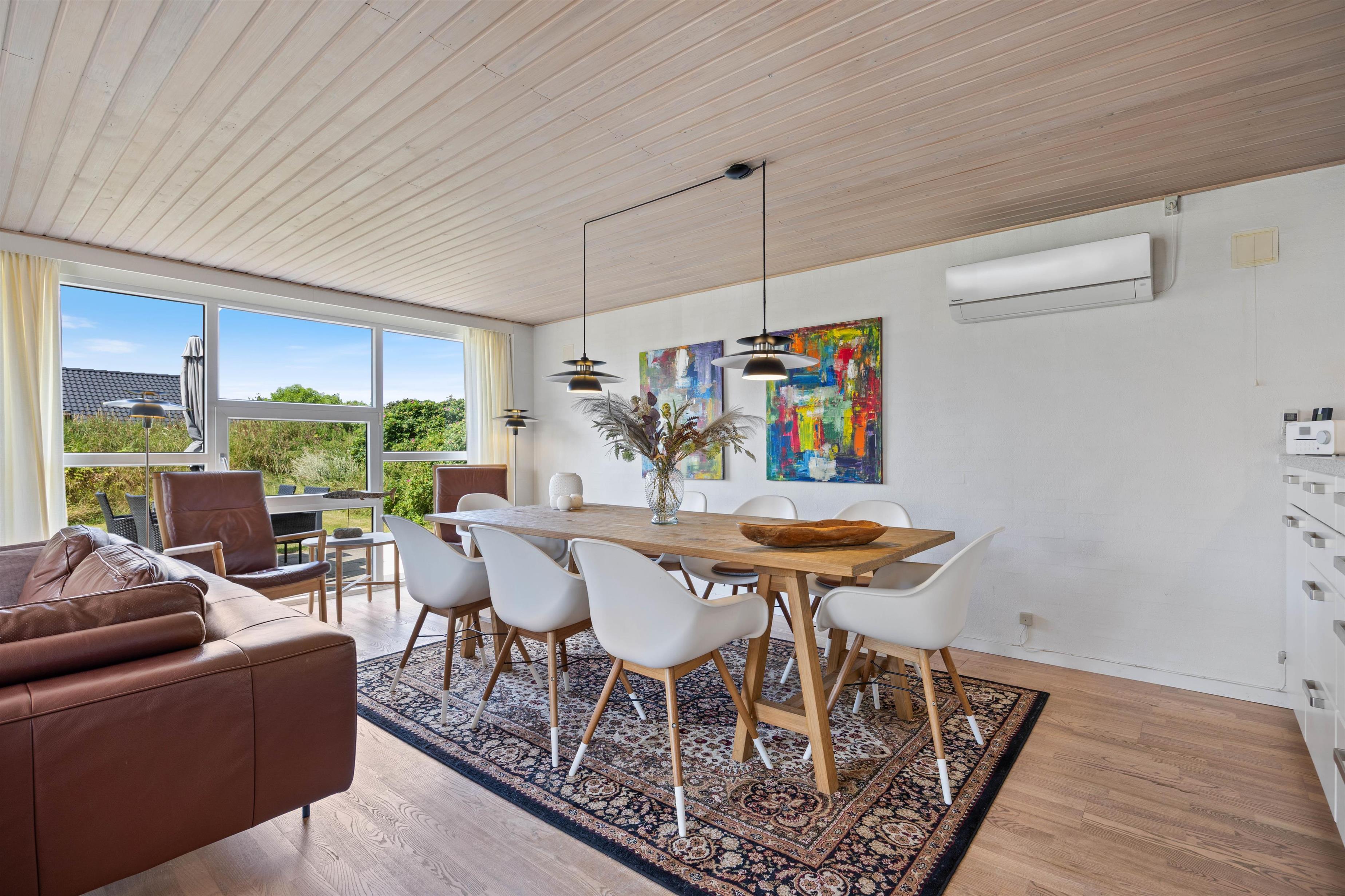 Sommerhuset er et godt valg for familien, der ikke vil gå på kompromis med komfort og gode møbler. Feriehuset er meget rummeligt og indrettet til at gøre din ferie så komfortabel som mulig. Her finder du derfor både vaskemaskine og tørretumbler samt gulvevarme på badeværelset. Indretningen i huset er lys og imødekommende og med gode, gedigne møbler, samtidig med at farverige malerier skaber et spændende modspil til de lyse vægge og lofter. Det åbne køkken er praktisk indrettet. Her er der plads til at kreere god mad, som familien kan samles om omkring spisebordet.