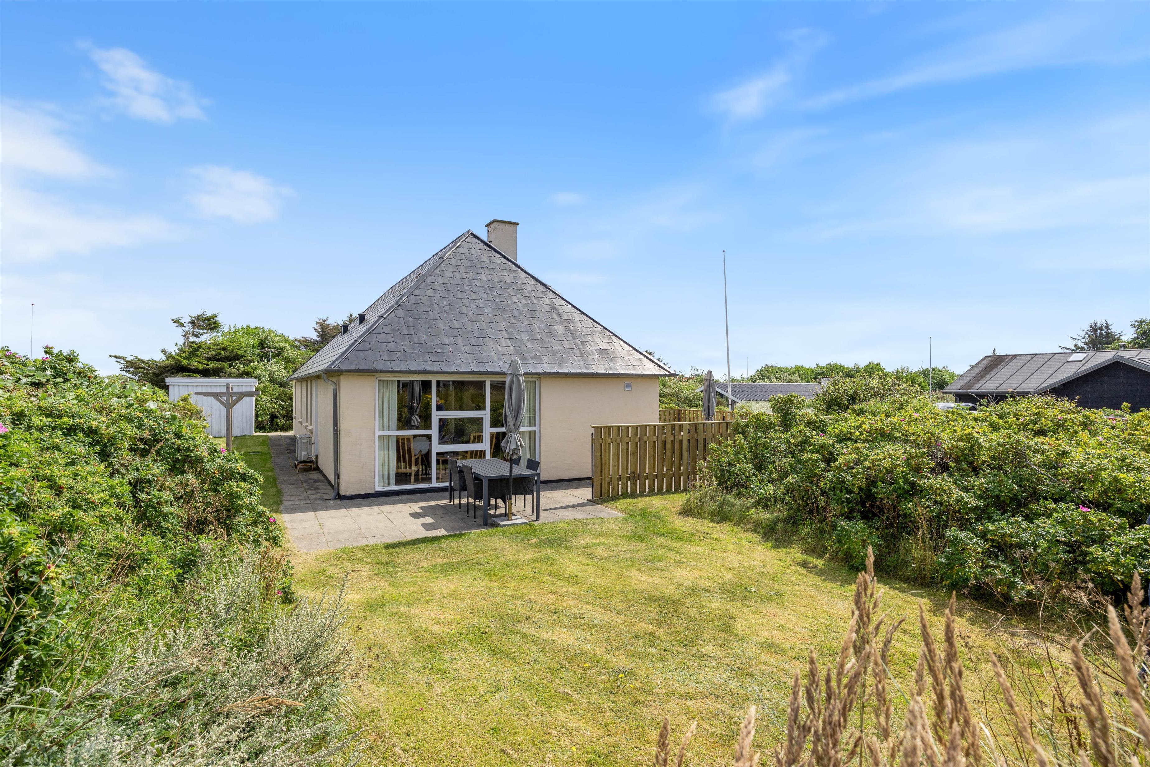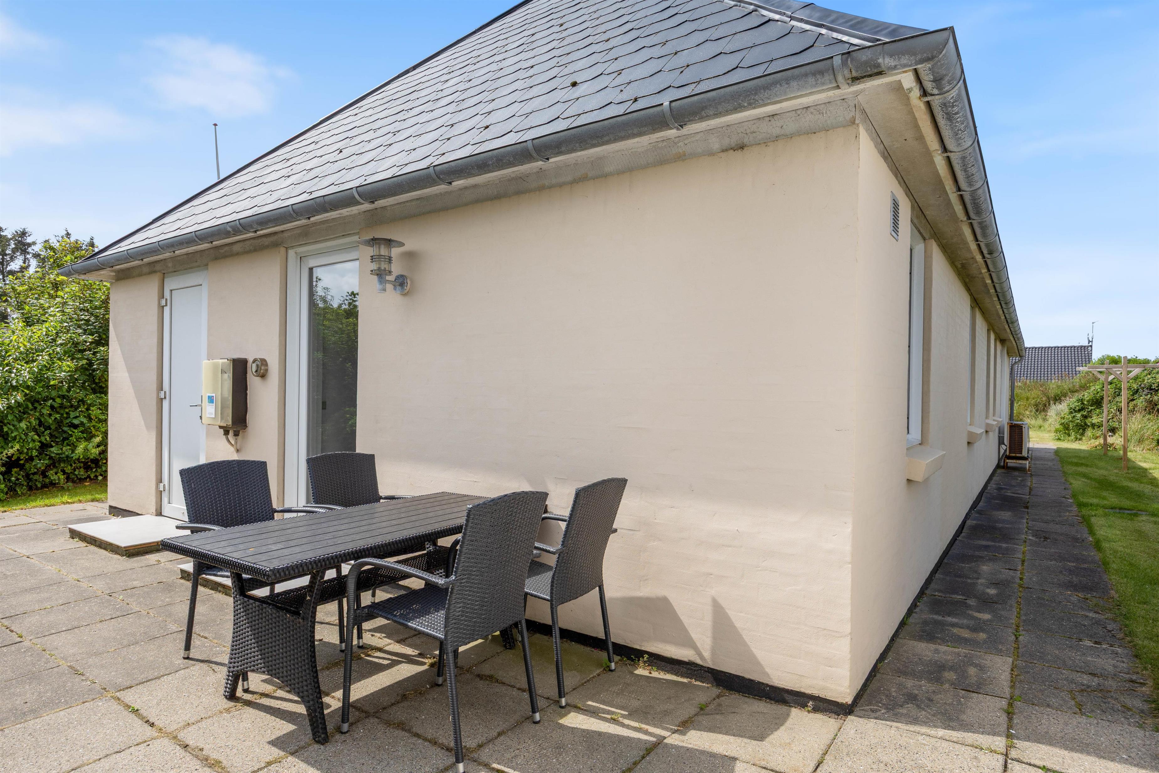 Fra stuen er der direkte adgang til husets terrasse. Her har man med et fint stakit og gode møbler formået at skabe en herlig læfyldt udeoase, som inviterer til afslapning på langs og hygge på lune sommeraftener i selskab med familien. Huset ligger på en flot naturgrund, let omkranset af buske og små træer. Så der er masser at gå på opdagelse i for børnene. Huset tillader også, at I kan tage jeres hund med, dog maks. én hund, hvilket gør det nemmere at planlægge ferien for hele familien, inklusiv jeres firbenede ven.