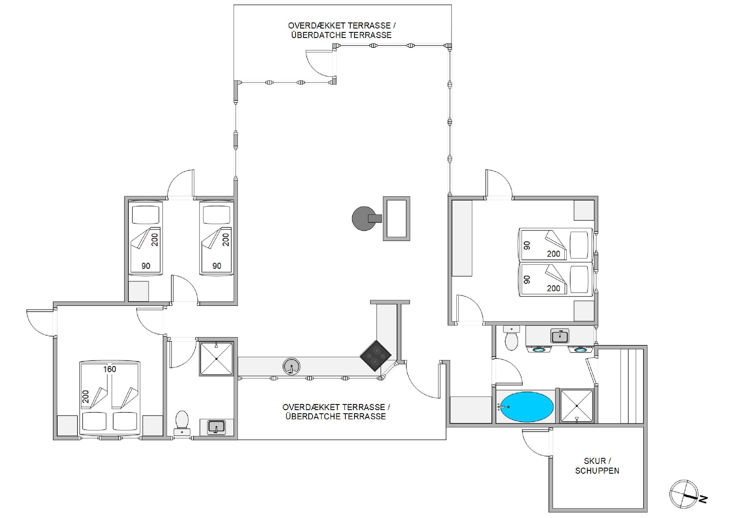 Feriehuset byder på 103 m² og 3 soverum, hvoraf 2 er udstyret med dobbeltsenge og det sidste med enkeltsenge. Ydermere slipper I for at stå i kø om morgenen, da feriehuset også byder på 2 badeværelser med gulvvarme, så I ikke får kolde fødder. Det rummelige køkken er udstyret med opvaskemaskine, og på det ene badeværelse finder I vaskemaskine samt tørretumbler, der klarer de praktiske gøremål for jer.