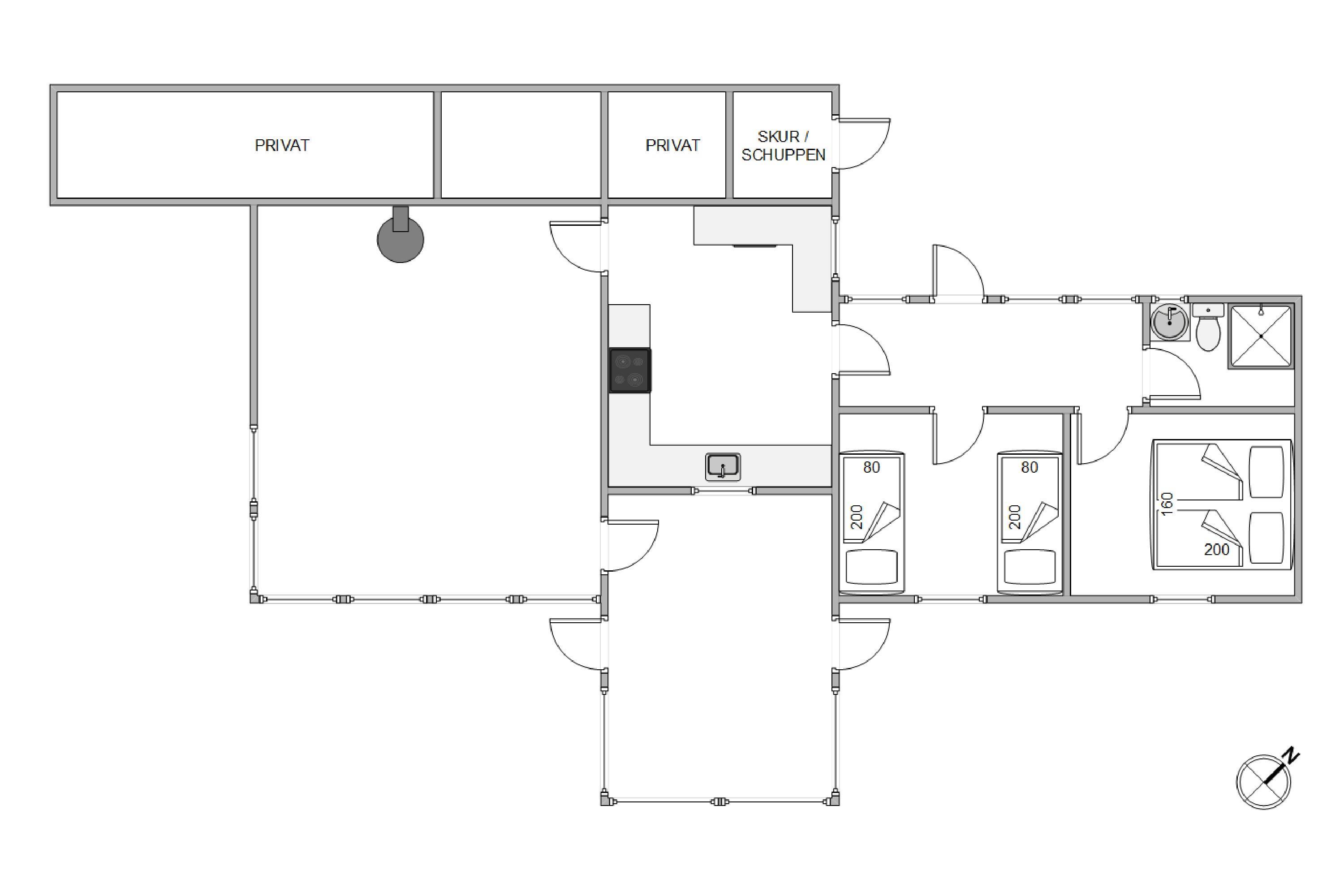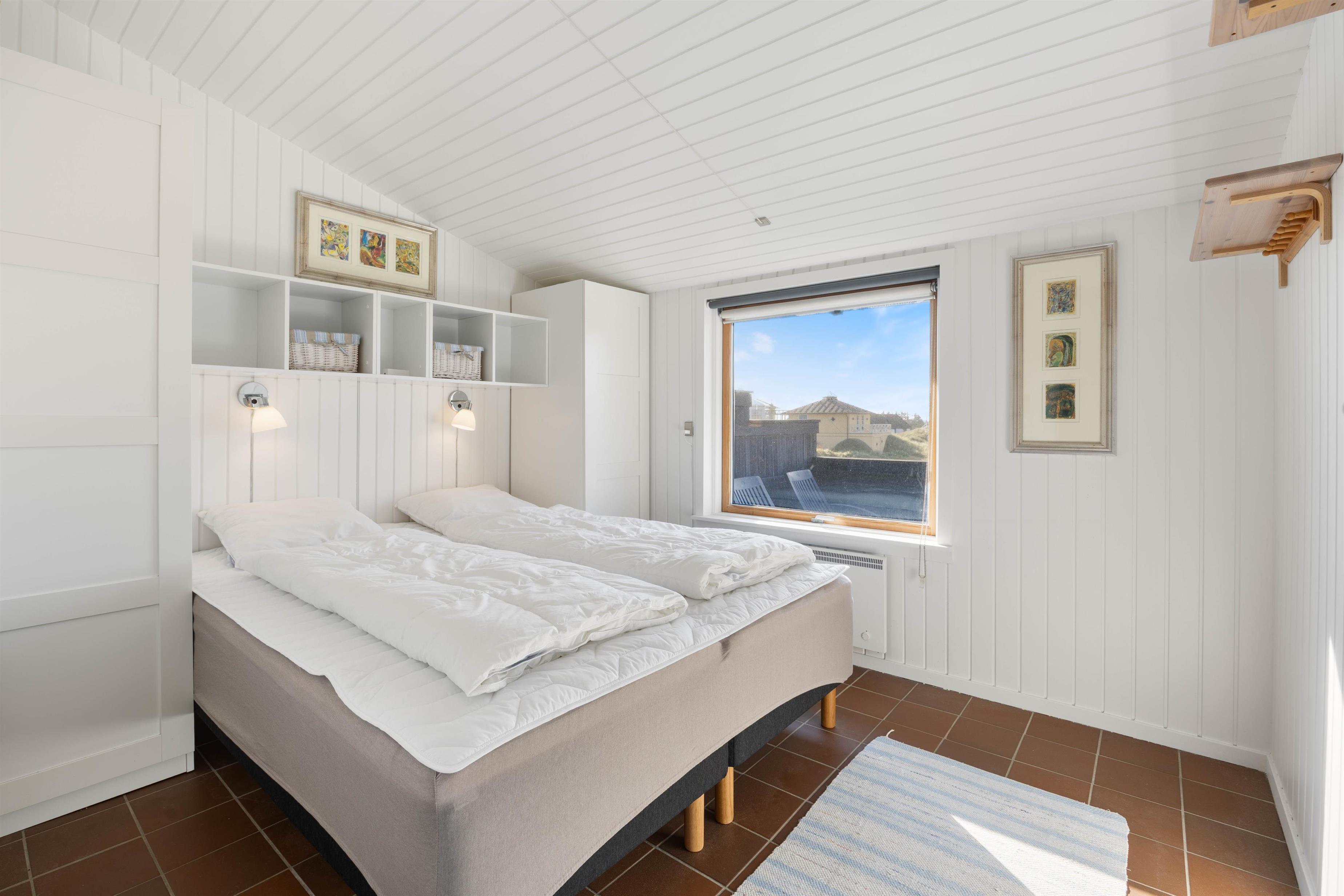 I feriehuset er der 2 soveværelser. I det ene værelse er der en dobbeltseng og i det andet soveværelse 2 enkeltsenge. Ved siden af soveværelserne finder I feriehusets badeværelse.