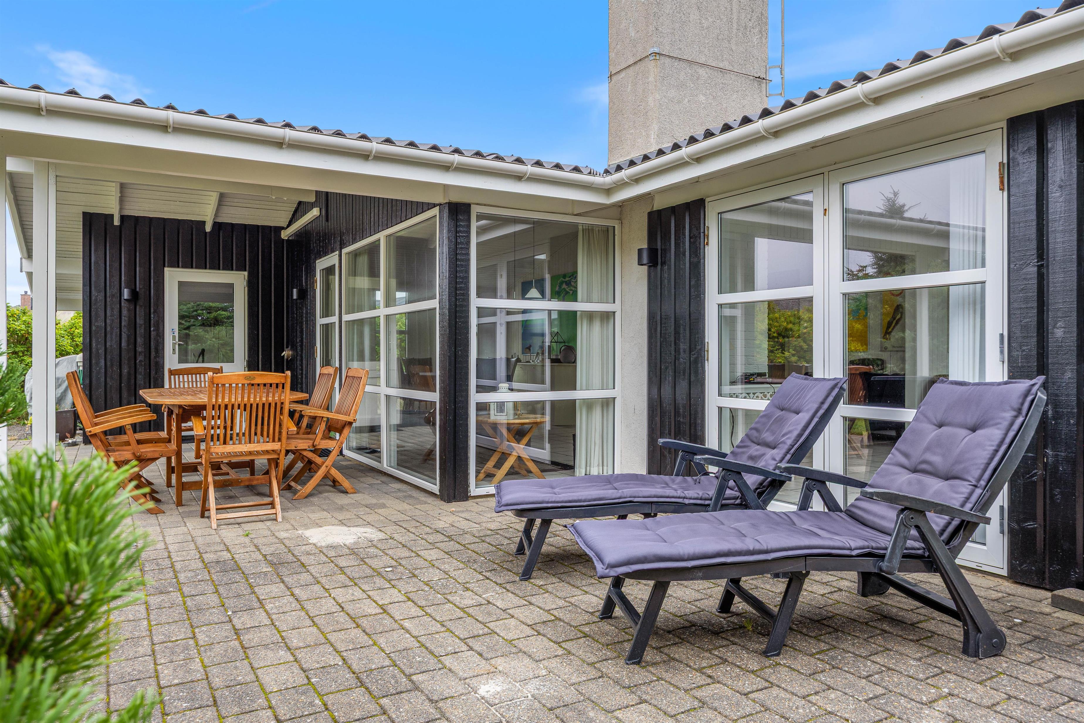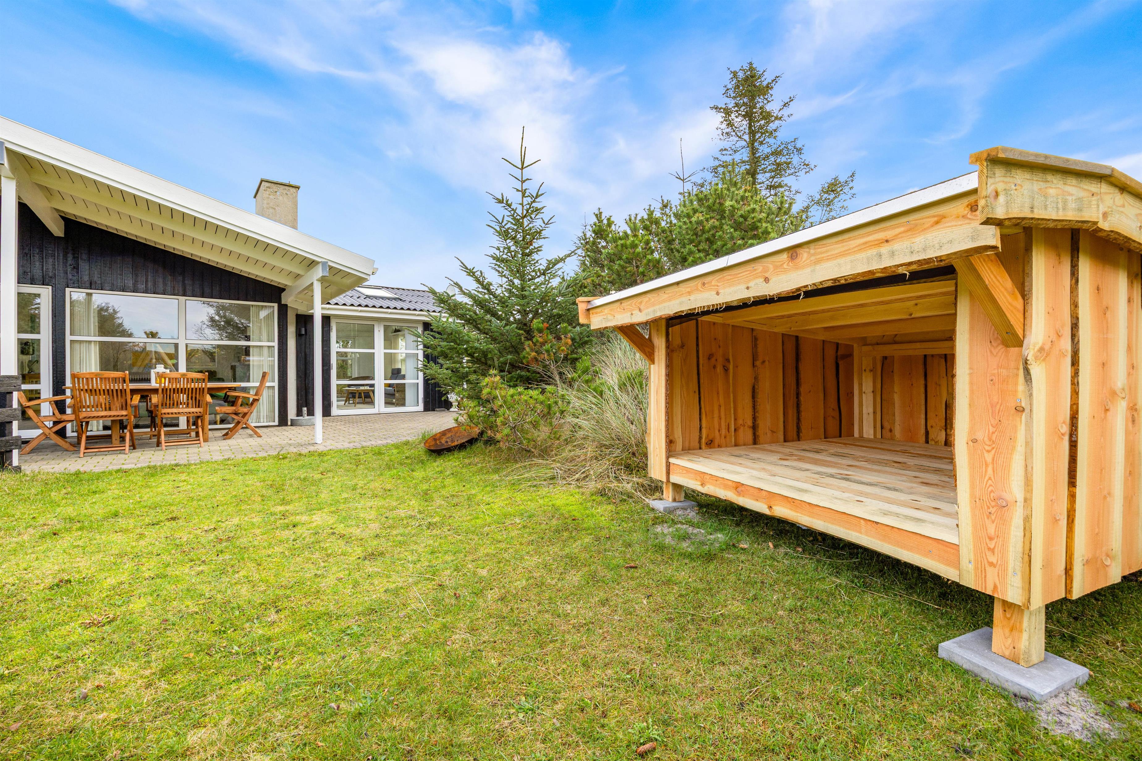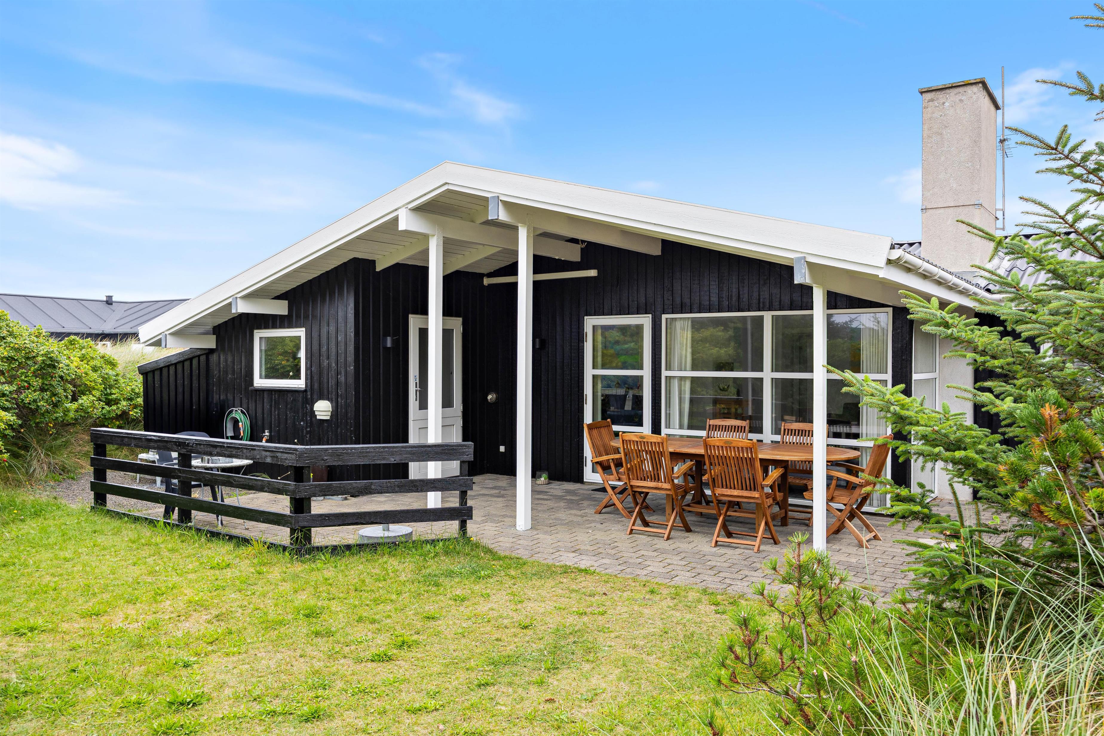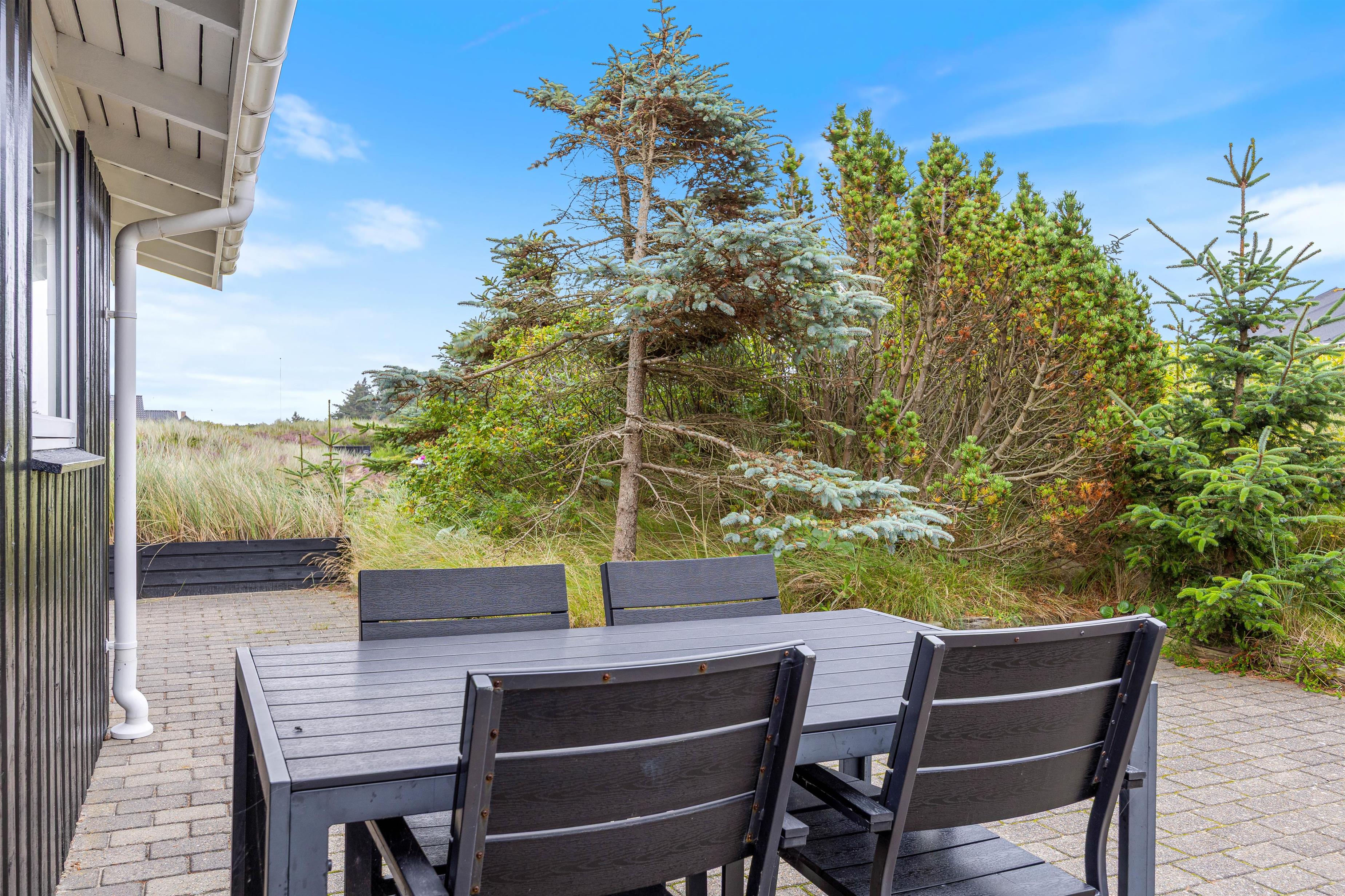 På sommerhusets syd- og vestside løber en åben terrasse, der er delvist overdækket. Her er rig mulighed for at finde et godt spot i solen og nyde de varme solstråler – og vil I hellere sidde i skygge, kan I søge ind under den overdækkede del af terrassen. Både liggestole og havemøbler står til rådighed, så I ikke mangler noget på de varme feriedage.