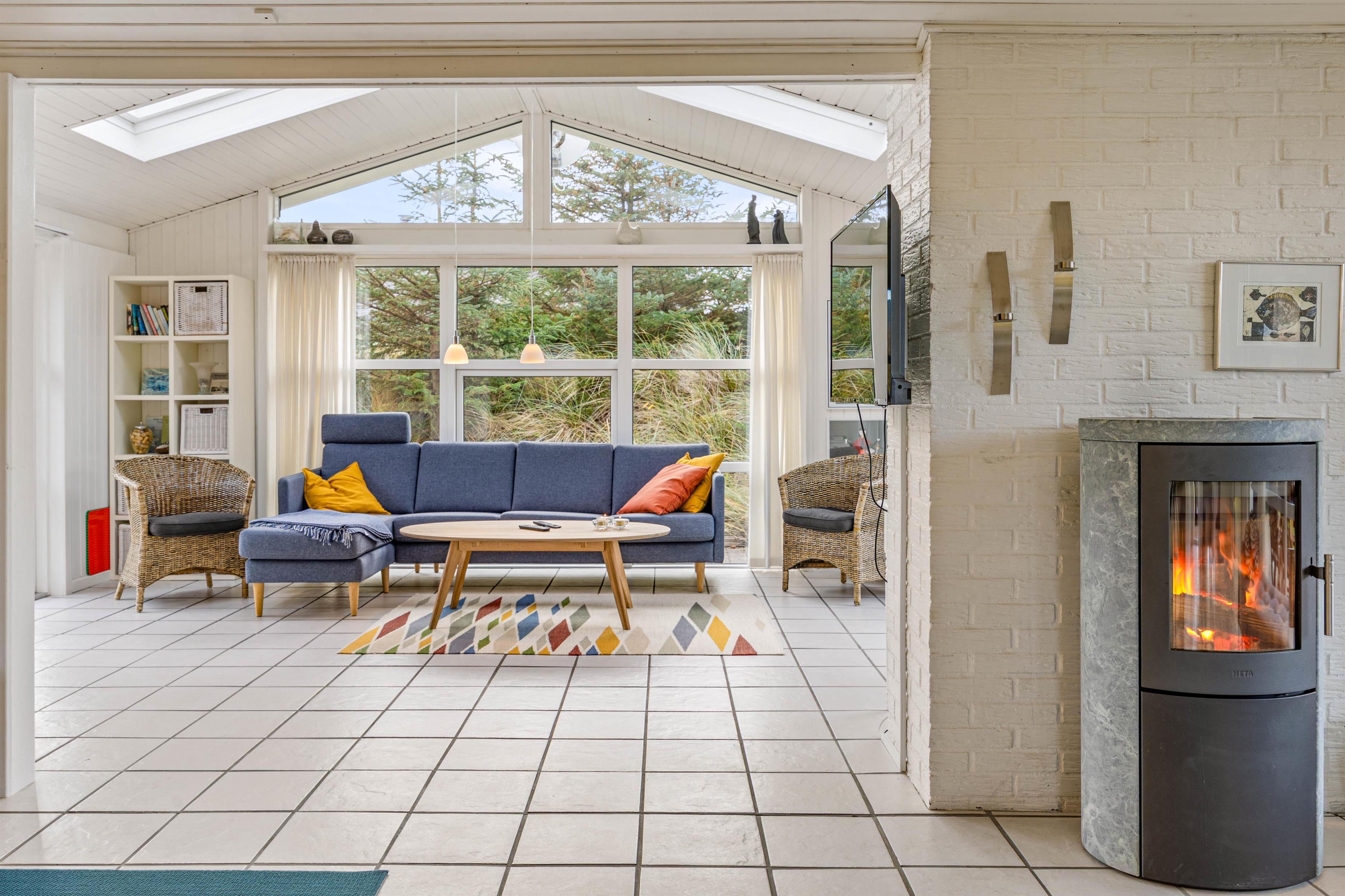 Sommerhuset er stort og rummeligt, og her vil alle 6 feriegæster finde sig godt til rette. Den store opholdsstue danner rammen om mange hyggelige feriestunder sammen for hele familien med god mad, sjove spil og gode film. Komfortable sofaer og lænestole står klar, hvor I rigtig kan læne jer tilbage og nyde ferien. Brændeovnen sætter prikken over i’et for hyggen og feriestemningen.