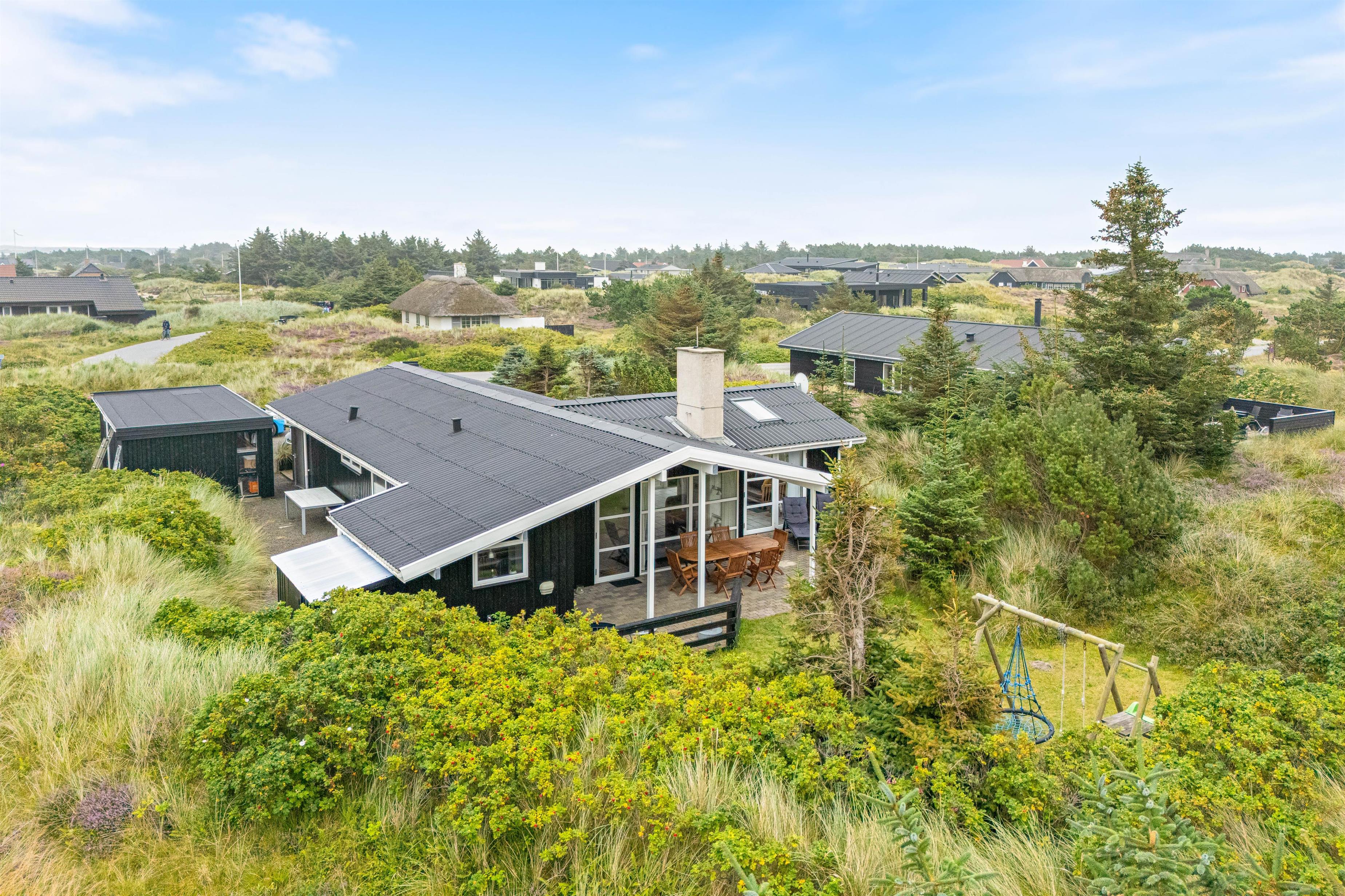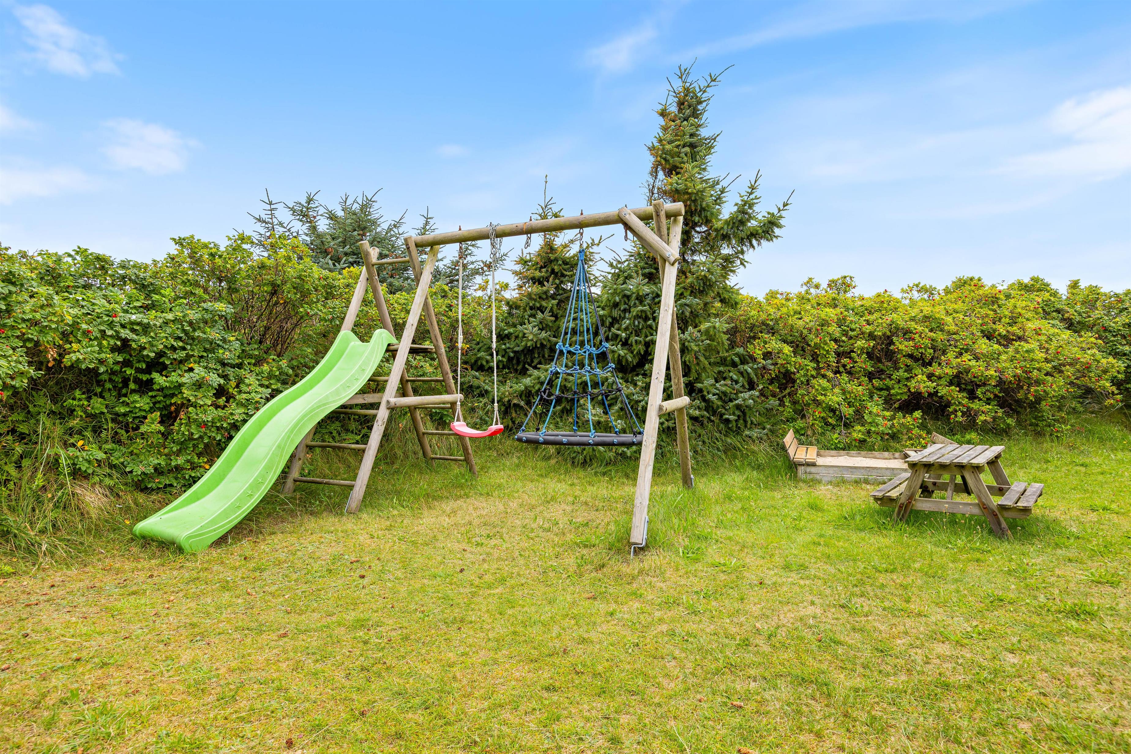 I haven er både sandkasse og gynger klar, hvilket uden tvivl vil glæde feriens yngste gæster. Dagen lang kan der bygges store sandslotte i sandkassen eller gynges for fuld kraft på gyngerne, mens forældrene gør klar til aftenens middag på grillen, som kan nydes på terrassen.
