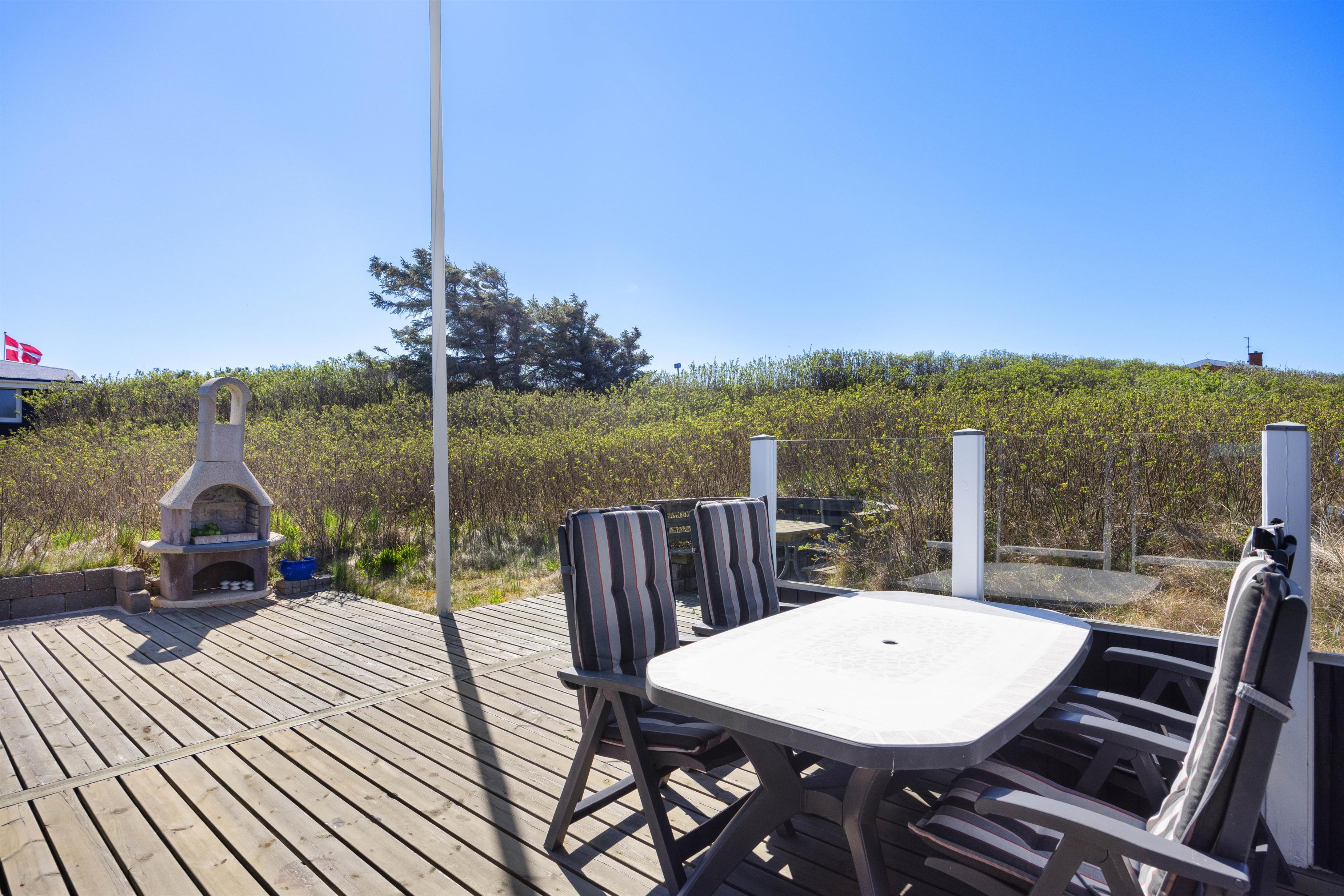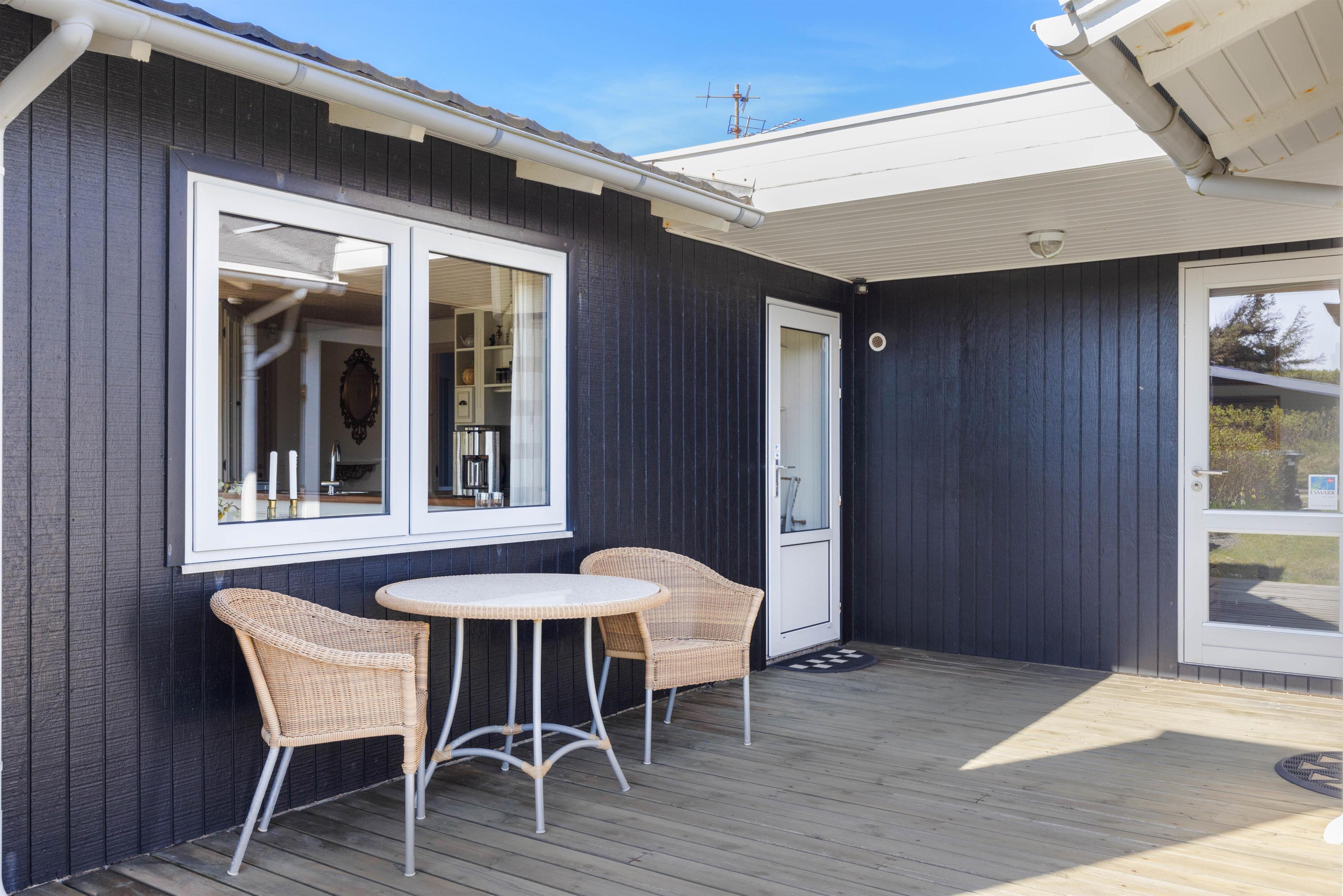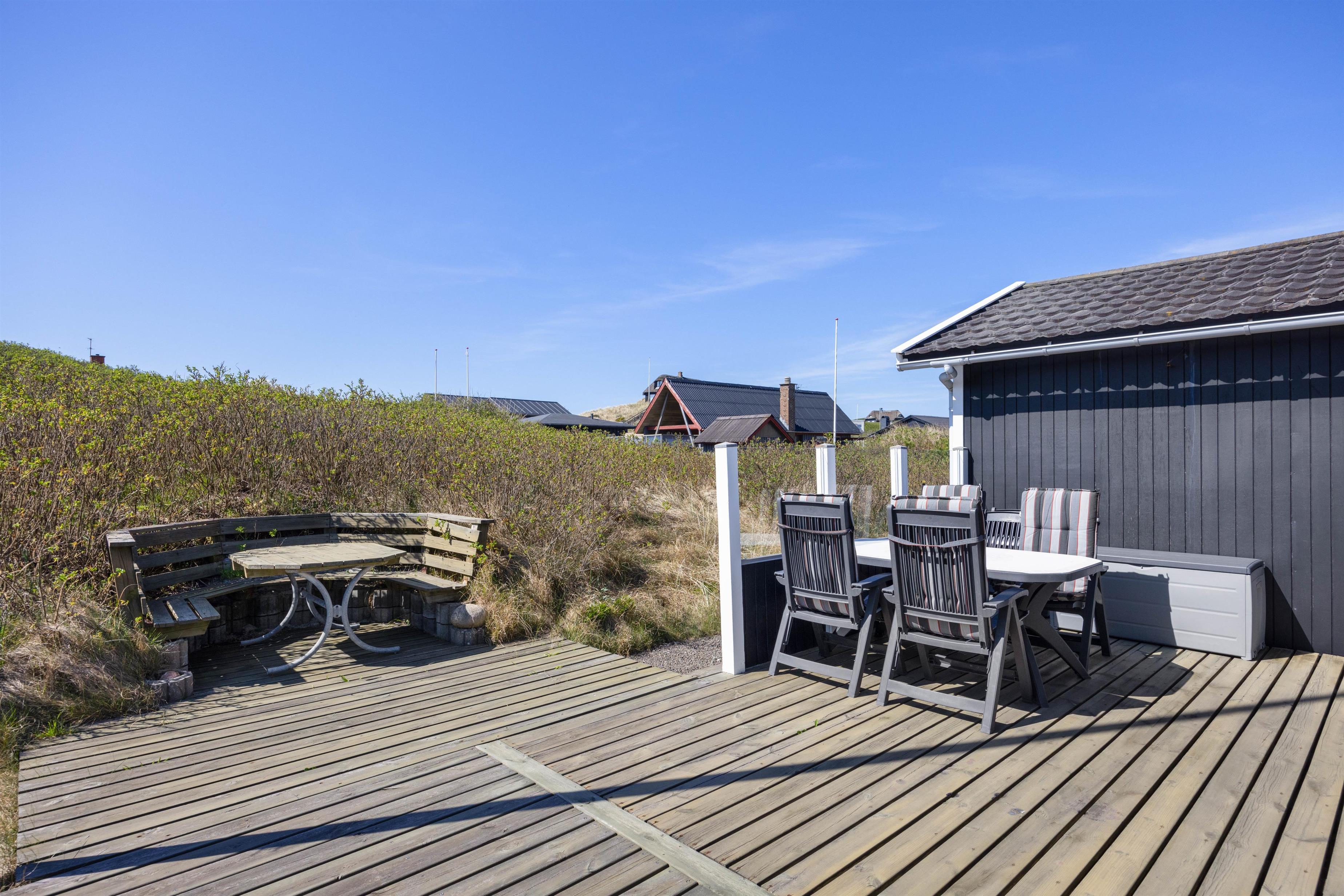 Et af sommerhusets absolutte højdepunkt er uden tvivl den dejlige træterrasse, som er delvist overdækkedt og omgiver huset. Her er det oplagt at tilbringe mange feriestunder sammen og nyde solen og hinandens selskab mens I tilbereder et dejligt måltid mad sammen, eller nyder et godt glas vin. Her er også både grill og havemøbler til rådighed. Til børnene er der en gynge, som helt sikkert vil bidrage med en masse timers sjov.