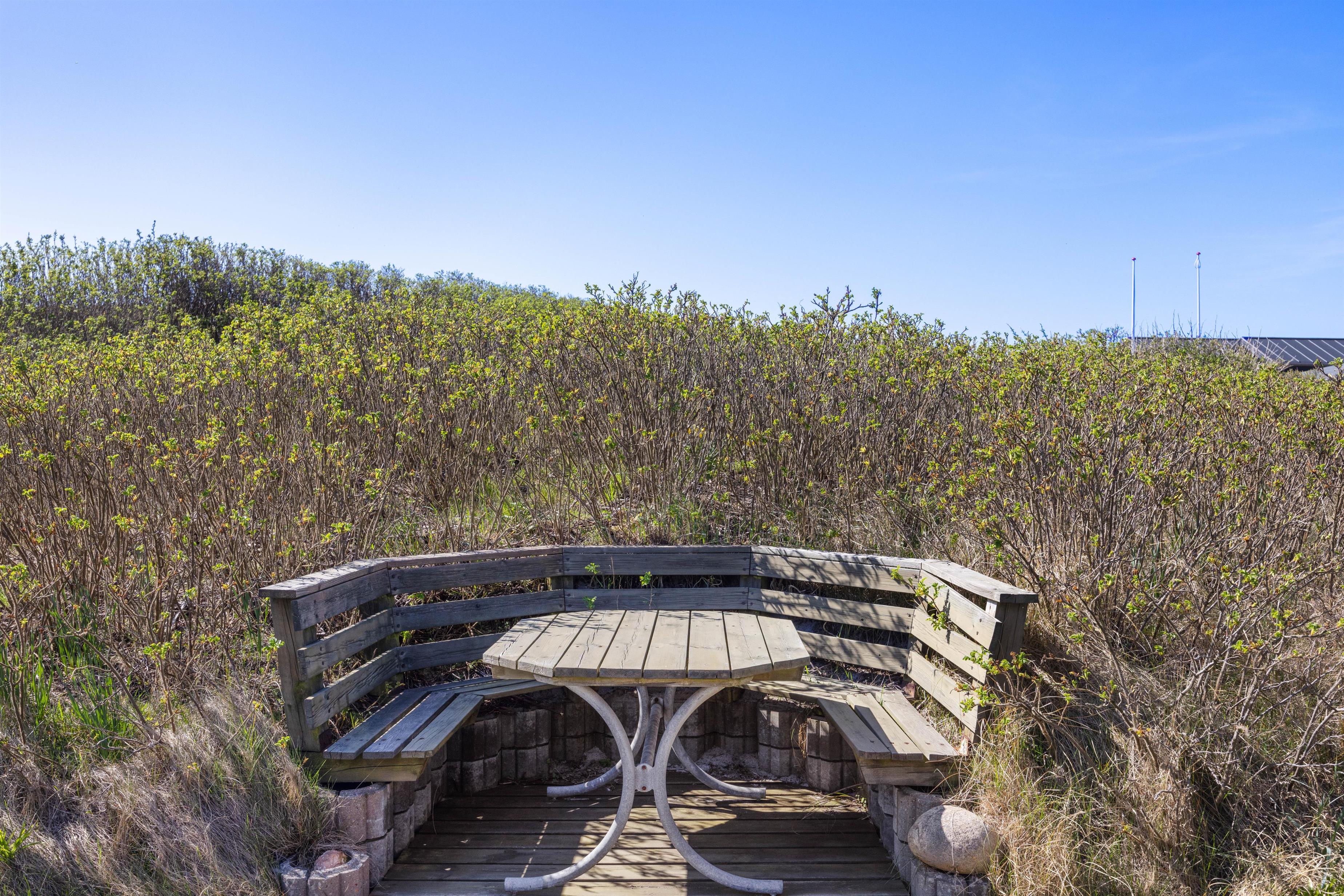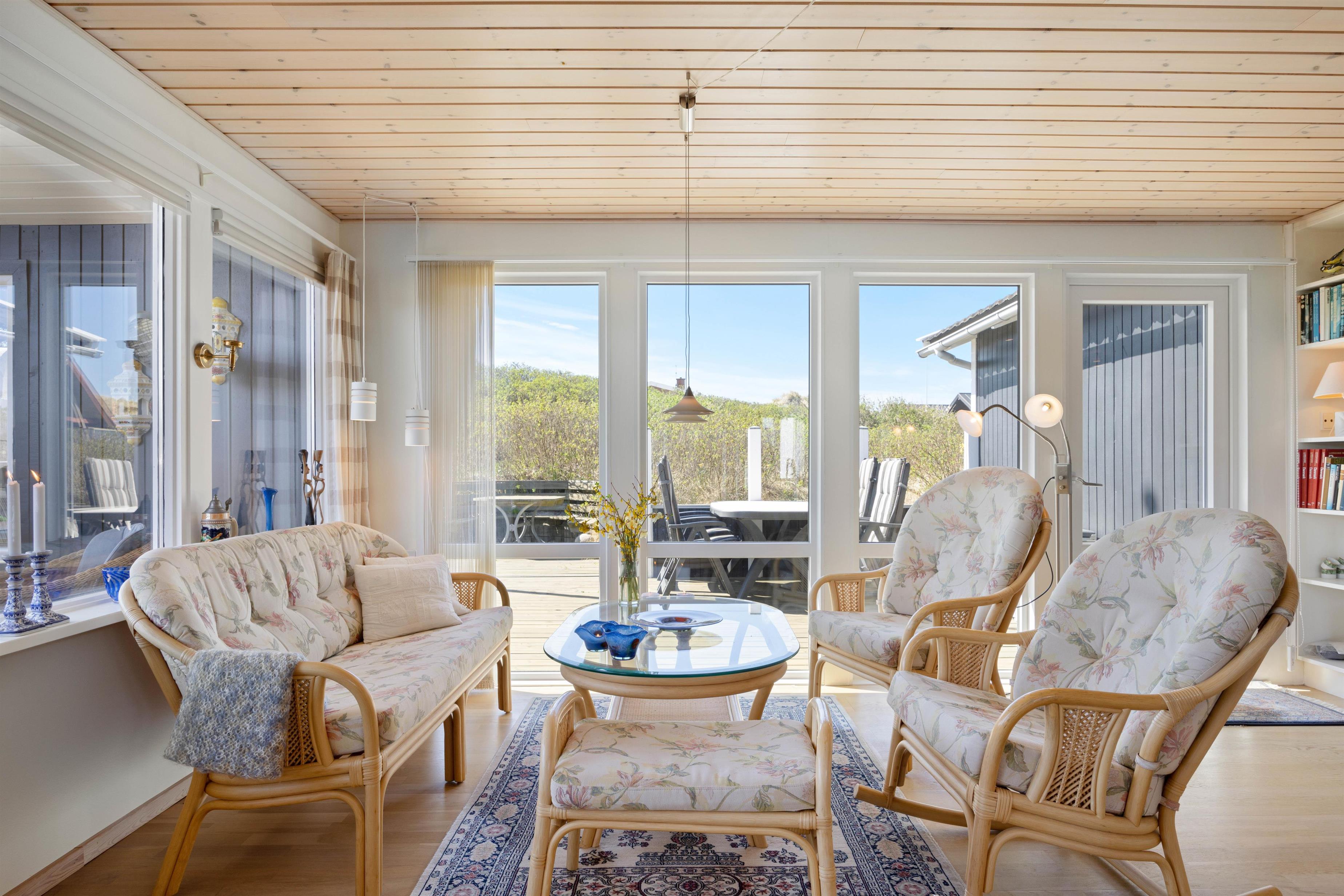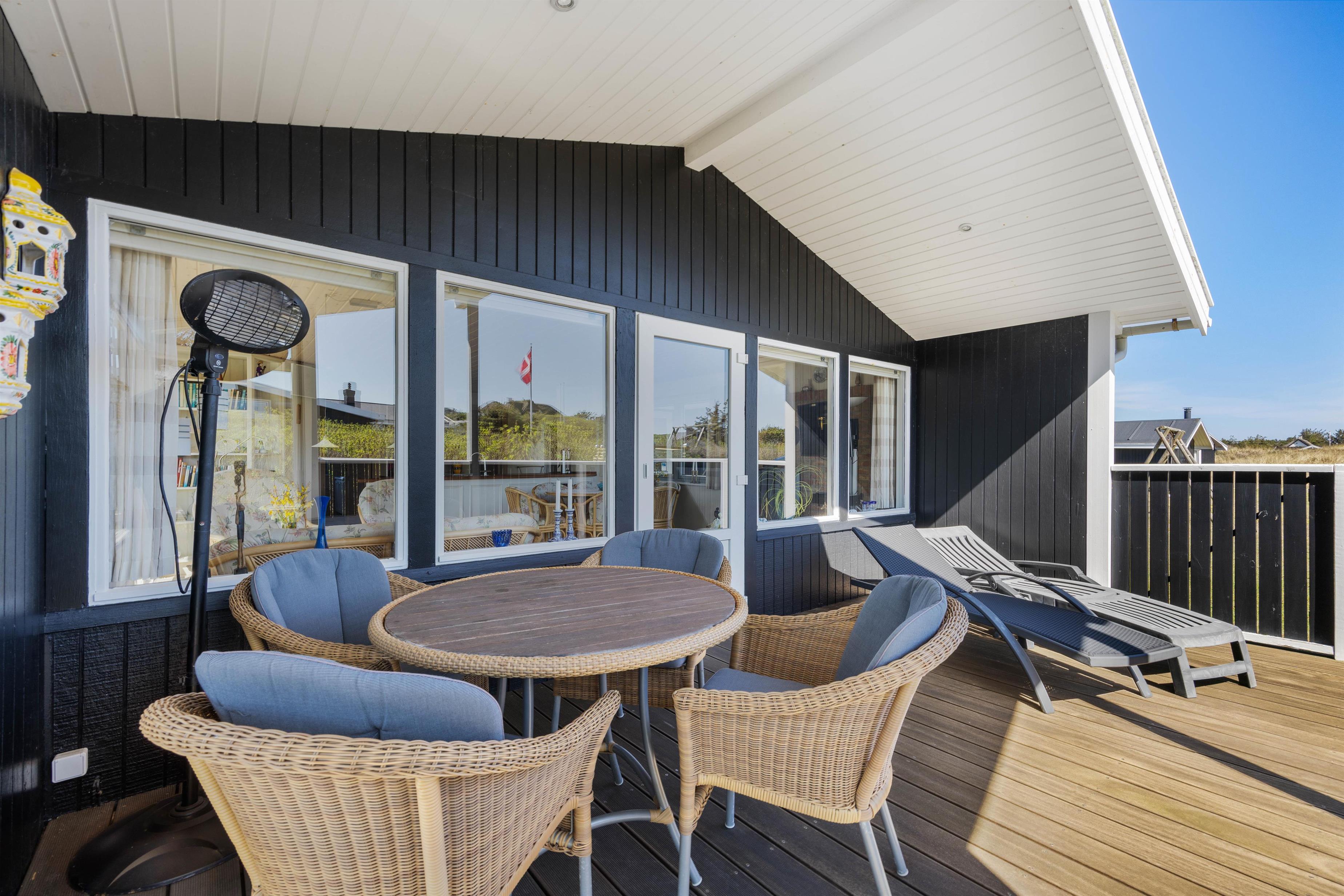 Et af sommerhusets absolutte højdepunkt er uden tvivl den dejlige træterrasse, som er delvist overdækkedt og omgiver huset. Her er det oplagt at tilbringe mange feriestunder sammen og nyde solen og hinandens selskab mens I tilbereder et dejligt måltid mad sammen, eller nyder et godt glas vin. Her er også både grill og havemøbler til rådighed. Til børnene er der en gynge, som helt sikkert vil bidrage med en masse timers sjov.