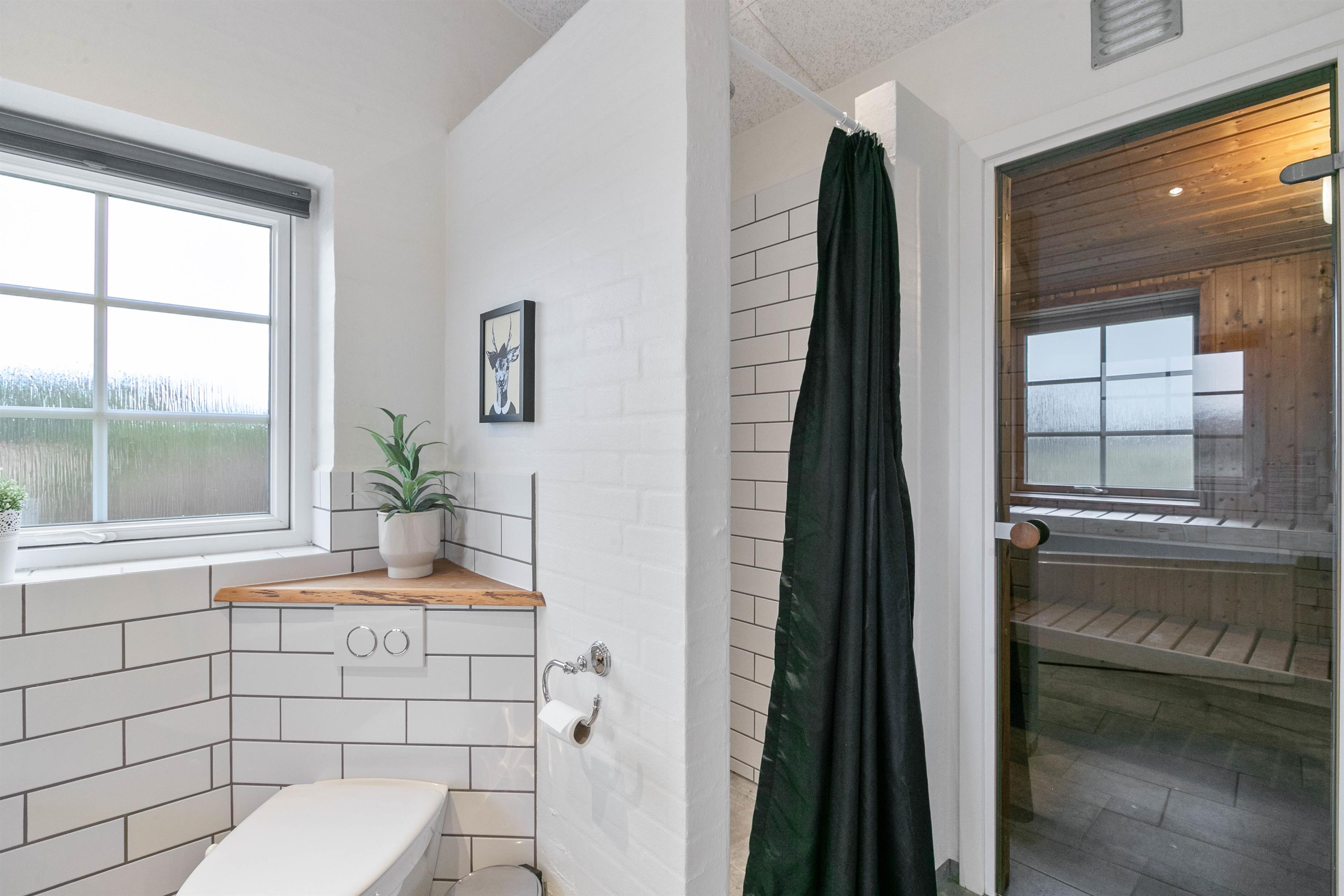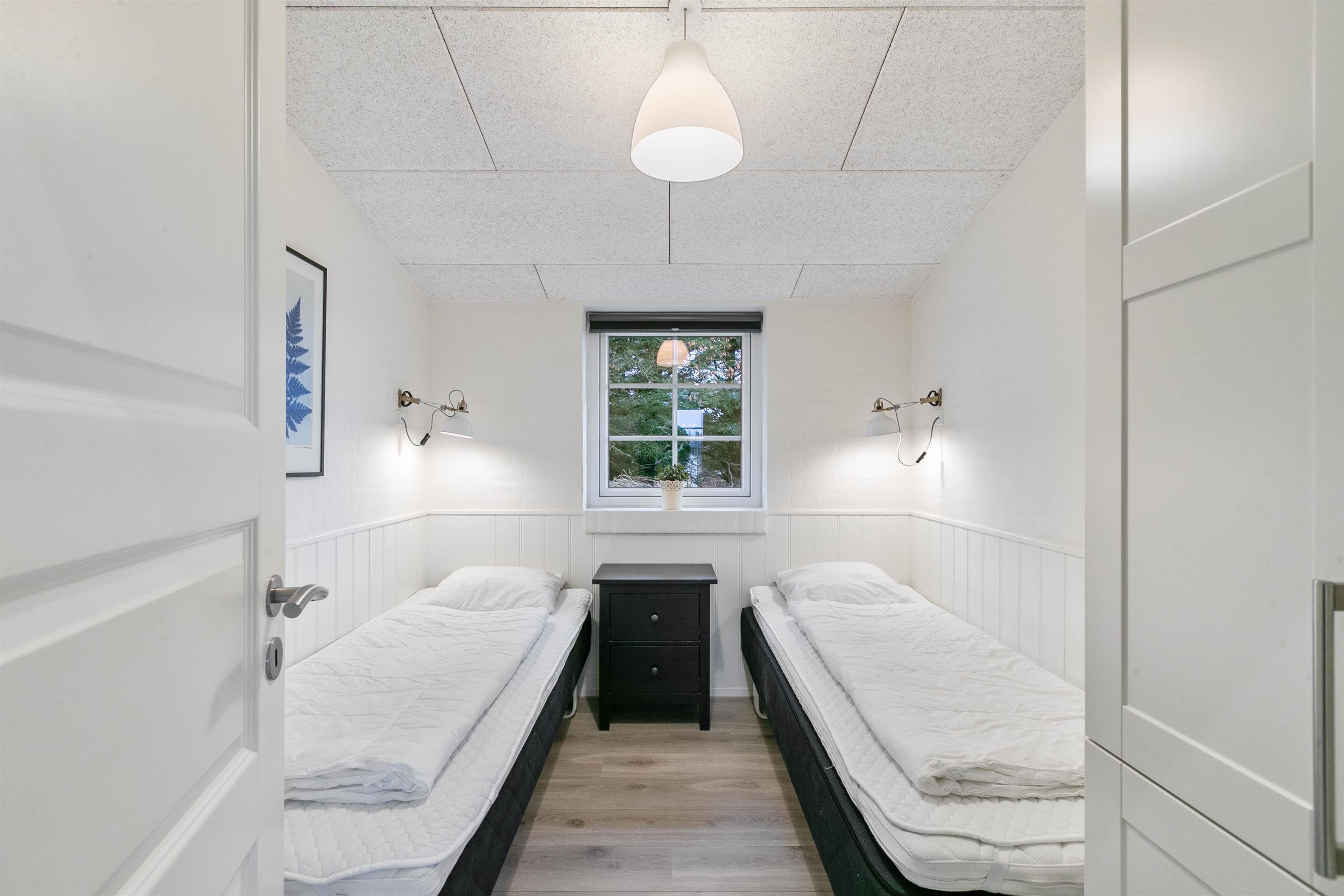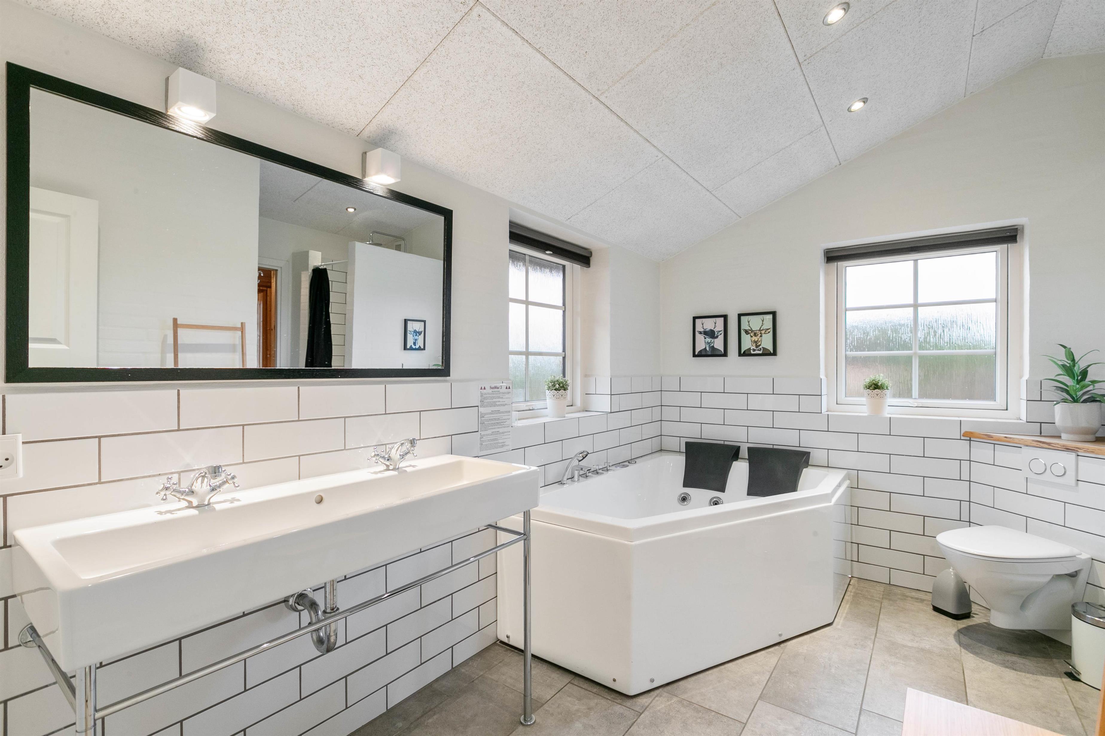 Der er lavet to soveafdelinger, så I har et soverum og det store badeværelse med sauna og spa i den ene ende af huset, og to soverum, et badeværelse og en praktisk baggang med håndvask i den anden. Sådan en rumfordeling er helt perfekt, hvis børnene skal have en afdeling for sig selv, eller hvis du holder ferie med vennerne.