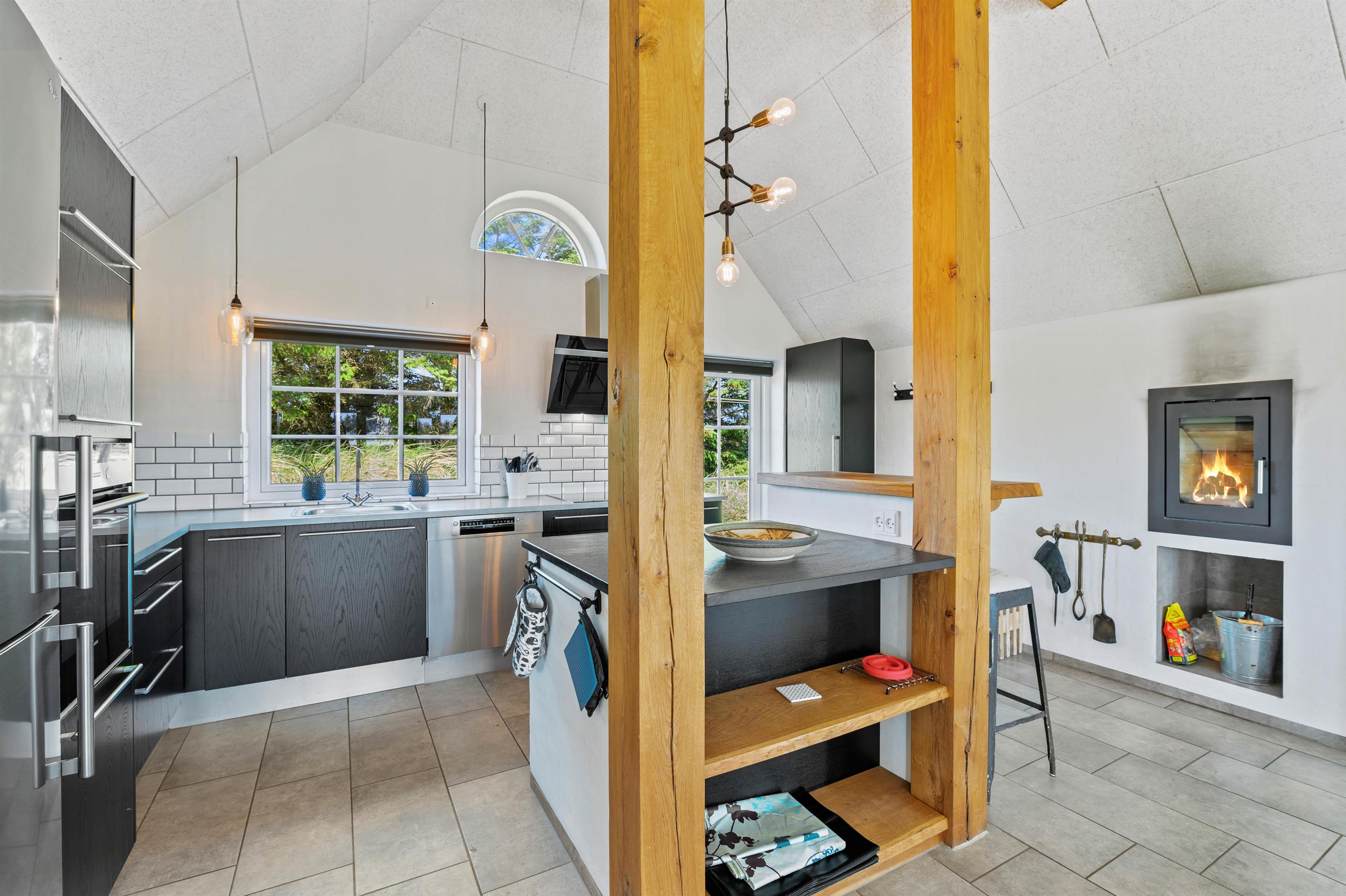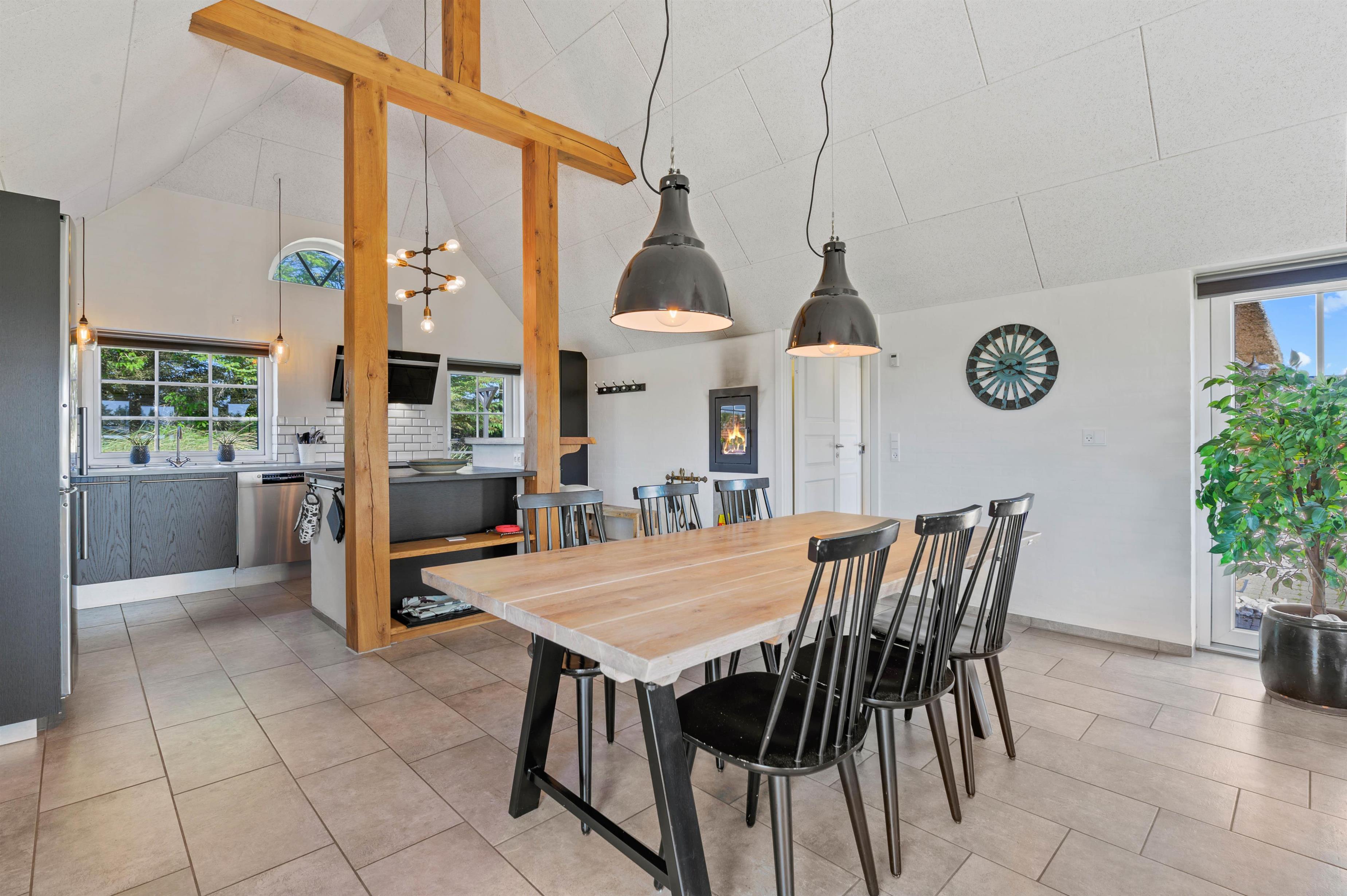 Midt i feriehuset er der lavet køkken, spiseafdeling og stue i et stort rum, så det er nemt for familien at samles, hvad enten det er over madlavningen, brætspil eller en god film. Og på grund af den energibesparende luft-til-vand varmepumpe kan I holde energiudgifterne nede.