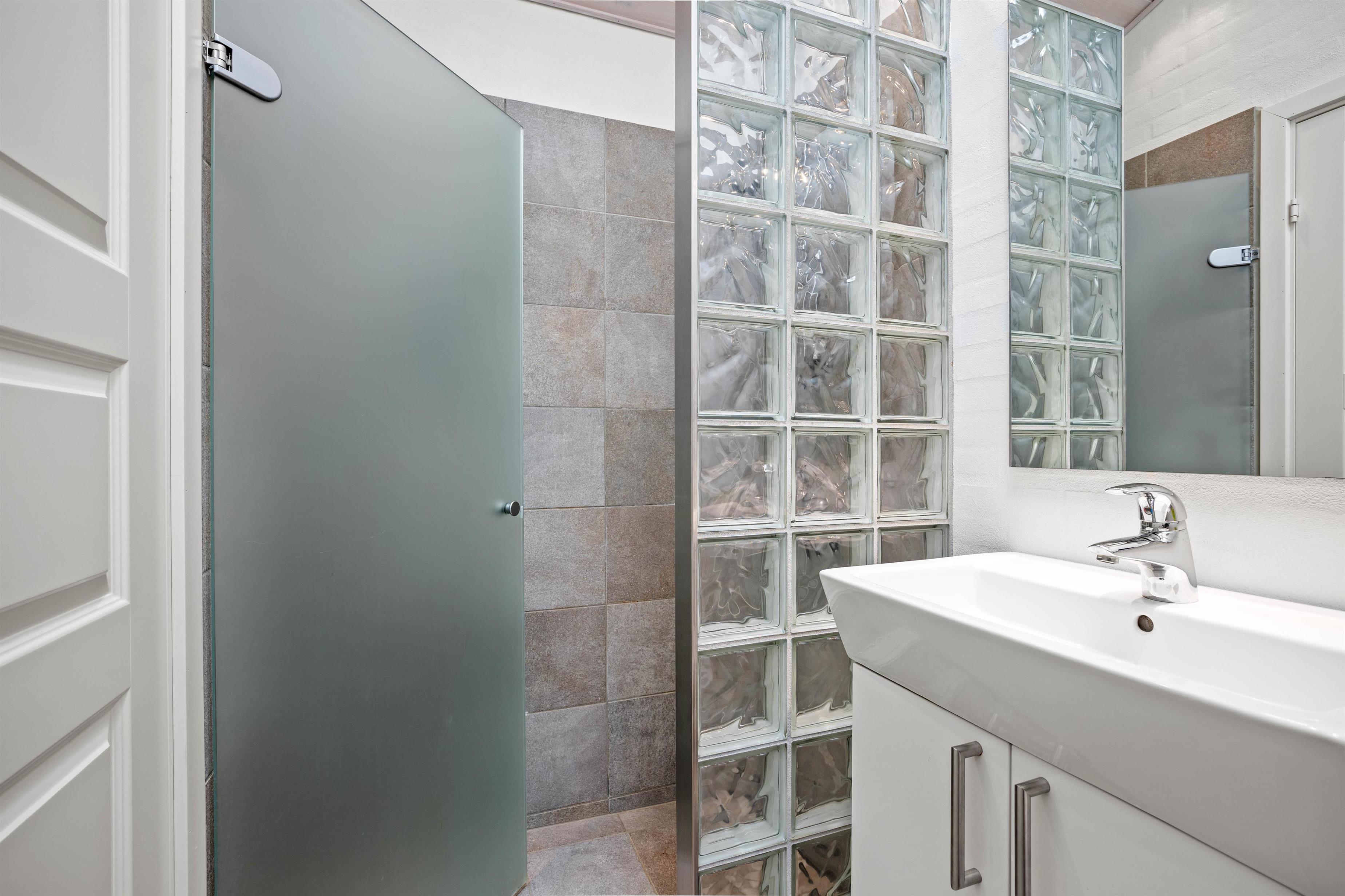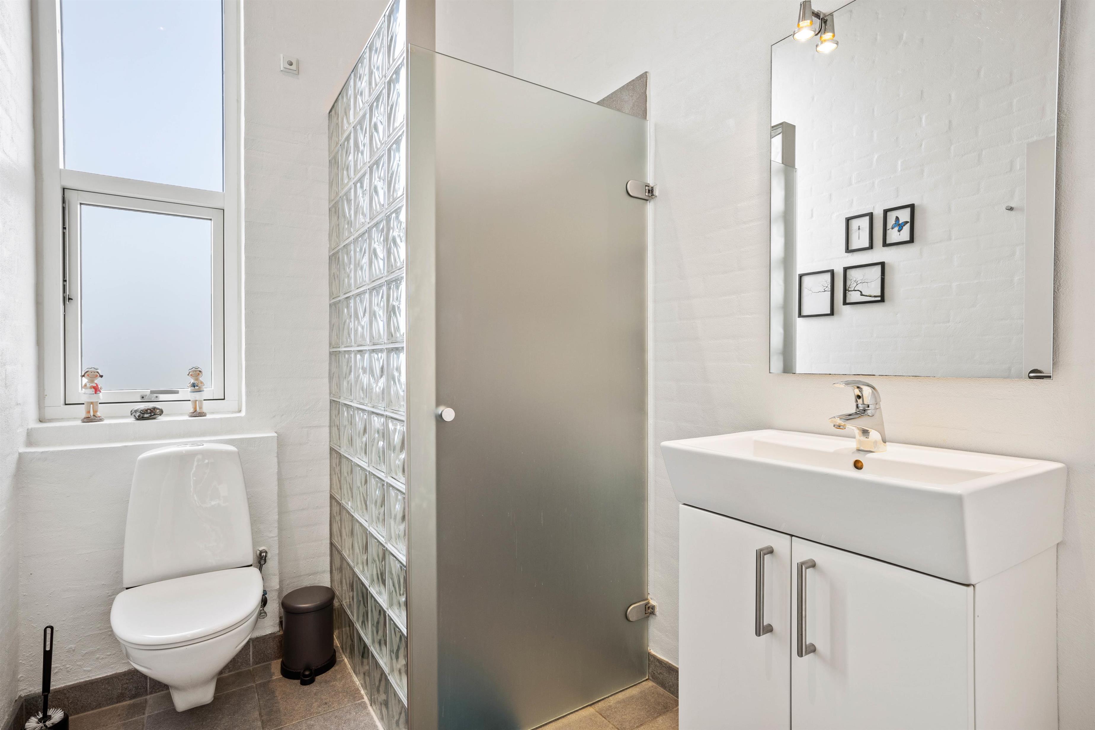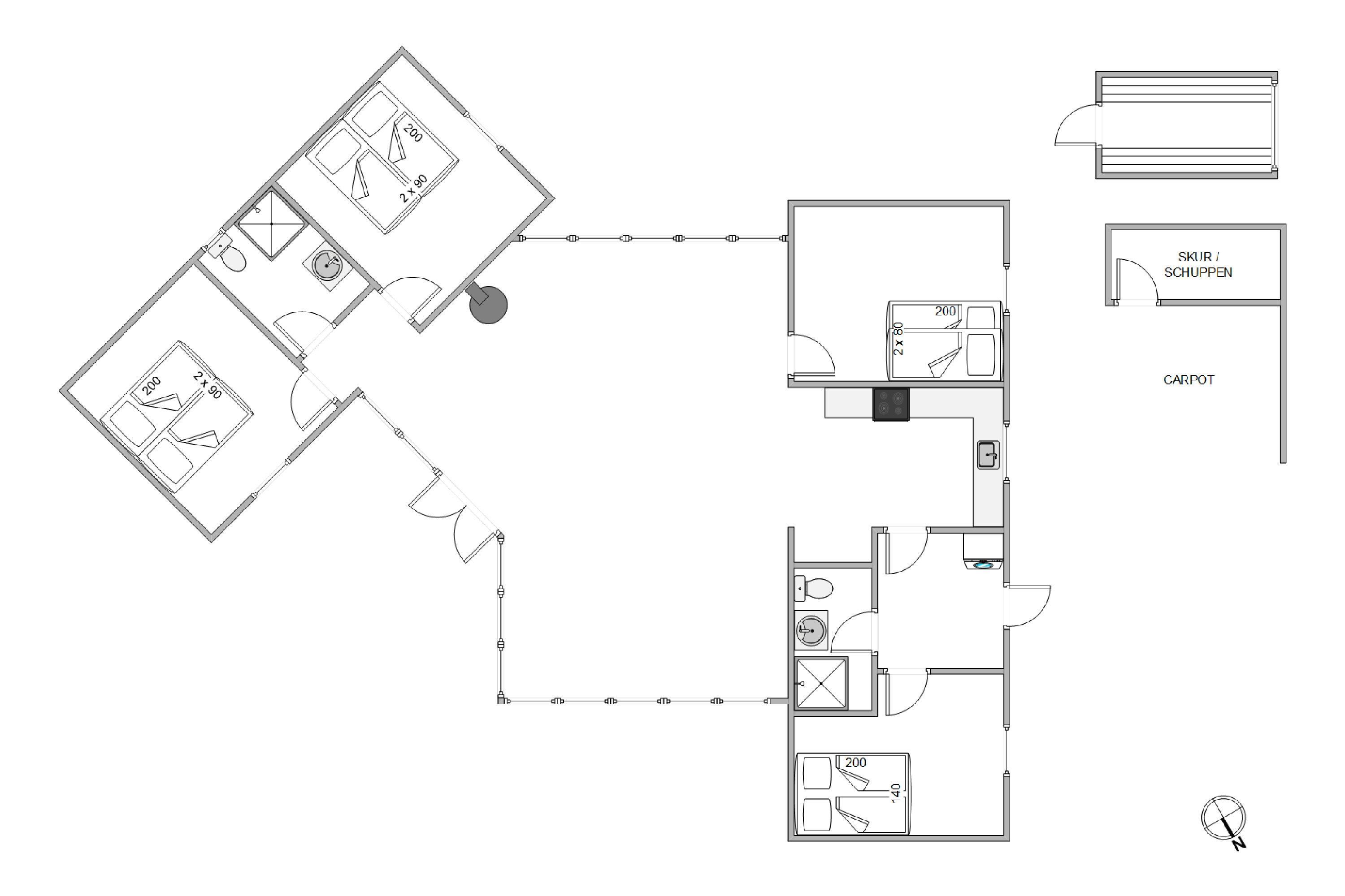 De 2 badeværelser er begge udstyret med toilet og bad, så ingen står i kø ved morgenrutinen. Alle opholdsrum samt badeværelser er udstyret med gulvvarme, hvilket giver en behagelig og hyggelig atmosfære, uanset årstiden. Om aftenen kan I synke ned i sofaen og kigge ud på stjernehimlen gennem de flotte, store vinduespartier, som bidrager til et fantastisk lysindfald i sommerhuset. Skulle I få brug for at vaske tøj under jeres ophold, så er der vaskemaskine og tørretumbler til fri afbenyttelse.