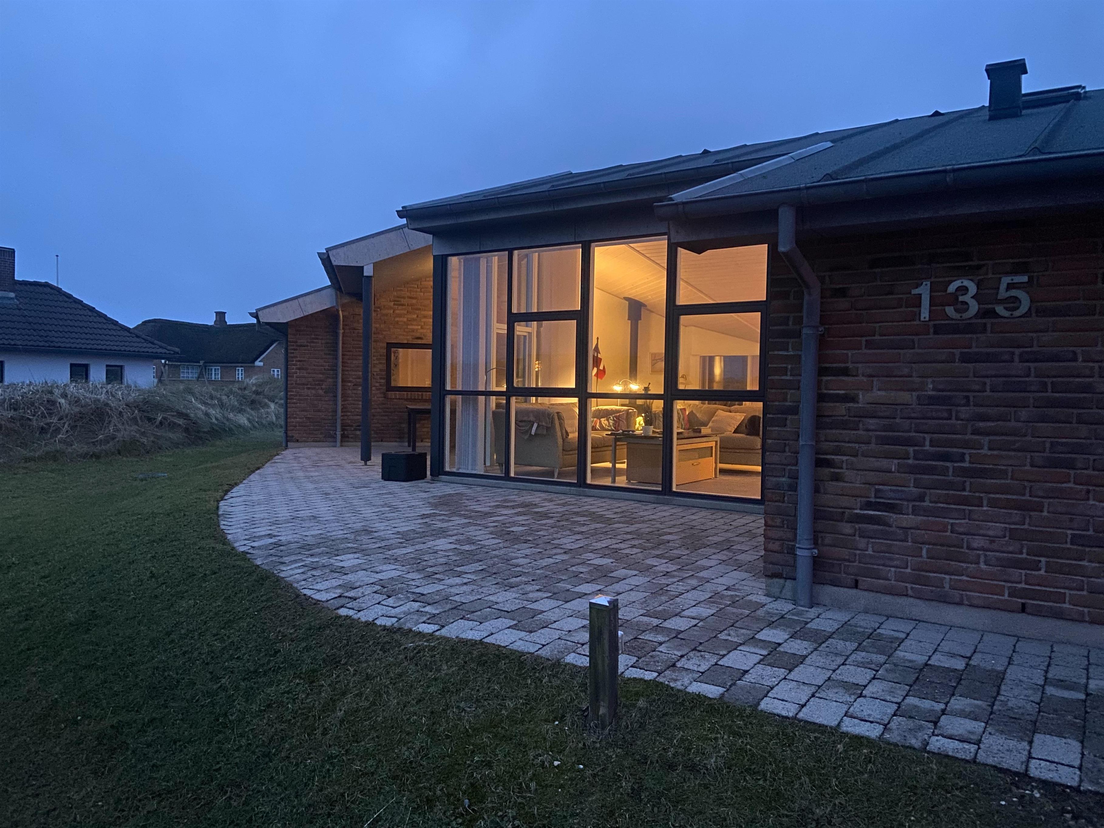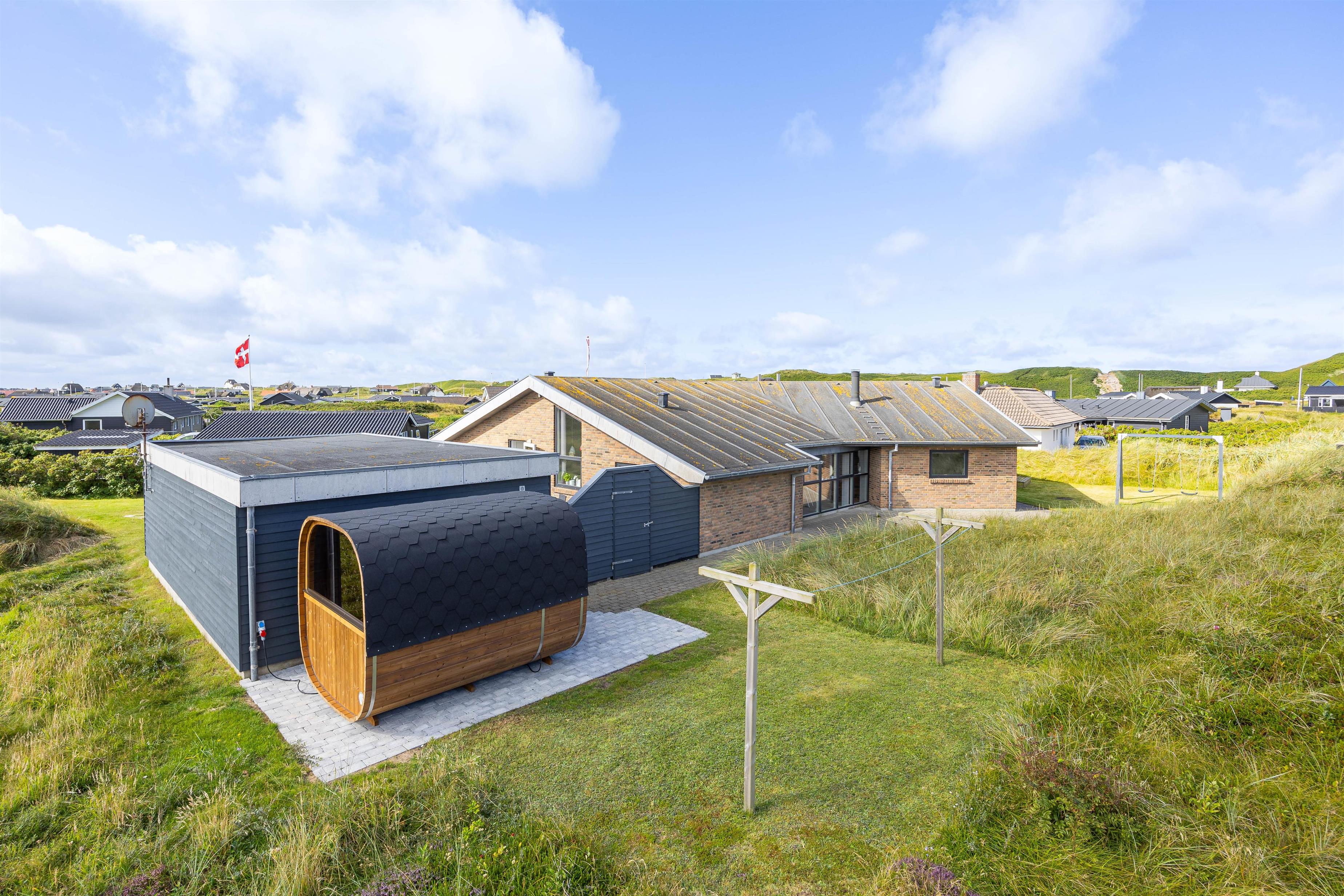 Udenfor huset finder I en dejlig og solrig terrasse, hvor I kan nyde solen og det smukke landskab omkring huset. Der er også havemøbler og en grill til rådighed, så I kan lave et lækkert måltid på grillen, og nyde det udenfor i det fri. Udenfor har i direkte adgang til en dejlig udesauna, hvor i kan nyde varmen, og på sammetid nyde udsigten ud over det betagende klitlandskab.Terrassen er delvis overdækket og med en terrassevarmer, hvilket der indbyder i stor grad til hygge. Her kan I læne jer tilbage i havestolene og bare nyde livet. Eller solbade på solsengene når vejret er godt.