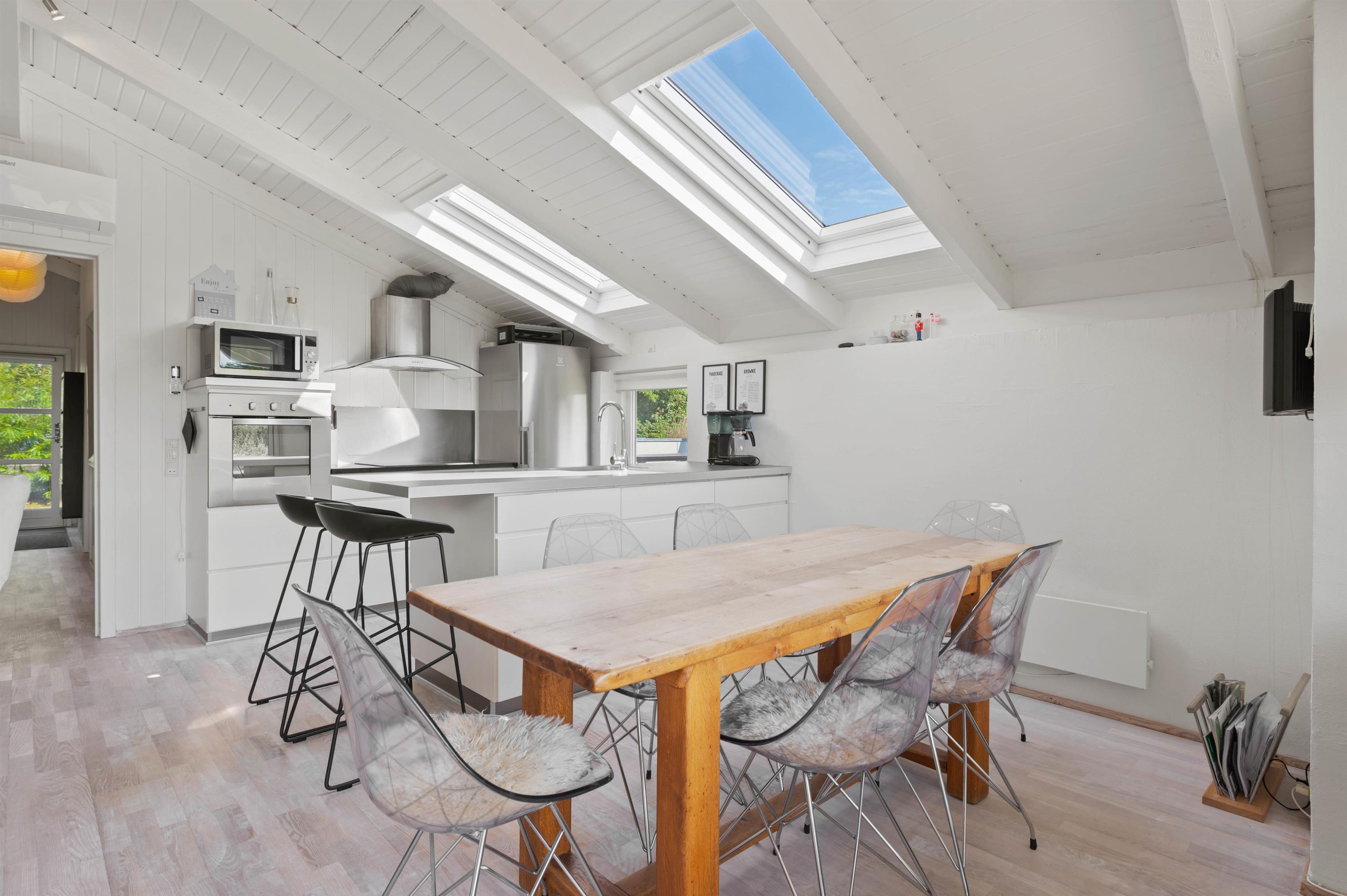 Feriehusets centrum er den dejlige, lyse stue der ligger i forlængelse af det fine køkken. Her kan I sætte jer i barstolene og nyde en lækker drink eller et glas koldt at drikke imens andre står for madlavningen samtidig med, at I nyder de knitrende lyde og den behagelige varme fra brændeovnen. Ovenlysvinduerne sørger for et fantastisk lysindfald, hvilket også hænger godt sammen med valget af de andre lyse møbler, vægge og lofter. Ydermere finder I i sommerhuset også en energisparende luft til luft varmepumpe, der kan være behjælpelig med at skabe et behageligt indeklima uanset årstiden.