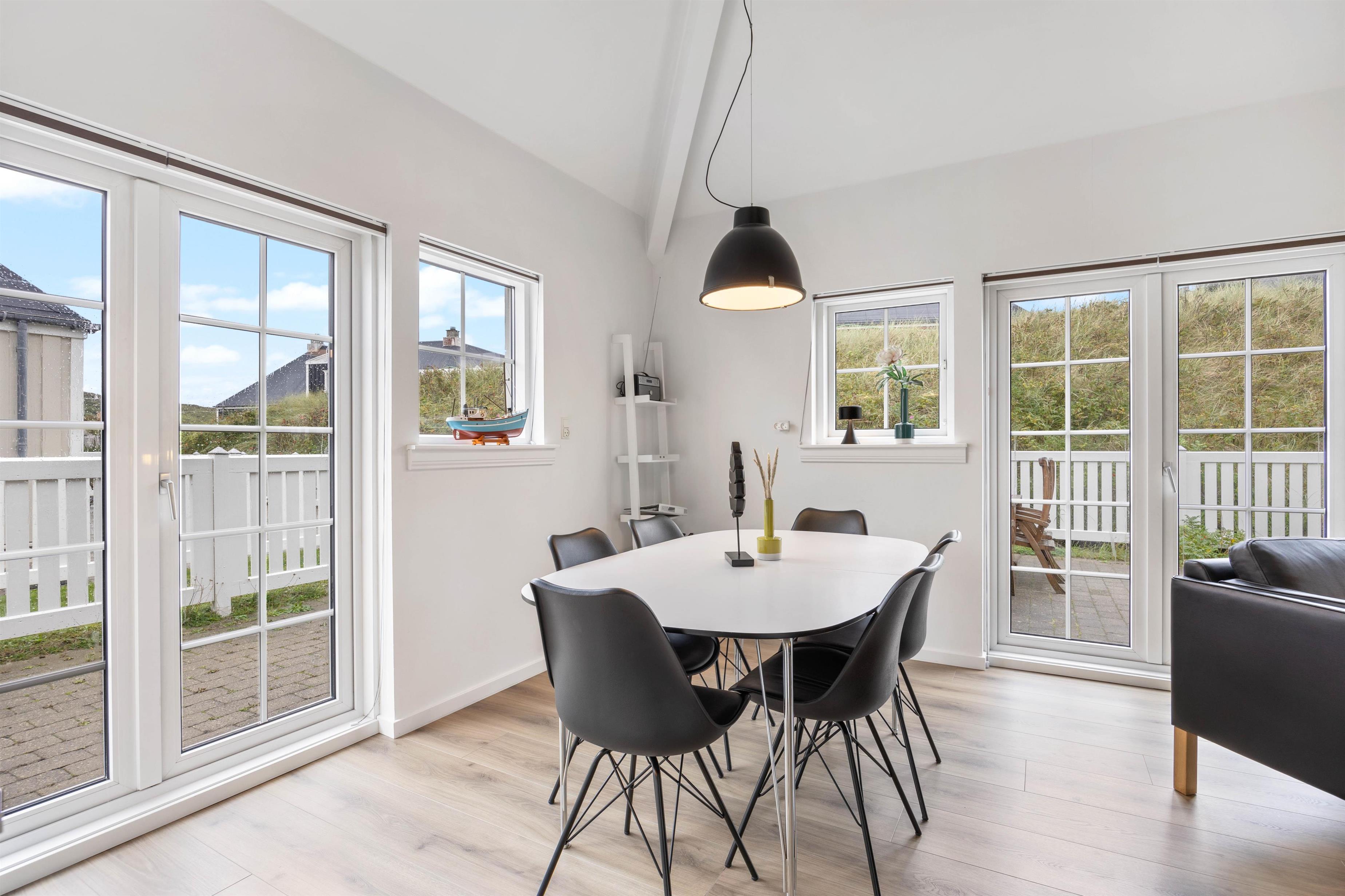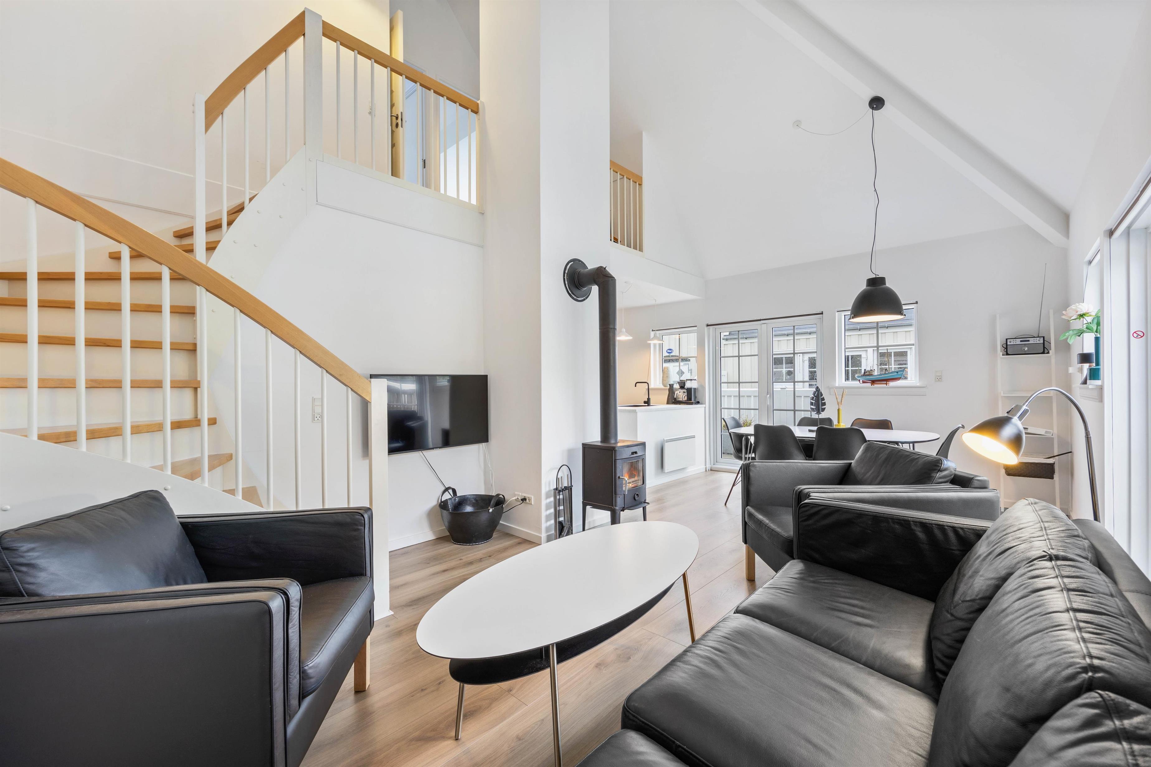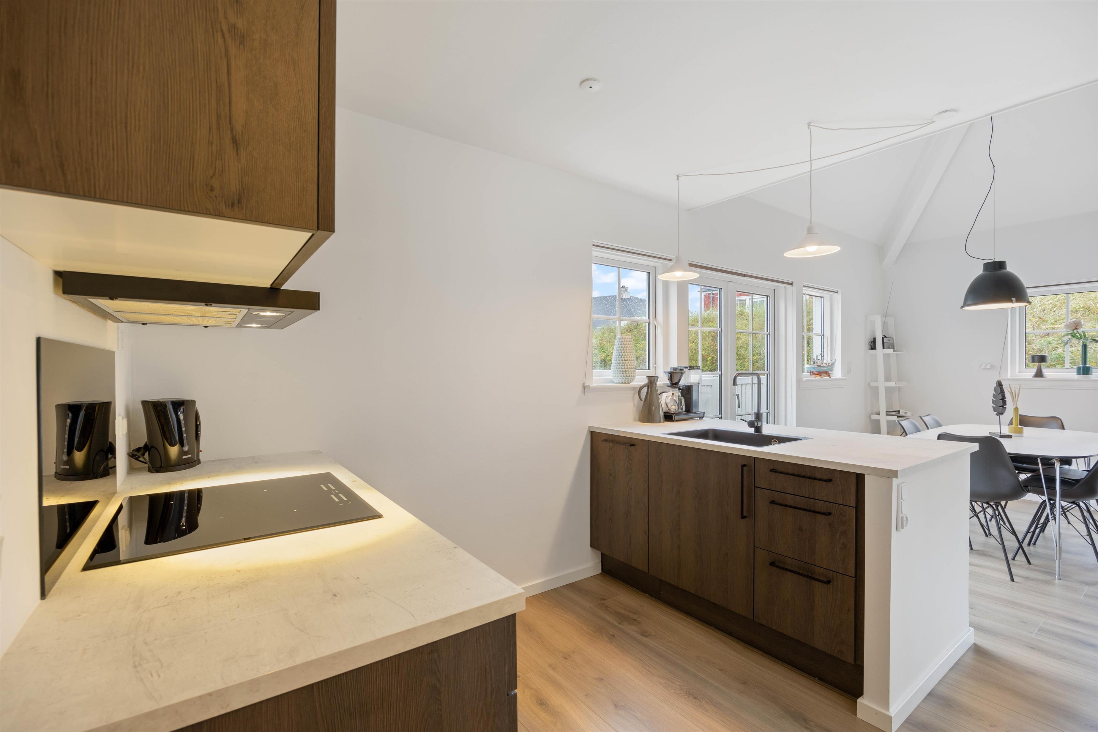 Feriehuset blev renoveret i 2023 og er indrettet på 2 etager. I stueetagen ligger den store opholdsstue, som helt klart er feriehusets hjerte. Opholdsstuen er i direkte forbindelse med køkkenet, og her kan I samles og lave mad sammen mens I planlægger feriens kommende aktiviteter.