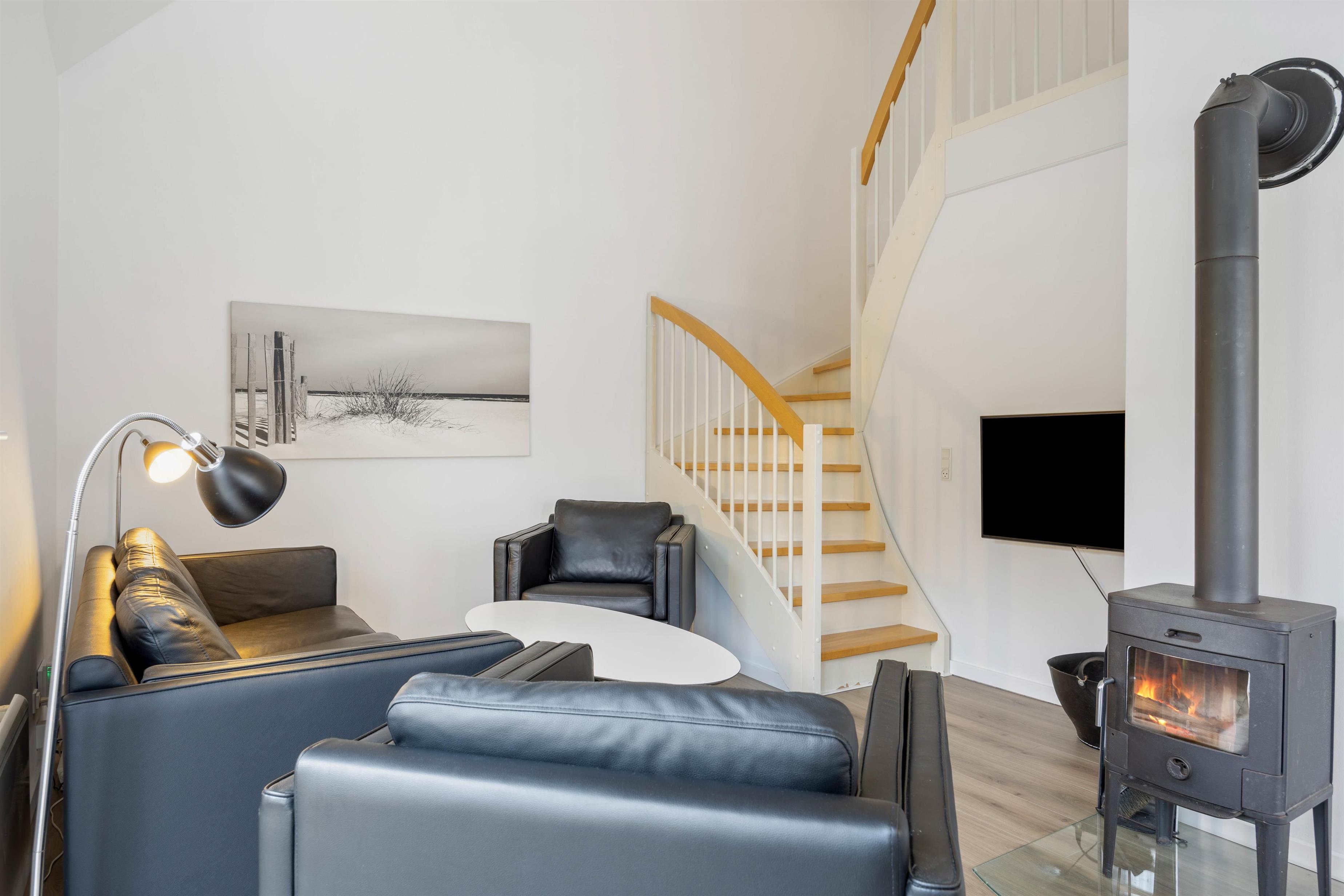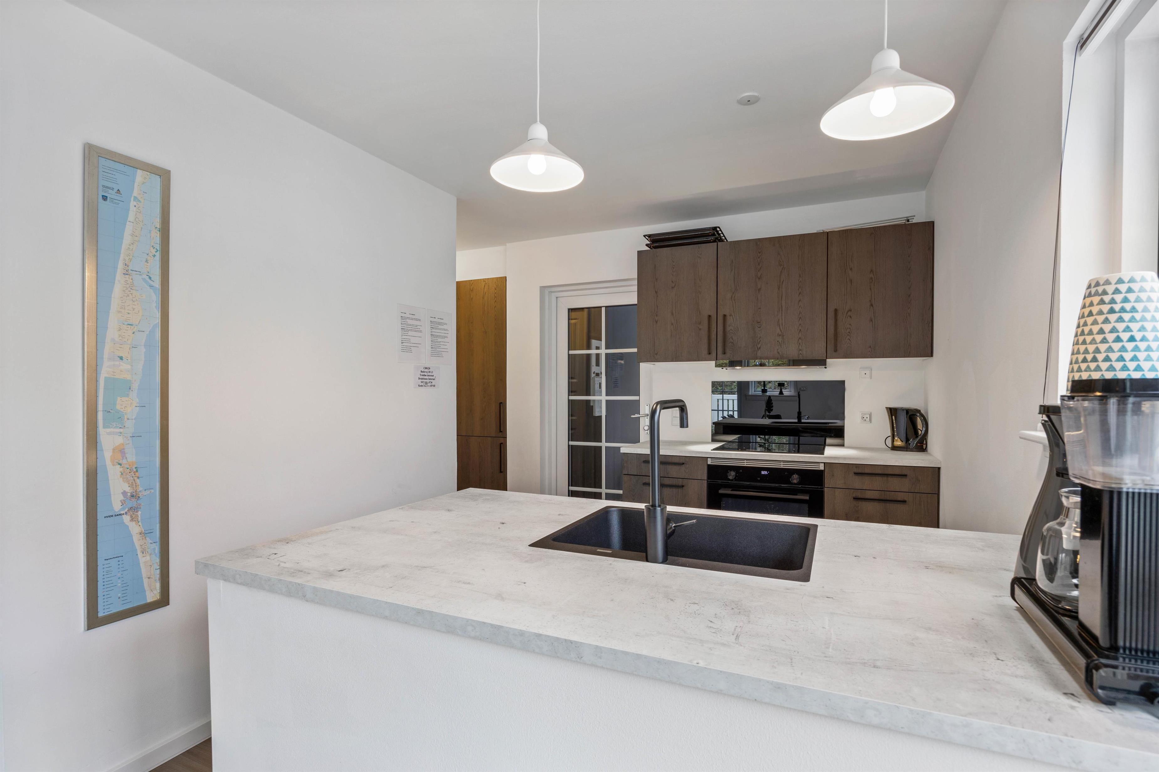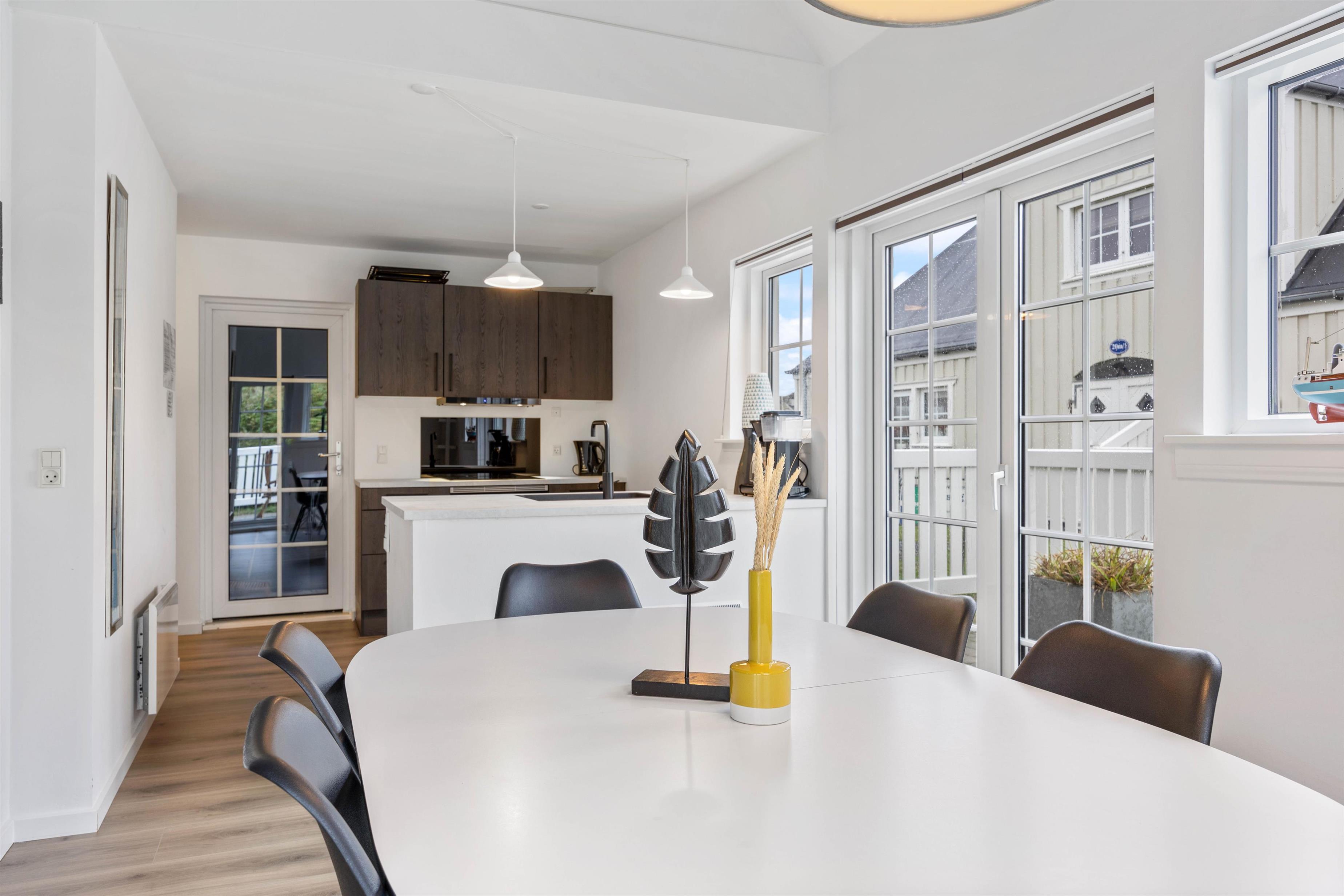 Feriehuset blev renoveret i 2023 og er indrettet på 2 etager. I stueetagen ligger den store opholdsstue, som helt klart er feriehusets hjerte. Opholdsstuen er i direkte forbindelse med køkkenet, og her kan I samles og lave mad sammen mens I planlægger feriens kommende aktiviteter.