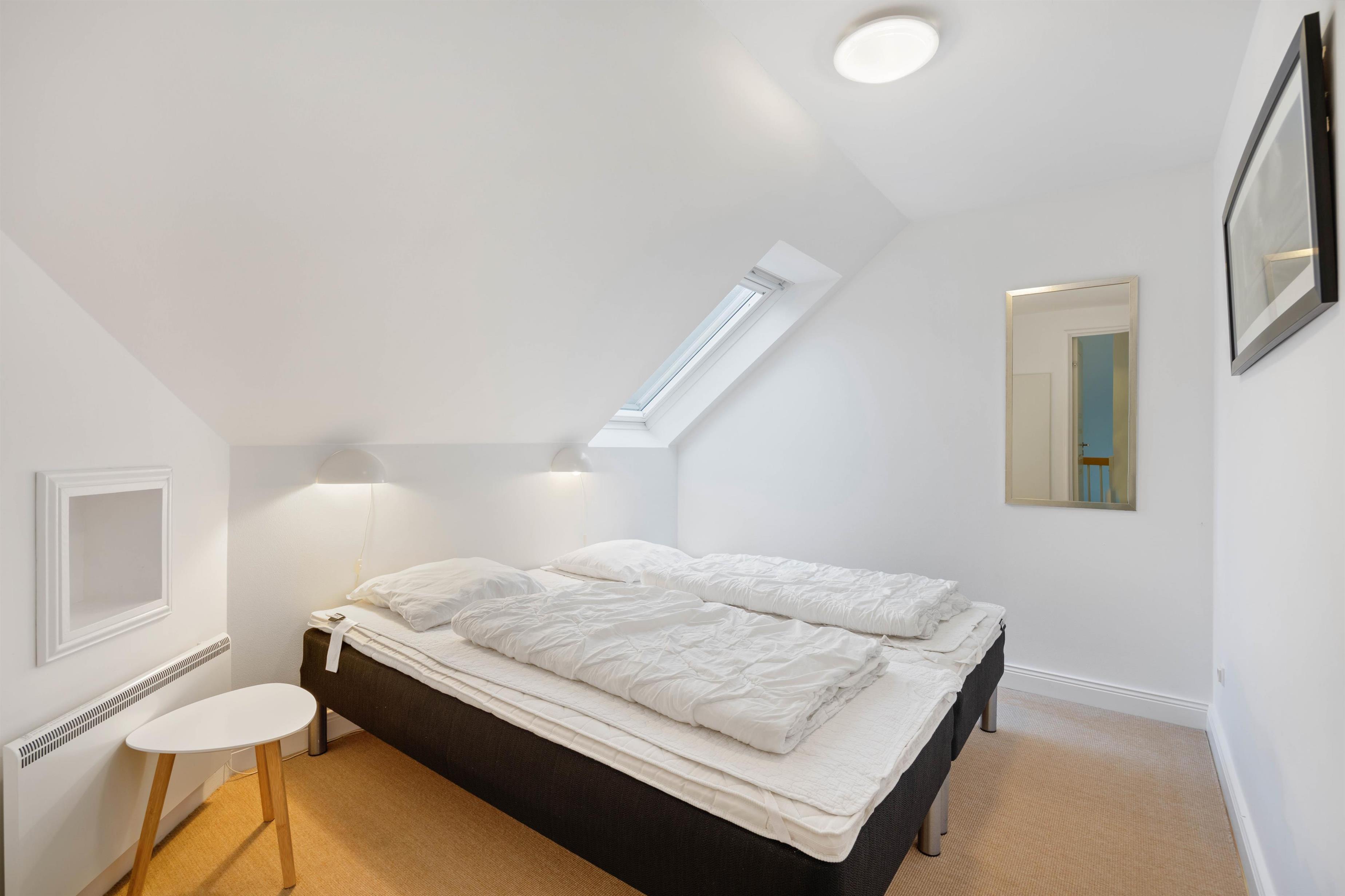 På første sal ligger ferieboligens to soveværelser, som begge er hyggeligt indrettede og udstyrede med dobbeltsenge. Her kan I trække jer tilbage efter en dejlig dag og lade batterierne op igen til nye eventyr på ferien.