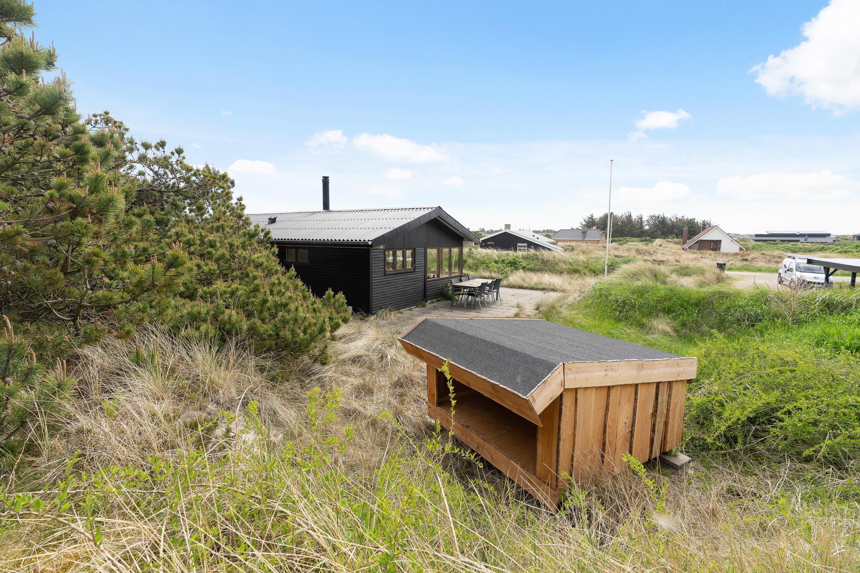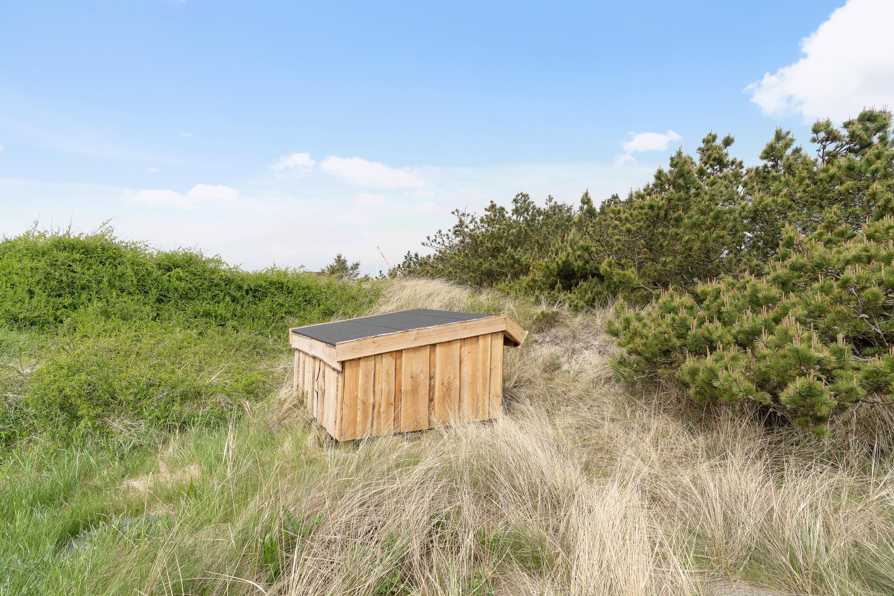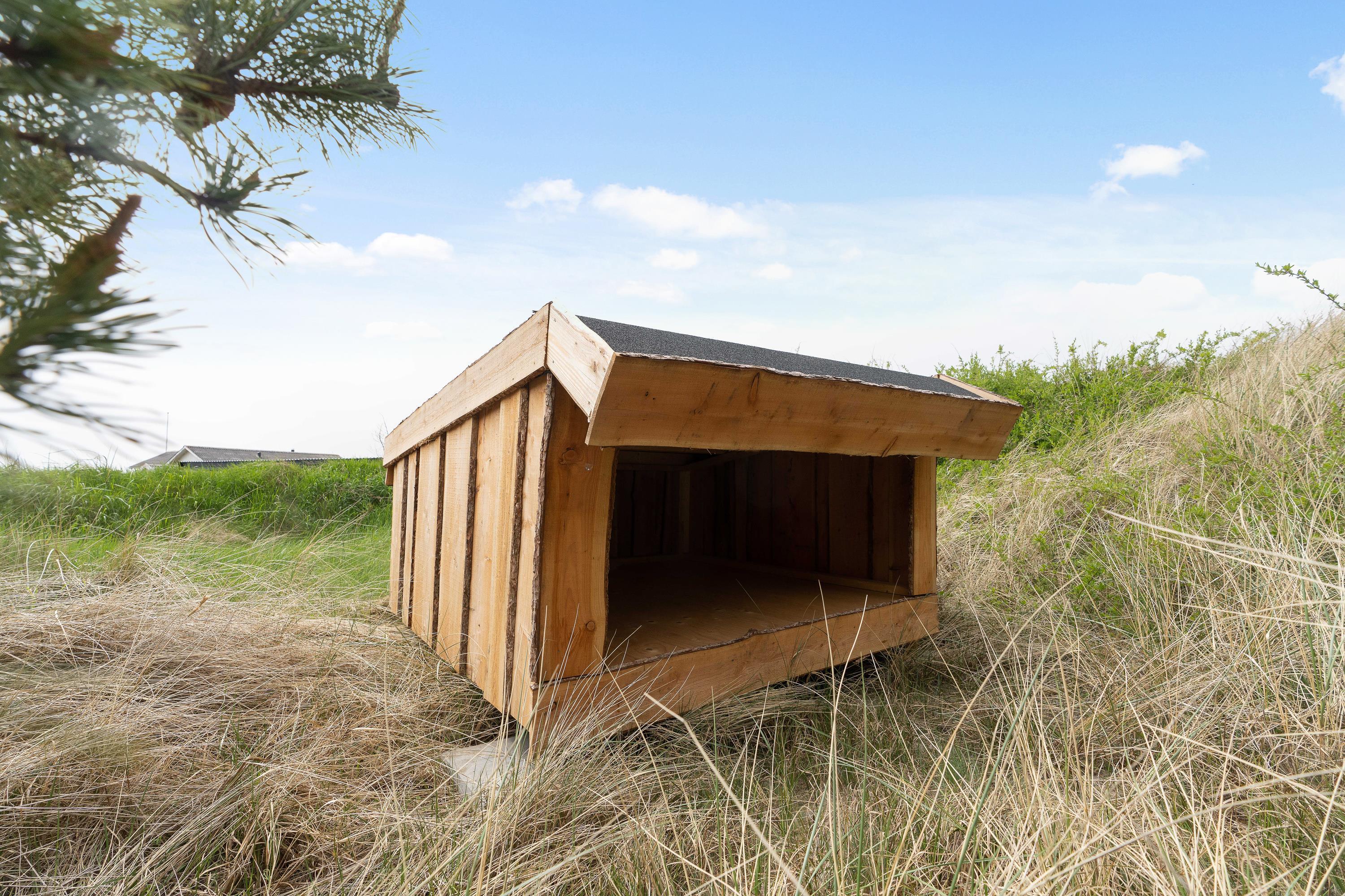 En åben fliseterrasse løber hele vejen rundt om feriehuset, så I altid kan finde en solrig plet. Det kuperede klitlandskab skærmer terrassen af og sørger for både læ og privatliv, når I soler jer i liggestolene eller er samlet rundt om havebordet til en grillmiddag i den lune aftensol. Er I tilhængere af friluftslivet, er her også mulighed for at overnatte udenfor, eftersom der er en shelterplads på grunden – dét er alligevel ret unikt!