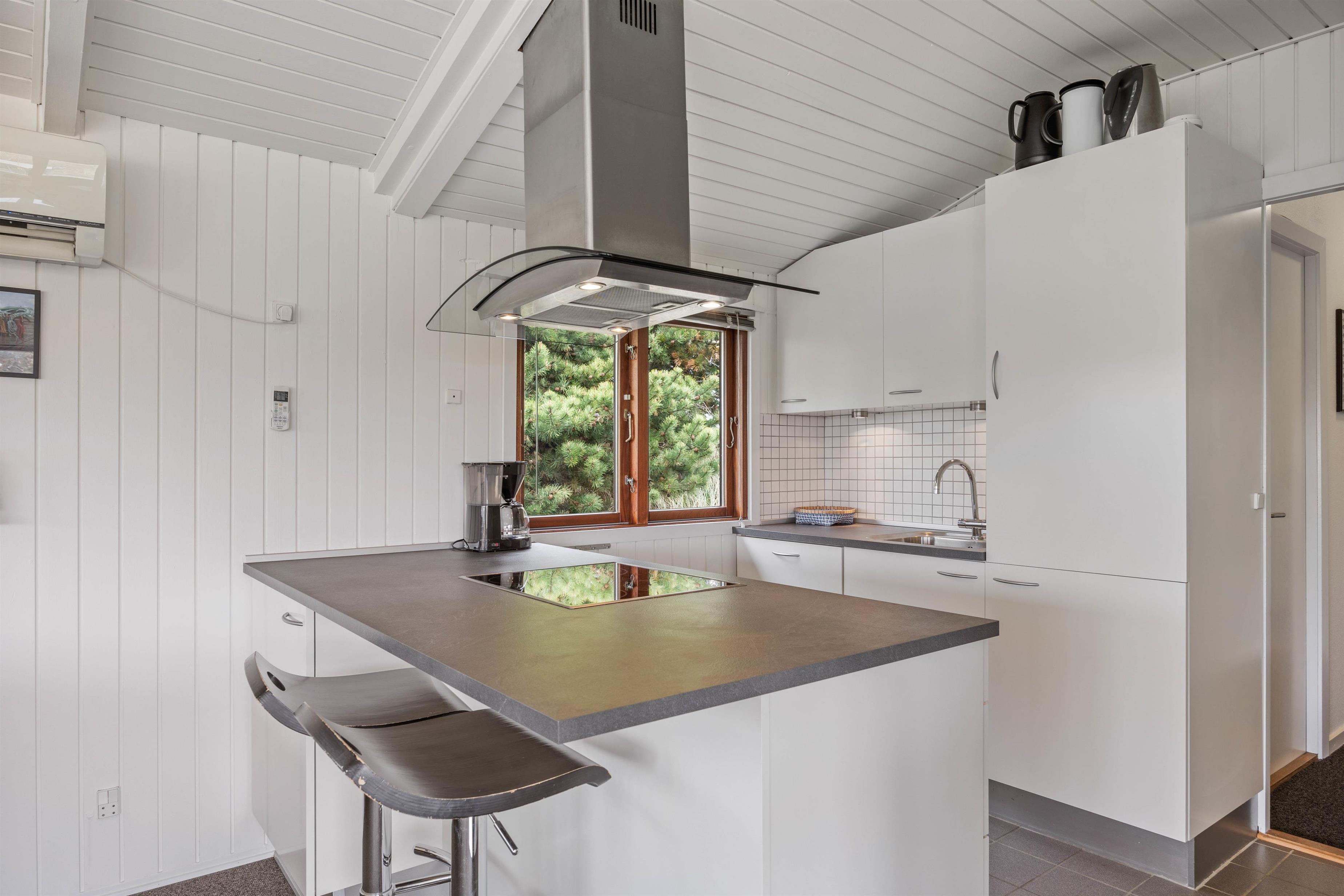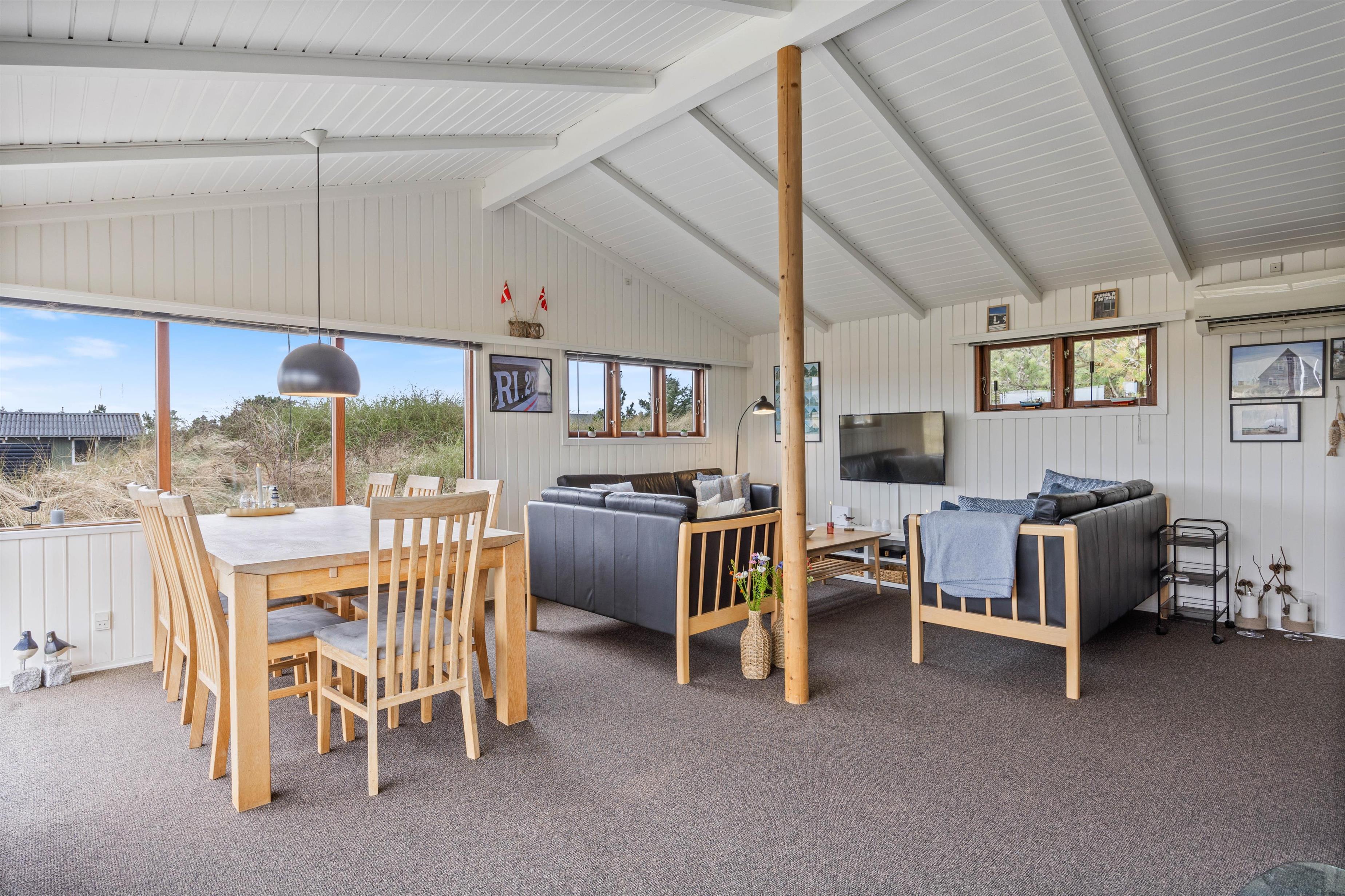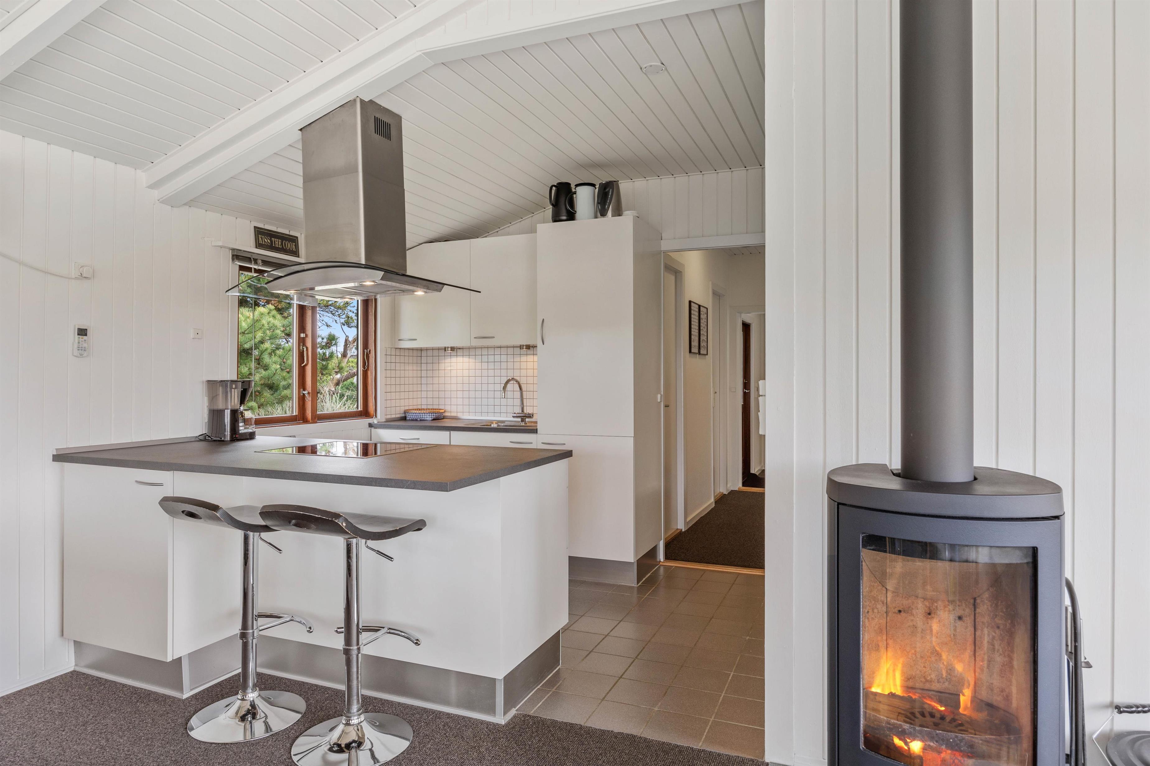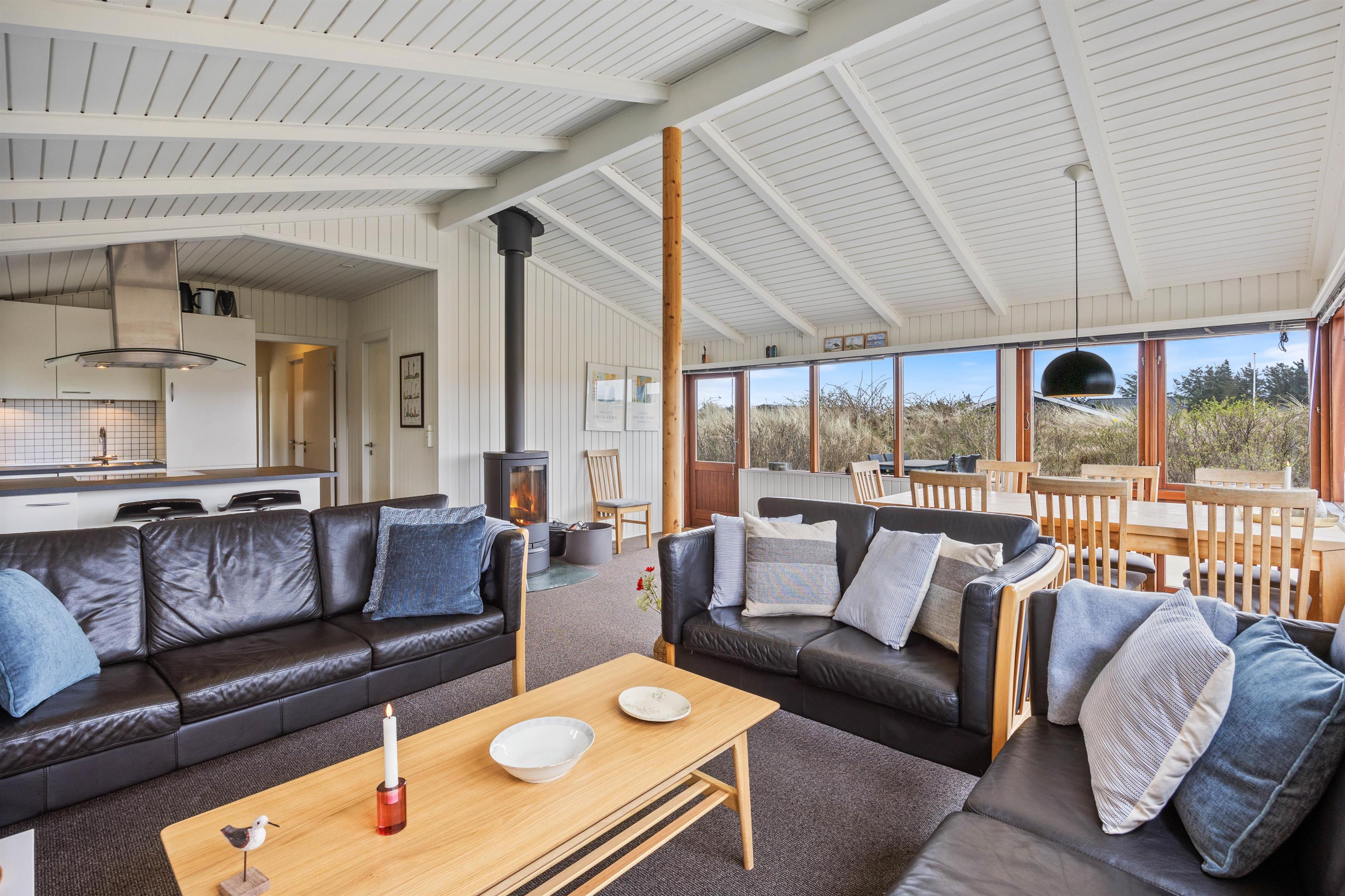 Sommerhusets hjerte er opholdsrummet, der forener køkken, spiseafdeling og stue i ét fællesrum. Loftet er åbent til kip, og store vinduer sørger for, at I både har et dejligt lysindfald og en god udsigt til det omkringliggende klitlandskab. Brændeovnen, som er placeret centralt i rummet, spreder ekstra god feriestemning på de kølige dage – og skal der skrues endnu mere op for velværen, kan I tænde op i sommerhusets sauna.