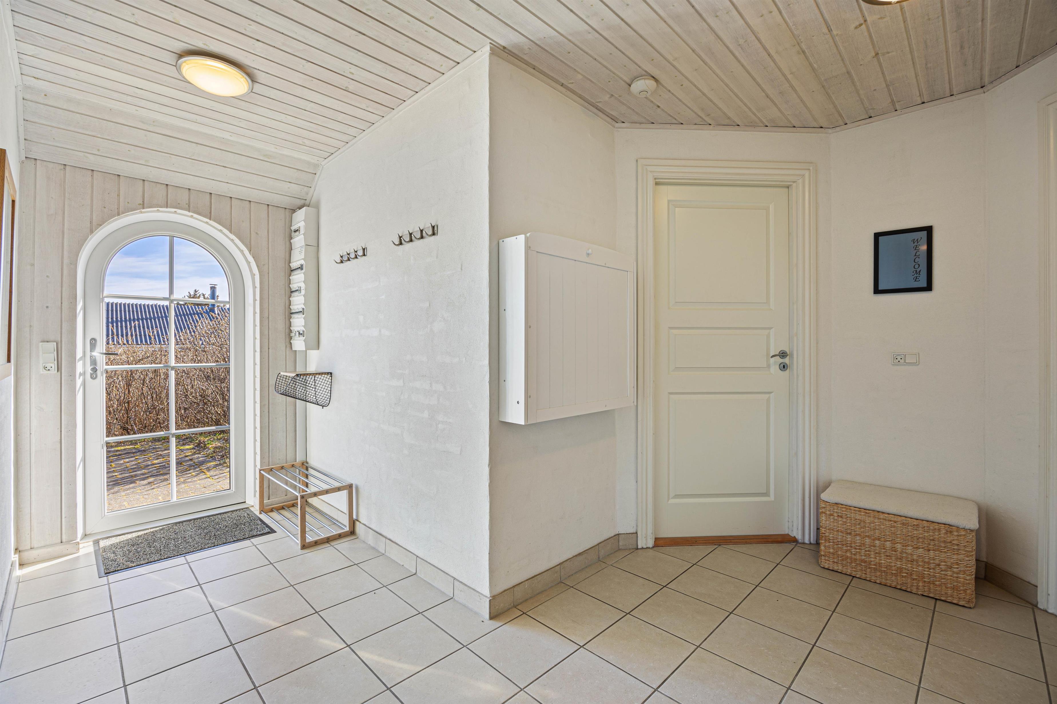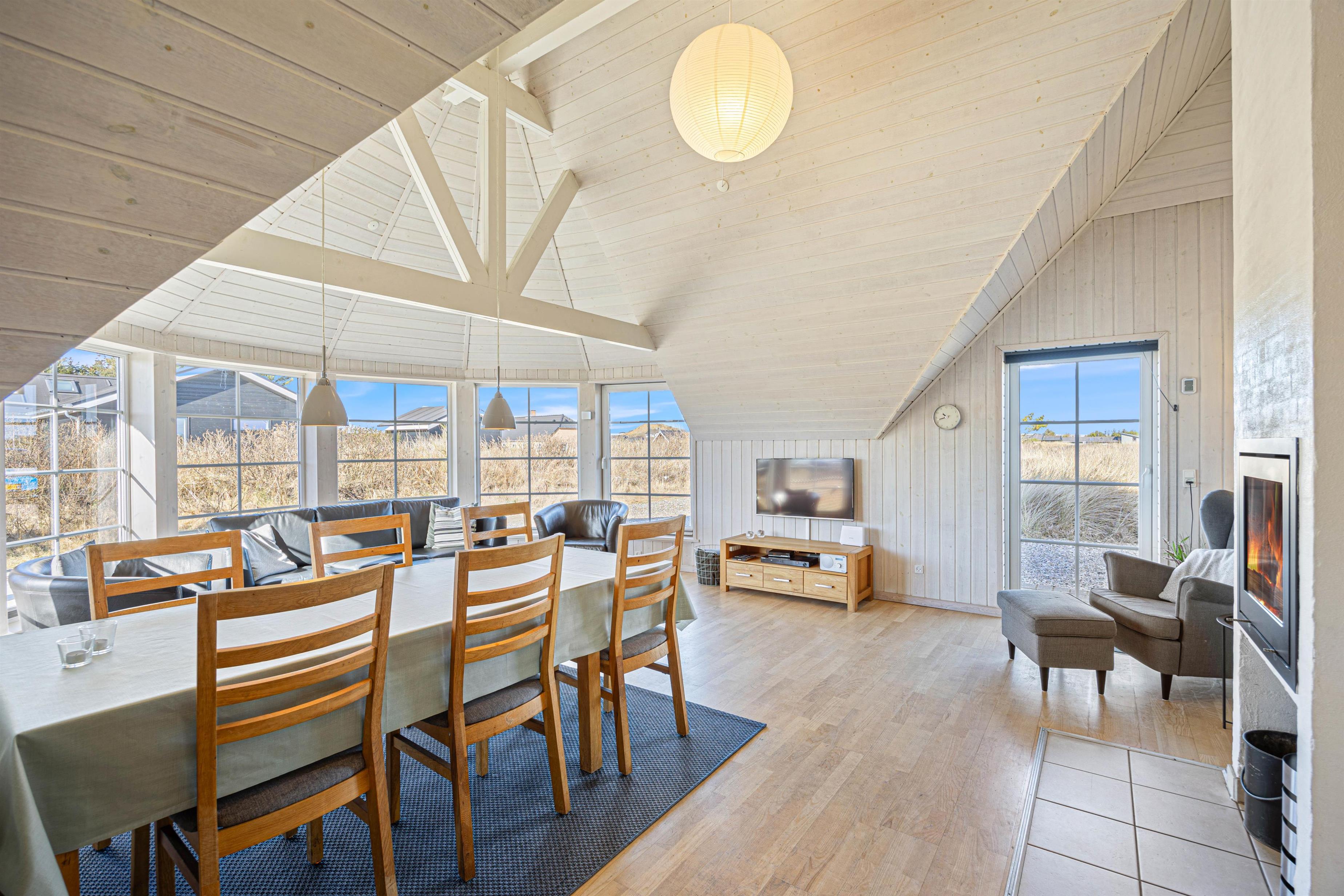 Vægge, lofter og gulve er lyse og skaber et godt lys i feriehuset på Hjelmevej 153. Den store karnap som ligger i alrummet har store vinduespartier og højt til loftet, hvilket skaber en indbydende stemning. Karnappen giver luft og forstærker samtidig lysindfaldet. Refleksionen af lyset sammen med dybden af karnappen, får rummet til at virke større og mere rummeligt og inviterer samtidig naturen indenfor. Perfekt til hygge på kolde dage eller tidlige forårsdage, hvor solen vil varme ind gennem vinduerne. Fra alrummet er der desuden adgang til en hyggelig hems, som er et perfekt som et legerum til børnene.