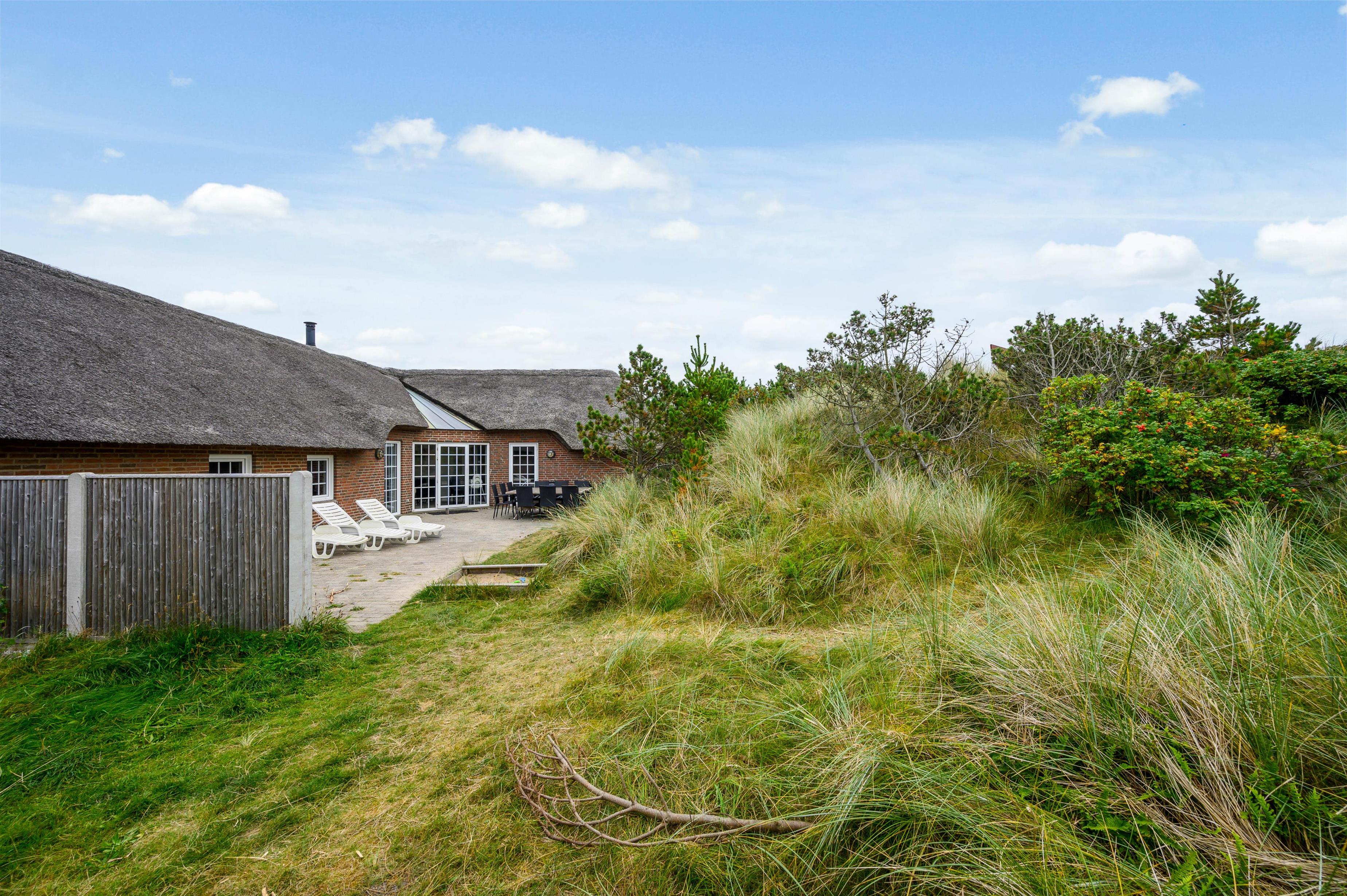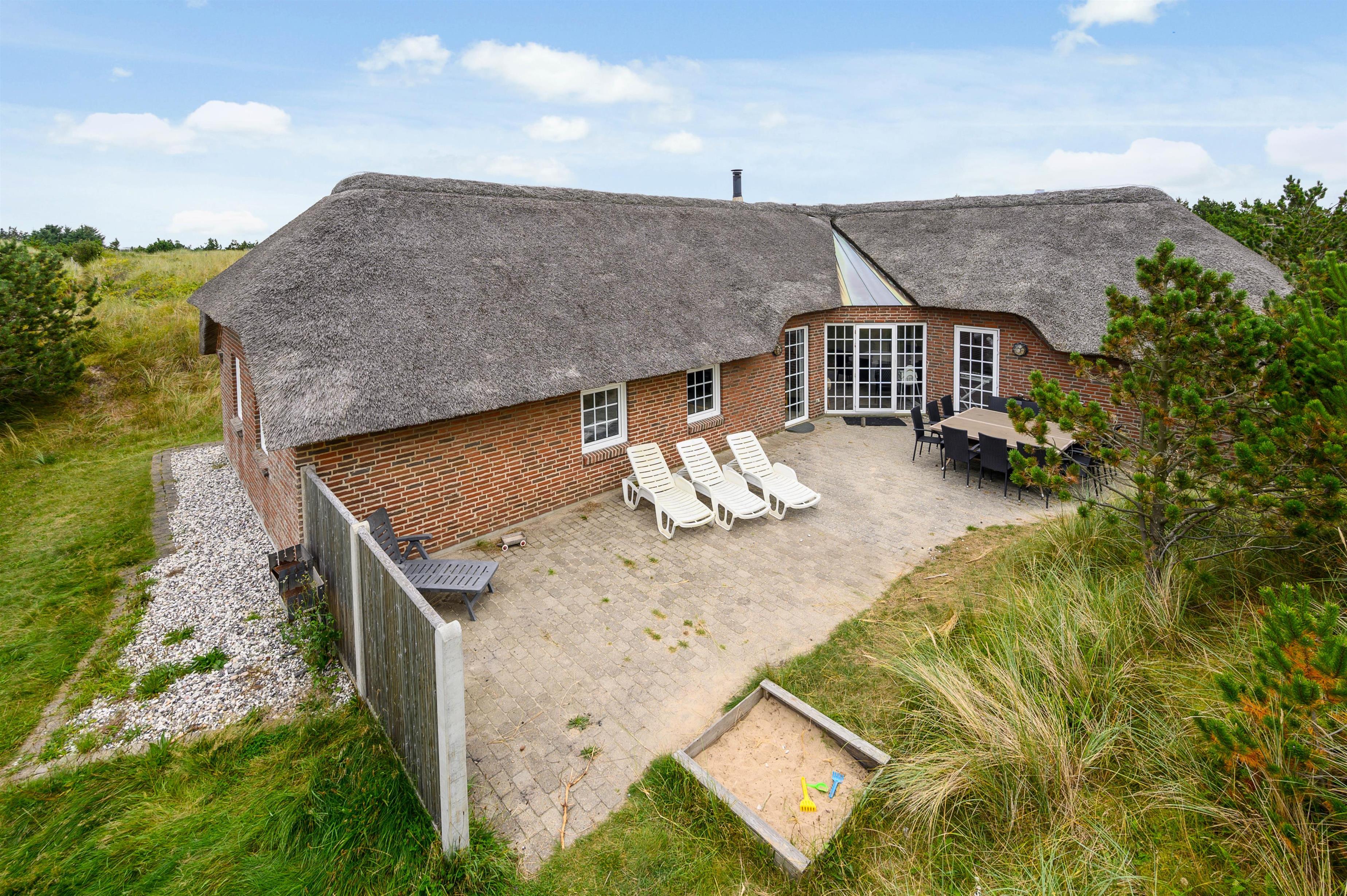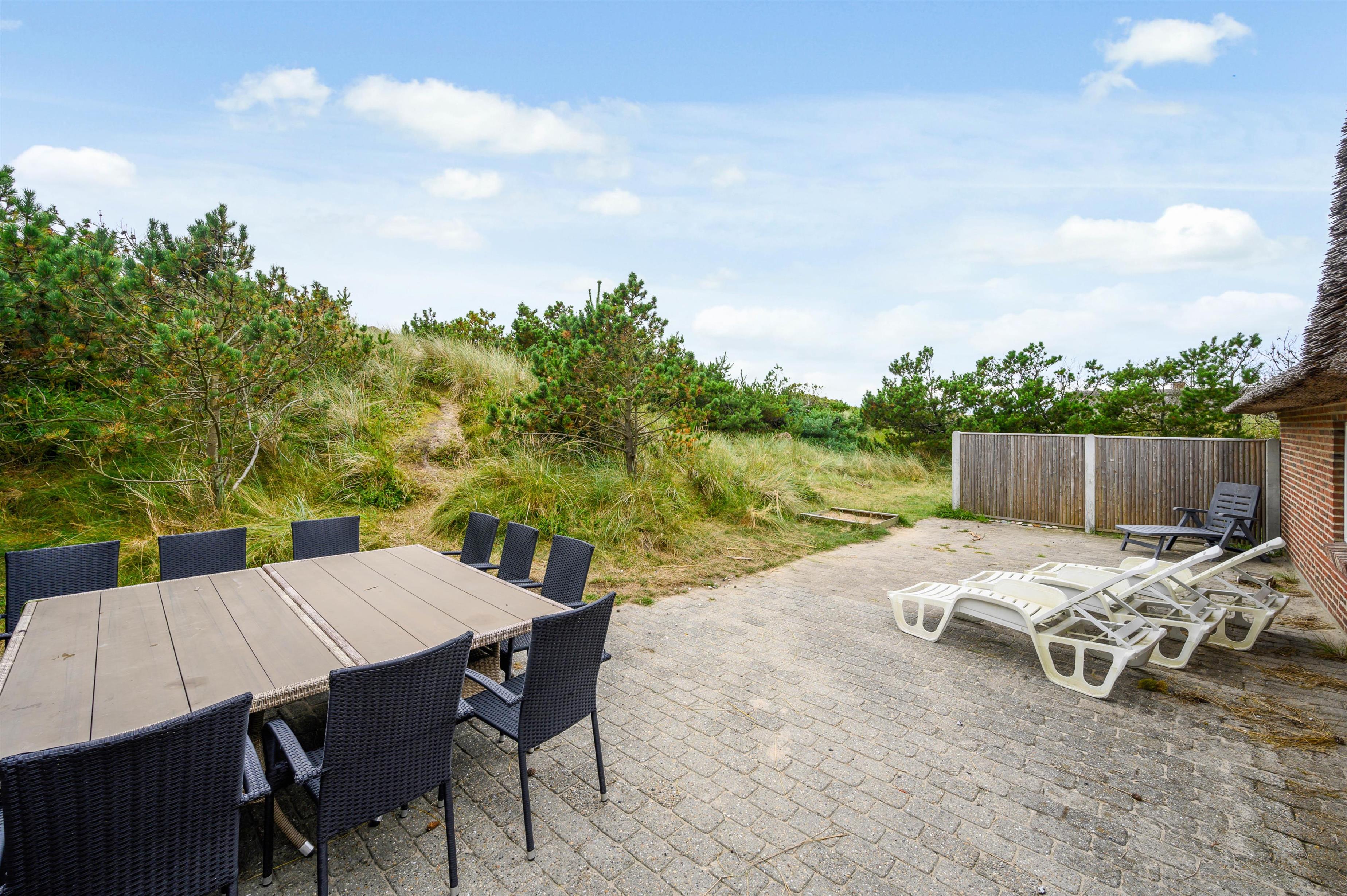 Sommerhuset har en rigtig skøn beliggenhed omgivet af høje klitbanker. Her kan I helt ugeneret nyde feriedagene på terrassen, hvor hele familien kan finde en plads i solen. På de lune sommeraftener kan I samles til en hyggelig grillmiddag, og lade børnene bygge sandslotte i sandkassen. Fra terrassen er der en direkte sti op til en rød bænk, hvor I mødes af en smuk udsigt over klitterne.
