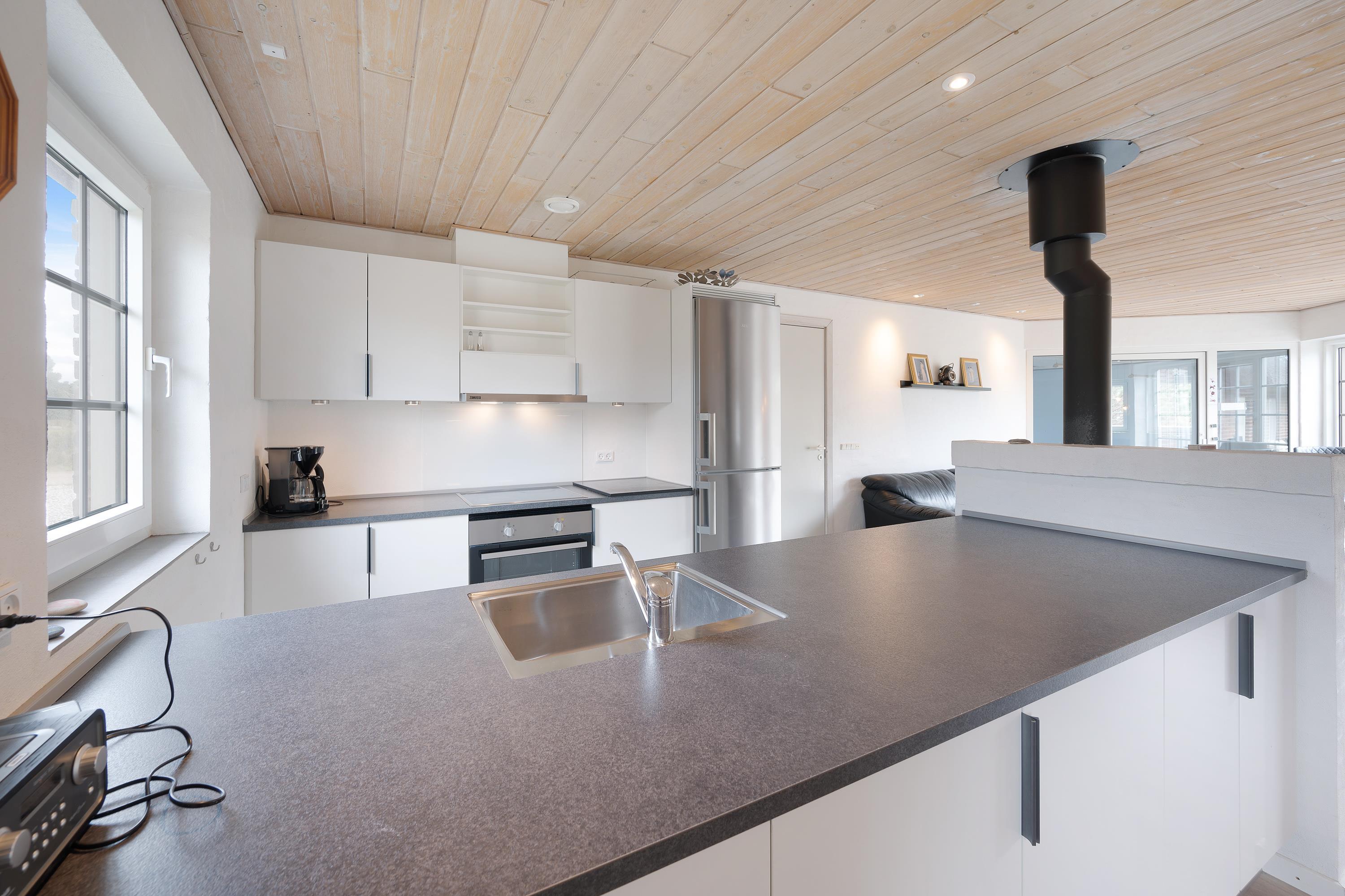 I det store fællesrum med køkken og stue kommer samværet i fokus, og der er flere små hyggekroge, hvor I kan samles til en gang kortspil eller en snak om morgendagens planer. Her kan alle I hvert fald med sikkerhed finde deres yndlingsted og slå sig ned for at slappe af. I vil helt sikkert også nyde brændeovnen, der altid er garant for at skabe en behagelig og hyggelig atmosfære.
