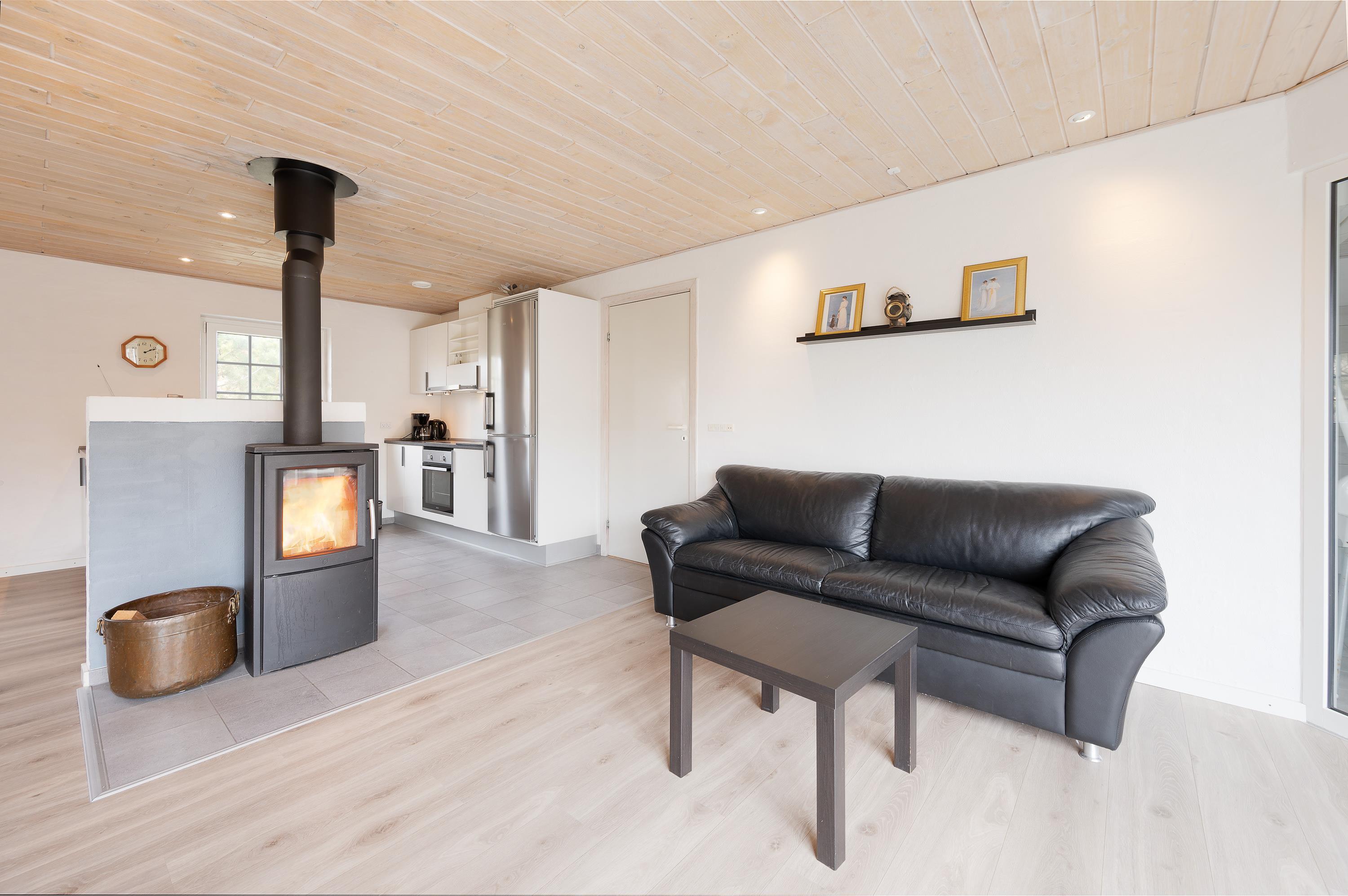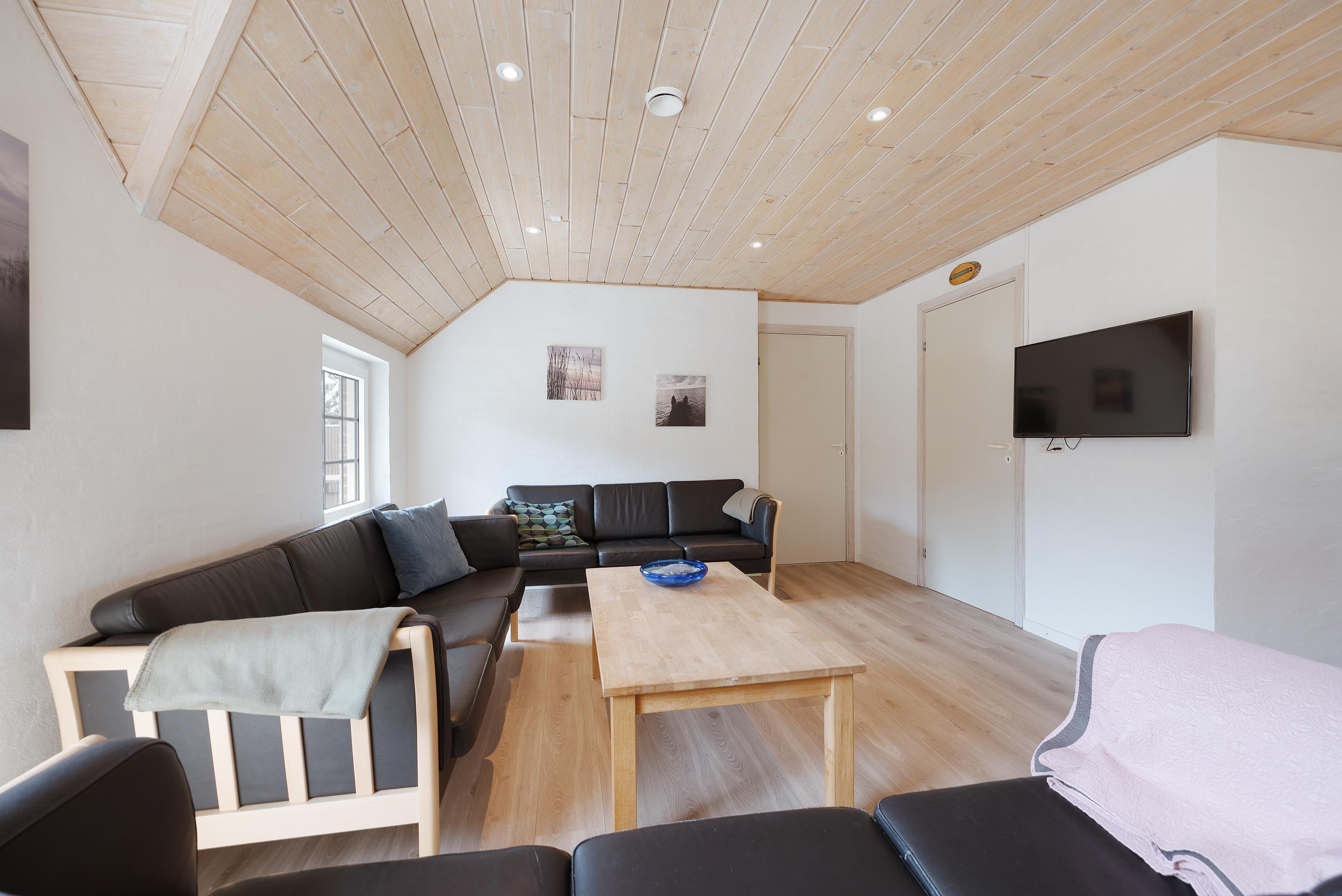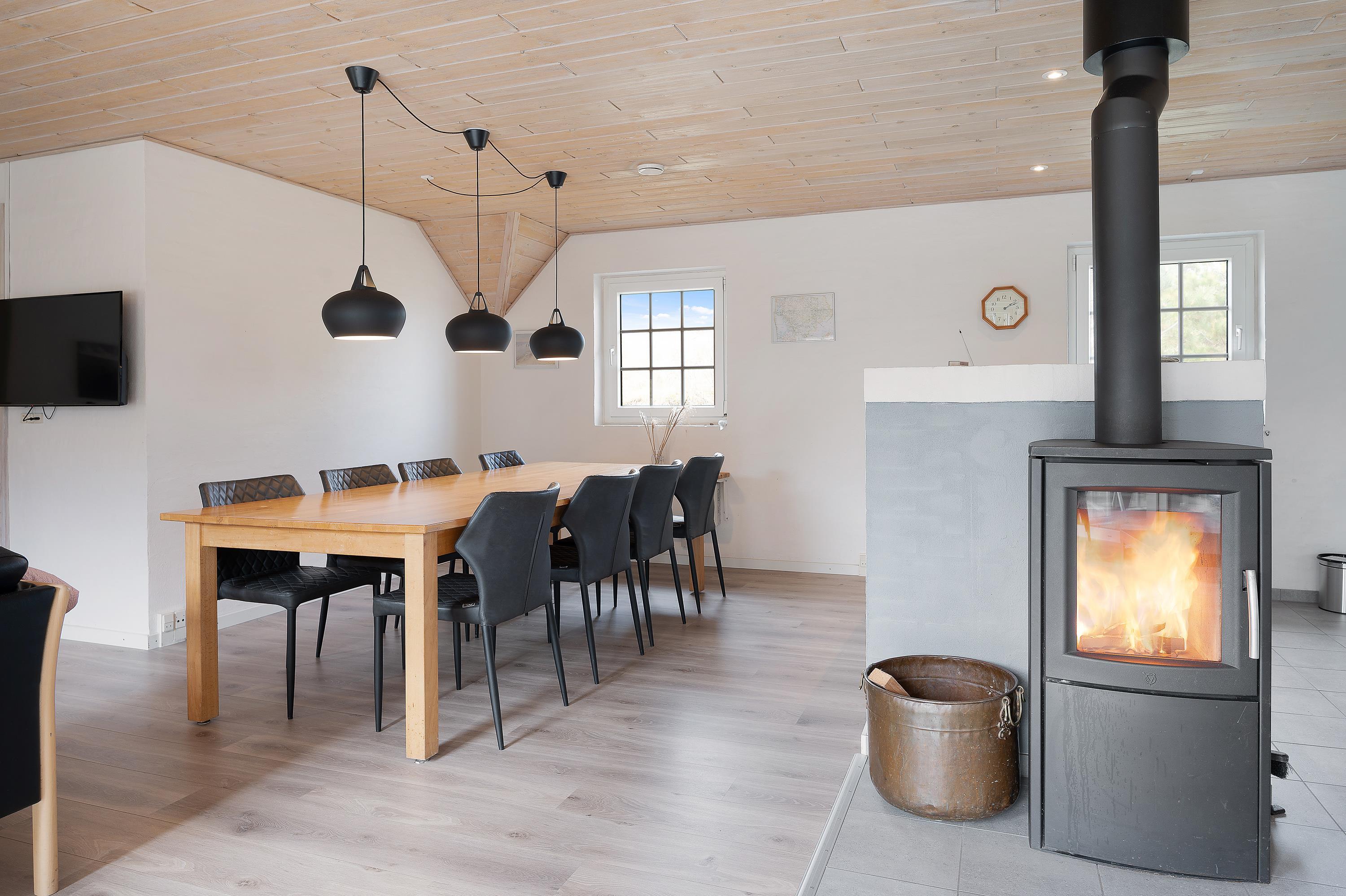 I det store fællesrum med køkken og stue er samværet i centrum, og her finder I flere hyggelige kroge, hvor I kan samles til en omgang kortspil eller en snak om morgendagens planer. Her kan alle med garanti finde deres yndlingssted og slå sig ned for at slappe af. Stuen fungerer som det naturlige samlingspunkt, hvor I også kan nyde brændeovnen, som altid bidrager til en varm og hyggelig atmosfære.