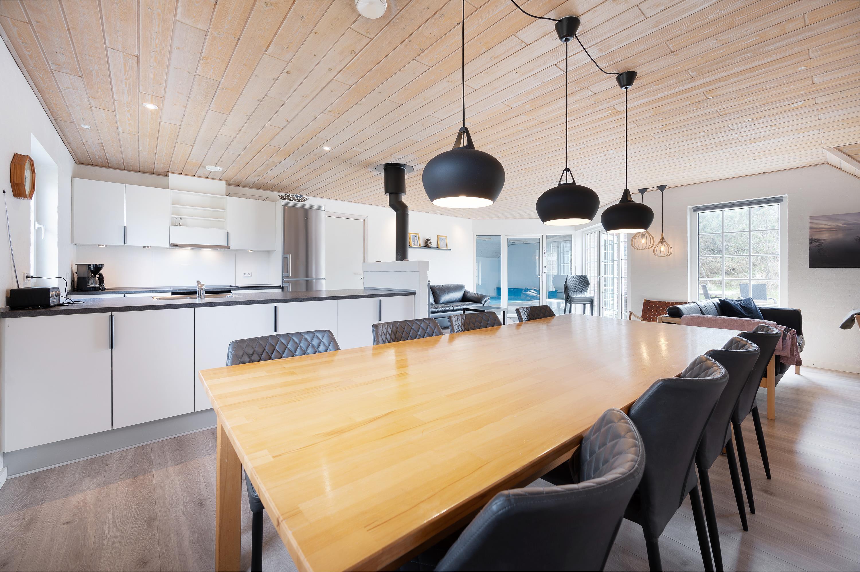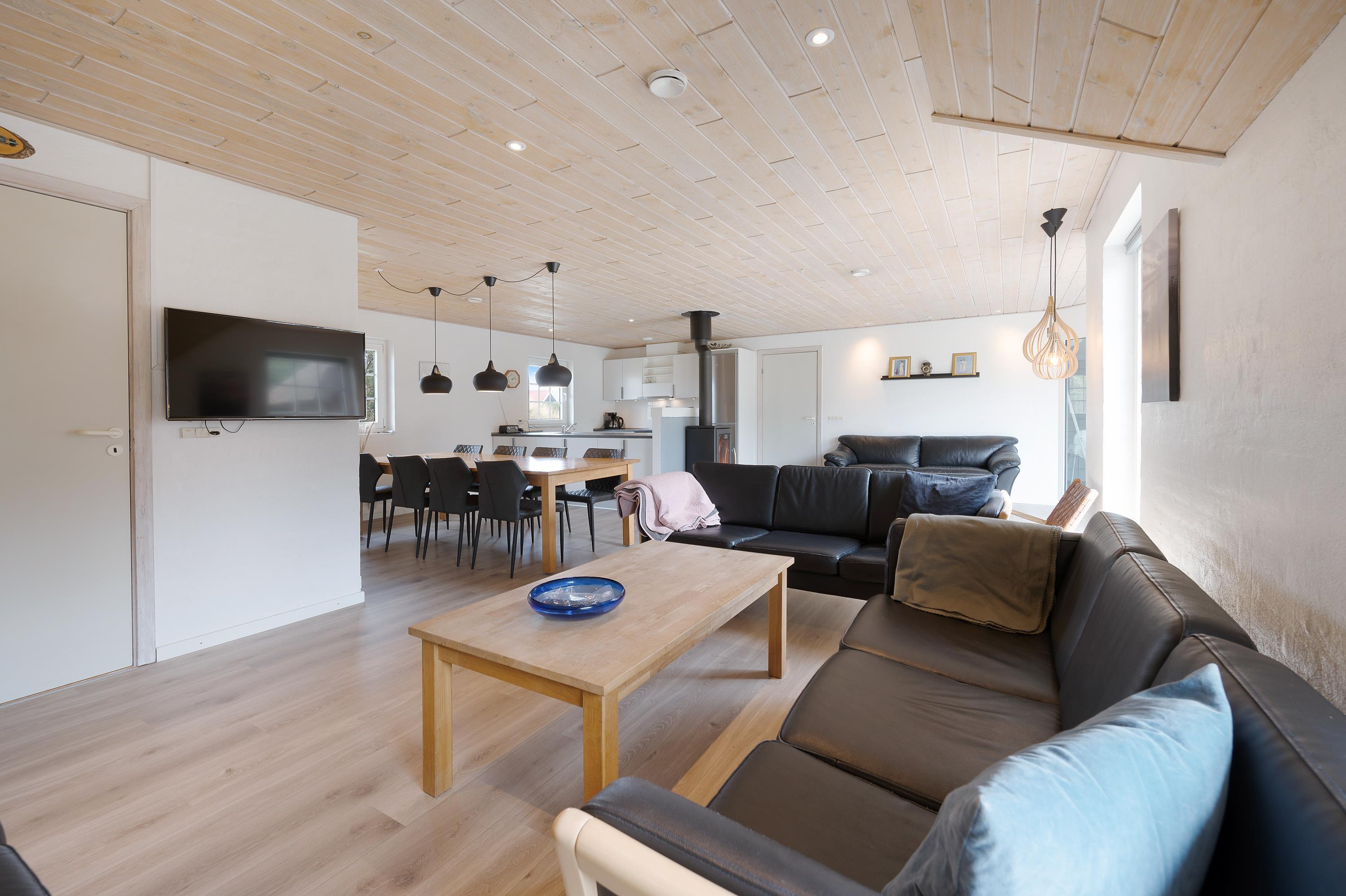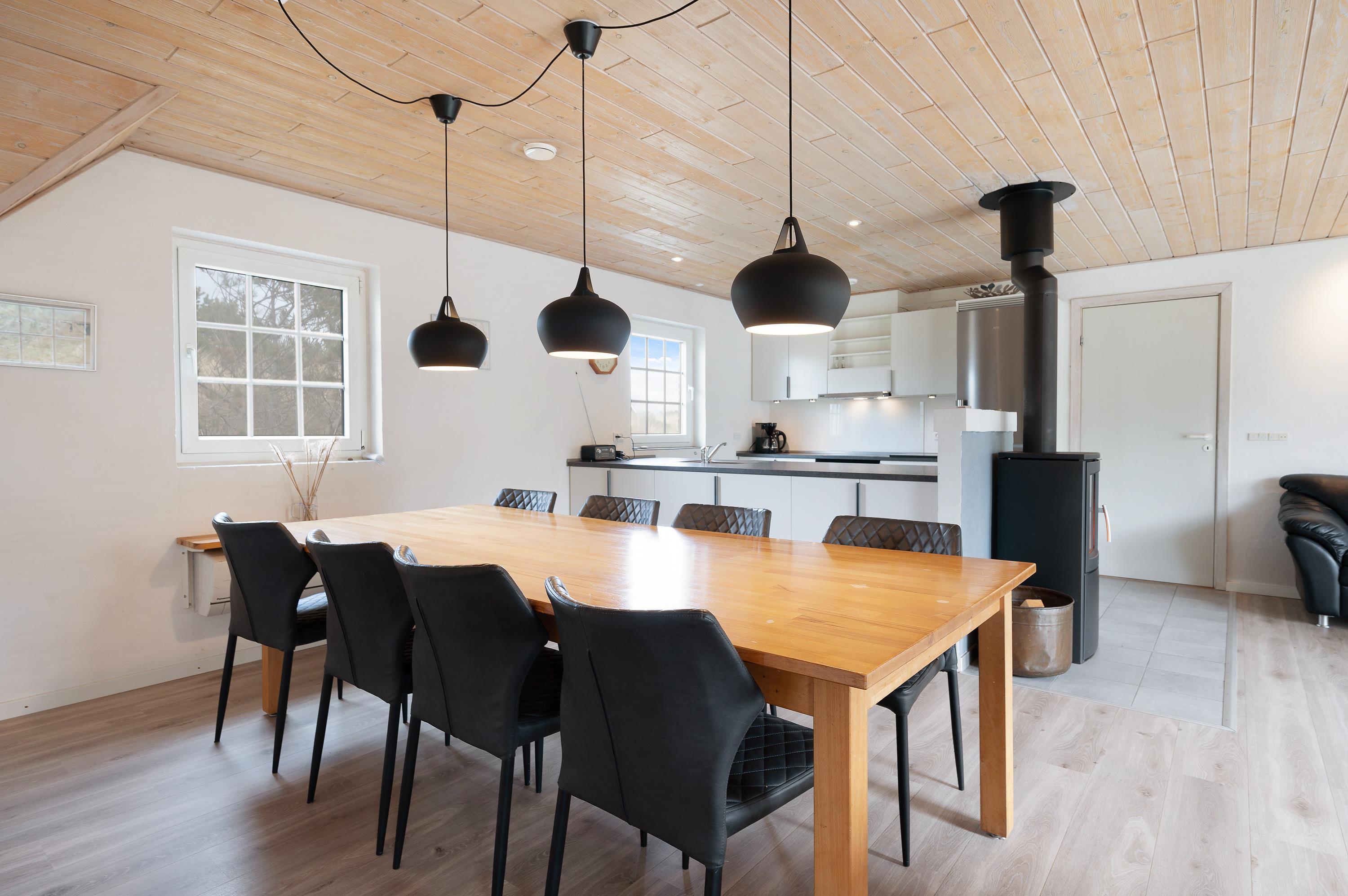 I det store fællesrum med køkken og stue er samværet i centrum, og her finder I flere hyggelige kroge, hvor I kan samles til en omgang kortspil eller en snak om morgendagens planer. Her kan alle med garanti finde deres yndlingssted og slå sig ned for at slappe af. Stuen fungerer som det naturlige samlingspunkt, hvor I også kan nyde brændeovnen, som altid bidrager til en varm og hyggelig atmosfære.