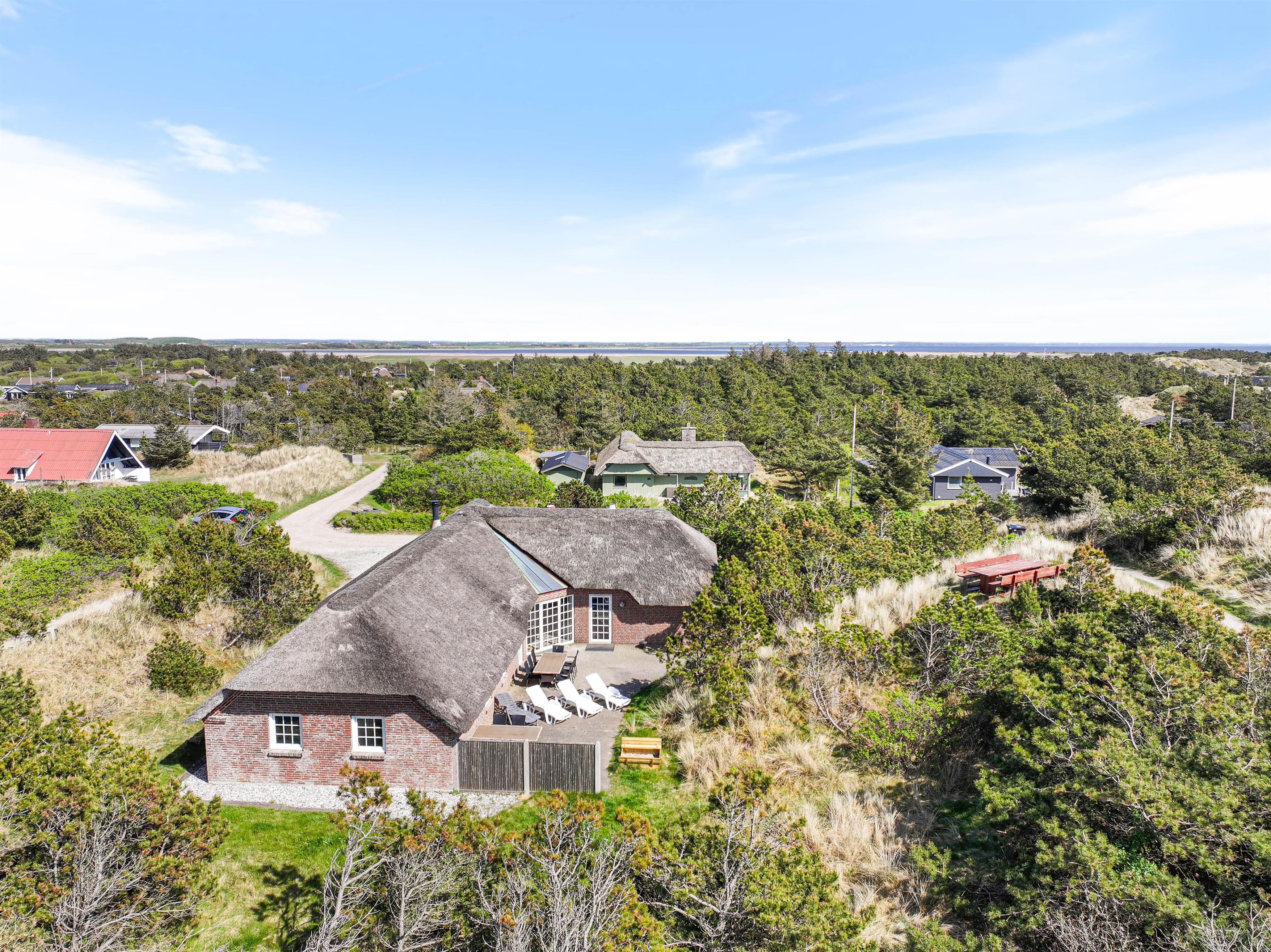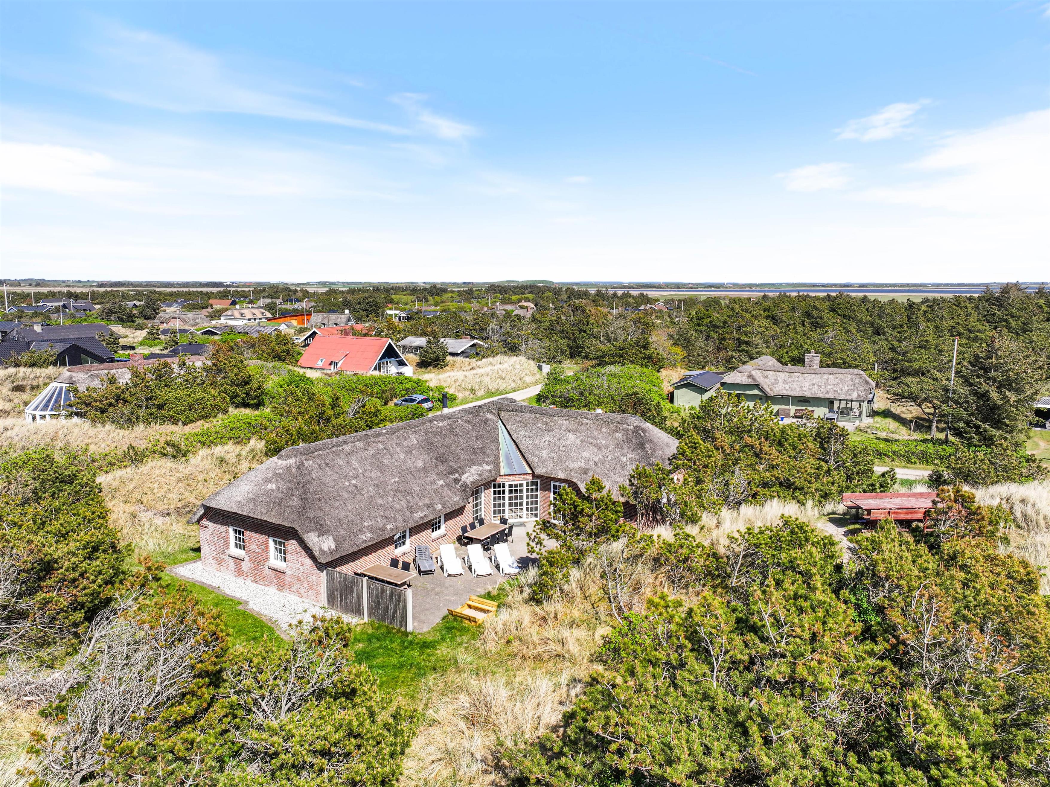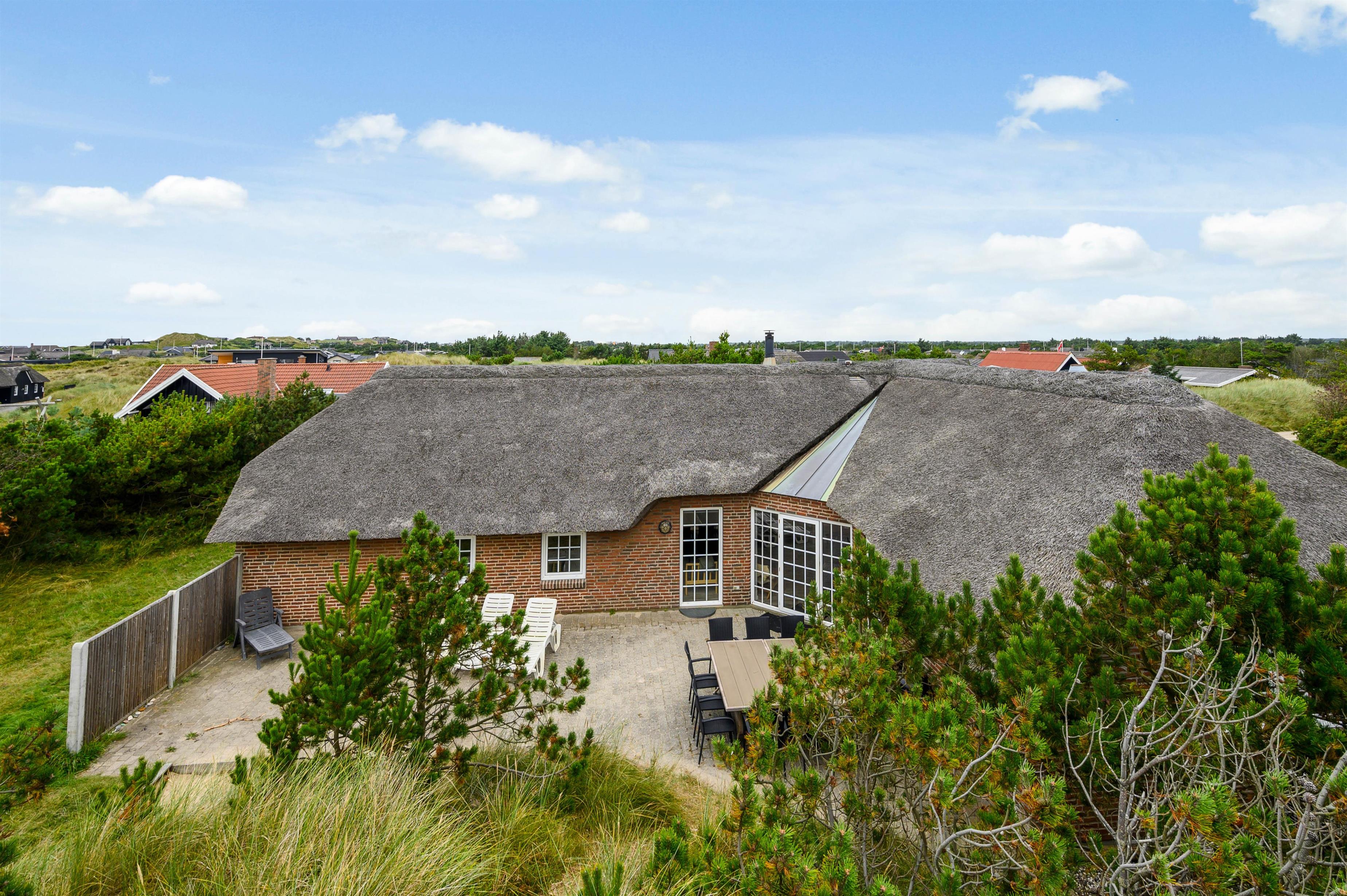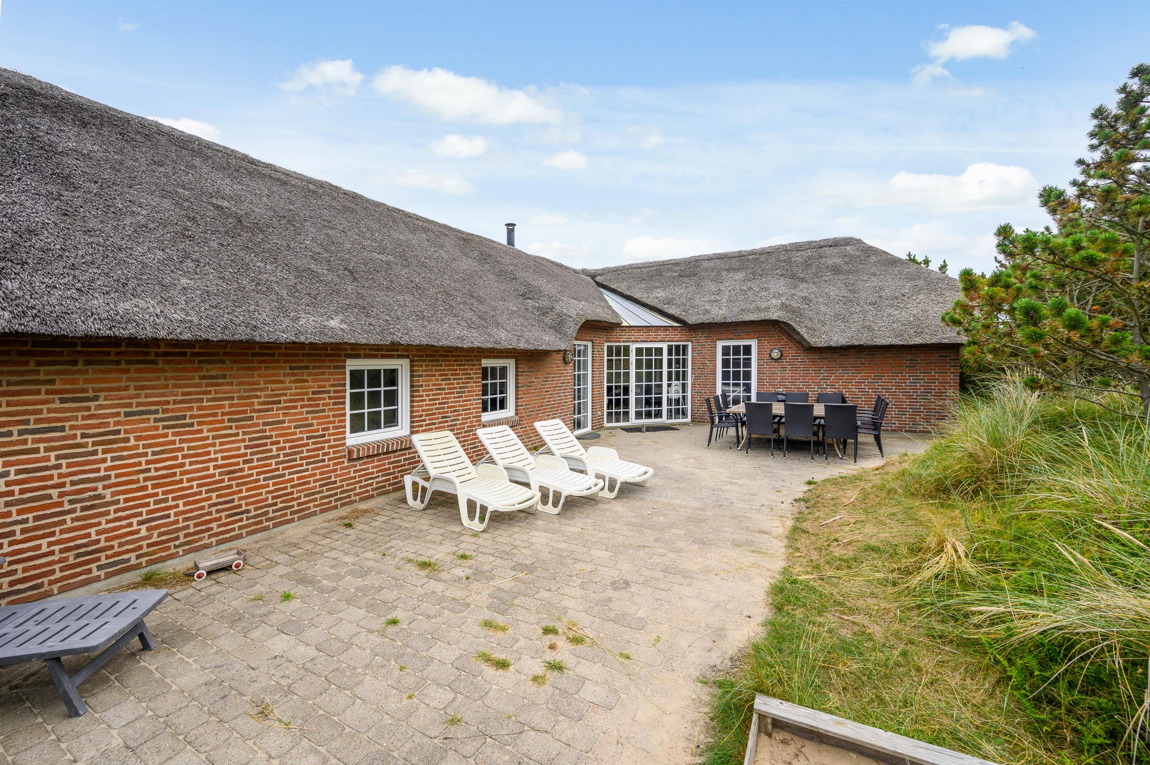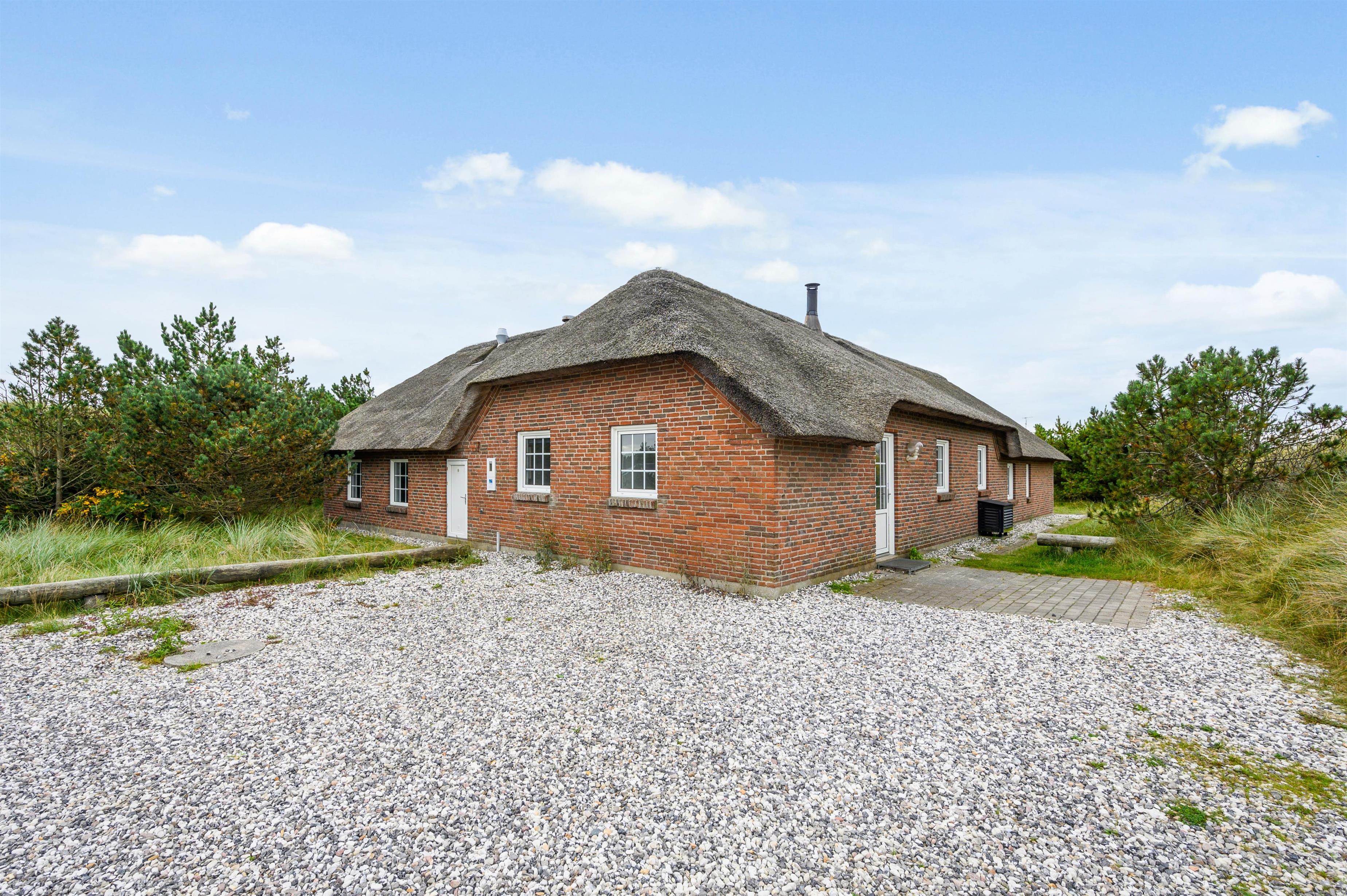 På en ugeneret plet i Søndervigs smukke klitlandskab ligger dette store poolsommerhus med plads til 12 personer. Det stråtækte sommerhus er et oplagt valg til en dejlig familieferie, og der er sørget for underholdning for alle med faciliteter som swimmingpool og sauna. Beliggenheden er rigtig skøn og fredelig - og op til to hunde er tilladt i huset.