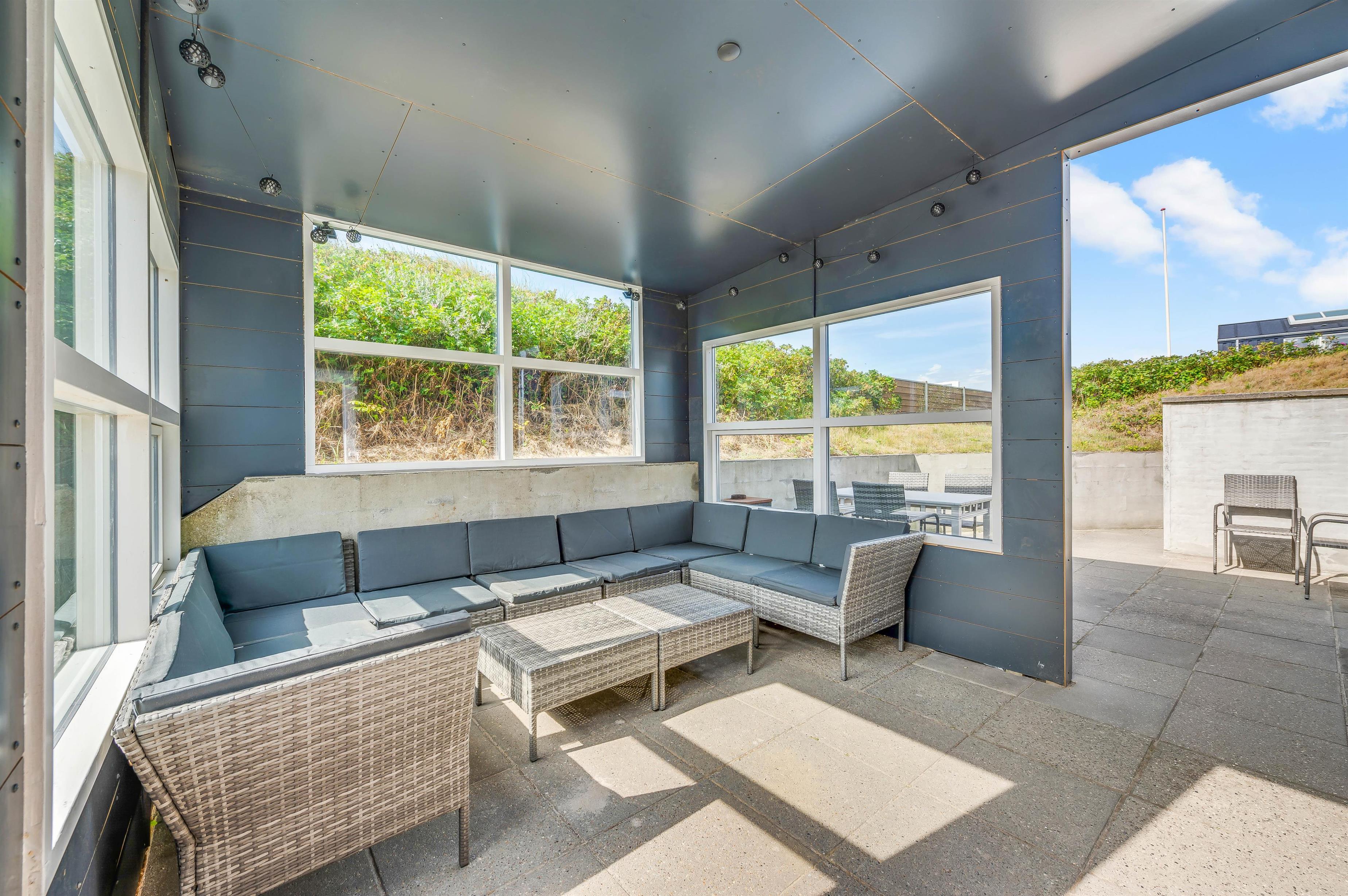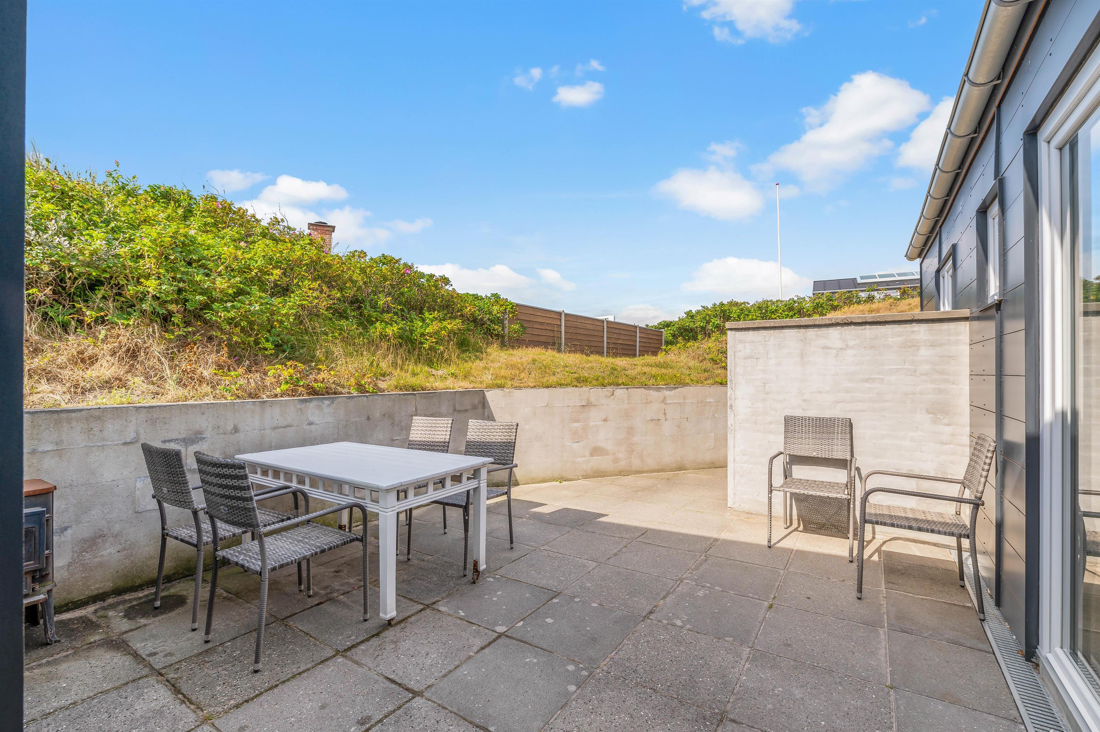 Desuden er der også en terrasse, hvor I har havemøbler og liggestole til rådighed, som I kan sætte jer til rette i på en plads i solen. En del af terrassen er overdækket og afskærmet, så I kan sidde i ly og læ. I har desuden en grill til rådighed, så I kan tilberede lækre middage, som I kan nyde på terrassen. Der er også et el-ladestik til bilen i form af et kraftstik med 380 V og 11W og 16 ampere. Vigtigt er, at man har egen ledning/kabel med.