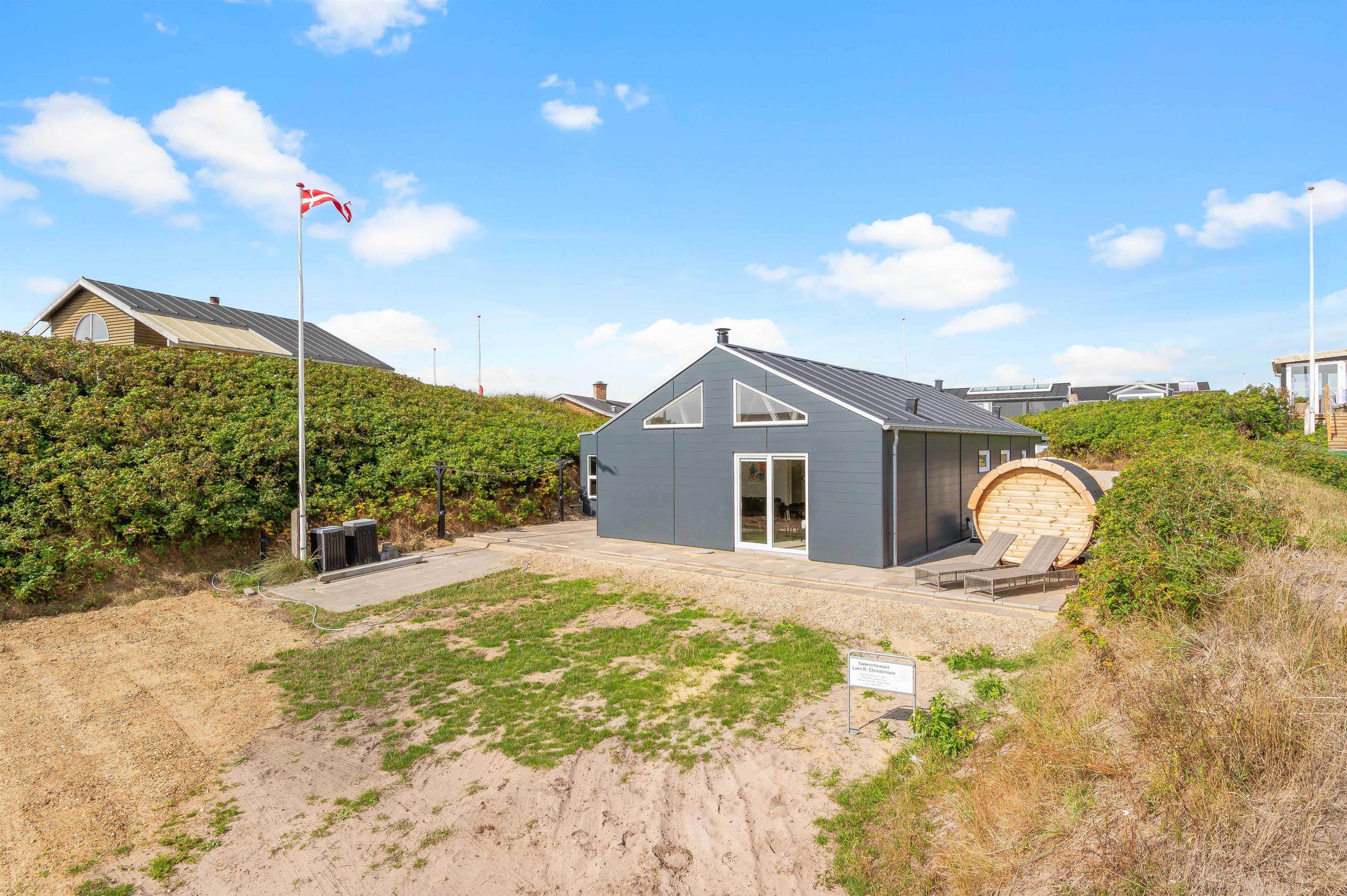 På sommerhusets udeområde kan I se frem til at nyde nogle dejlige, afslappende stunder. Her venter jer nemlig en skøn udesauna, som I kan sætte jer ind i og komme helt ned i gear i varmen. I kan også sætte jer ind i udesaunaen efter en tur ved stranden. Hvis I har været på stranden, kan I skylle det sidste sand af tæerne under udebruseren. Udebruseren må ikke benyttes fra i perioden fra november til april.
