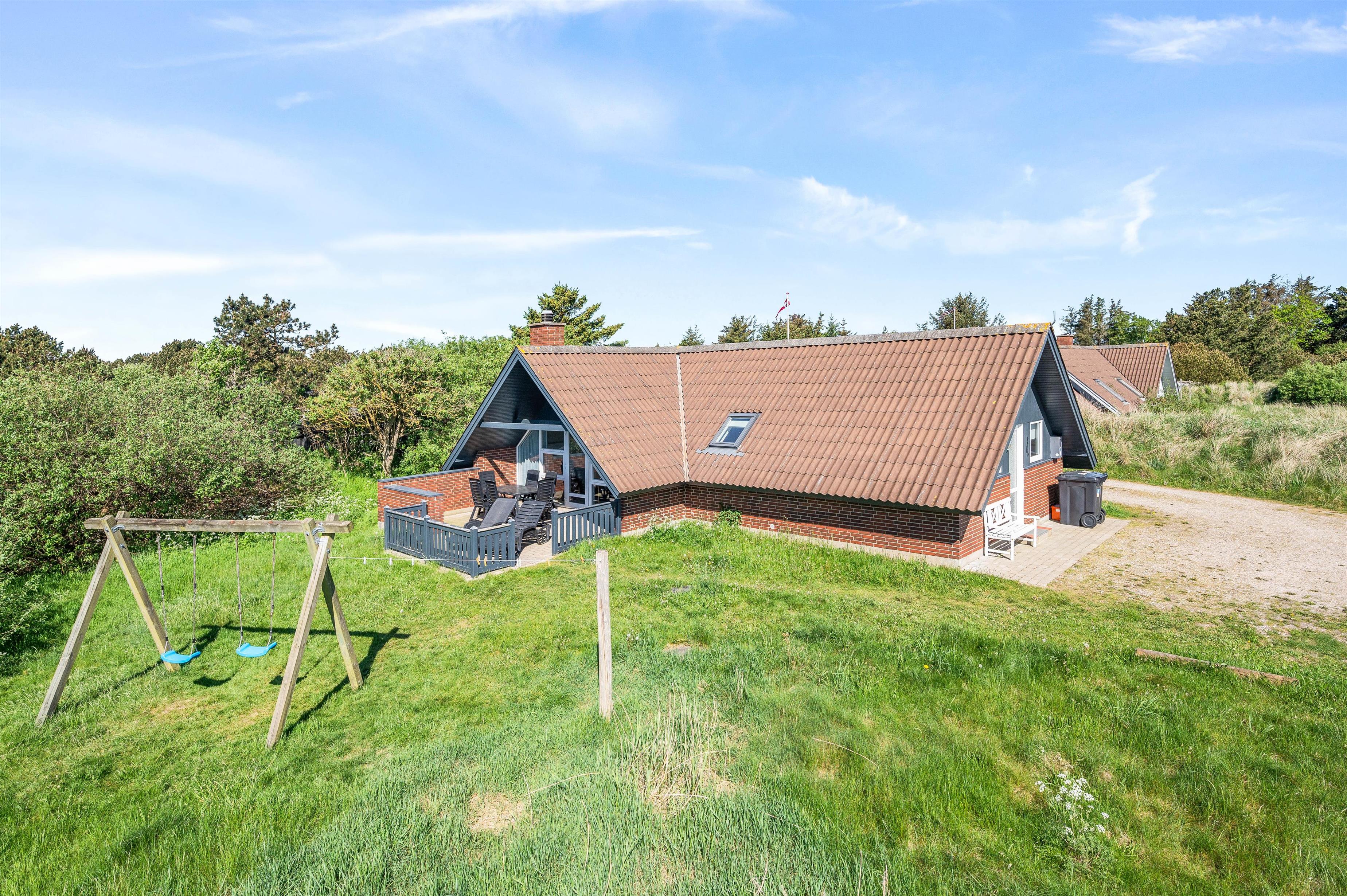 Dette sommerhus tæt på Søndervig er beliggende på en rummelig 2000m2 naturgrund, hvor du kan nyde frisk luft og det smukke landskab. Terrassen er afskærmet og udstyret med havemøbler, perfekt til afslappende måltider udendørs. For de yngste gæster tilbyder huset en gynge, der vil holde dem beskæftiget og underholdt i timevis.