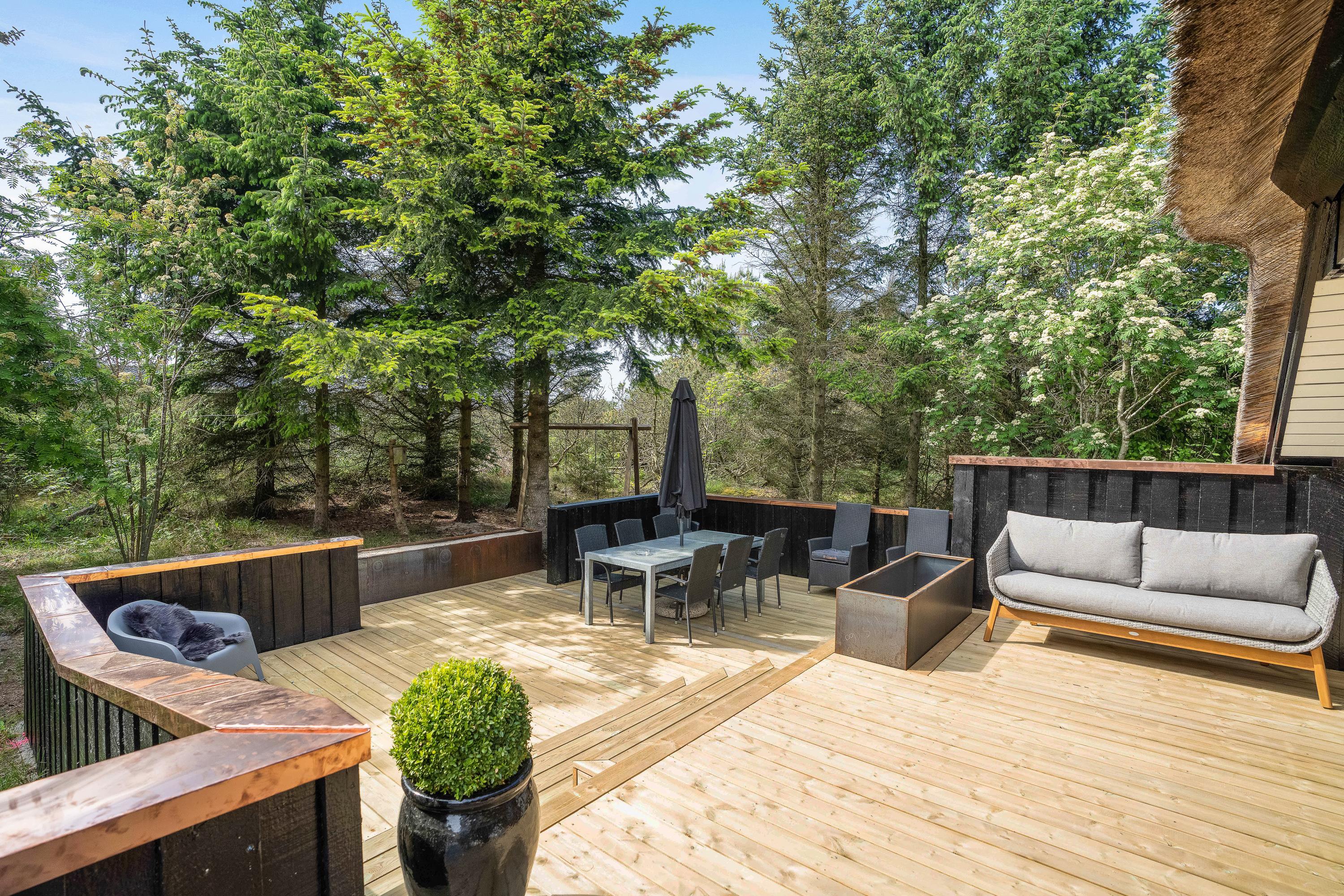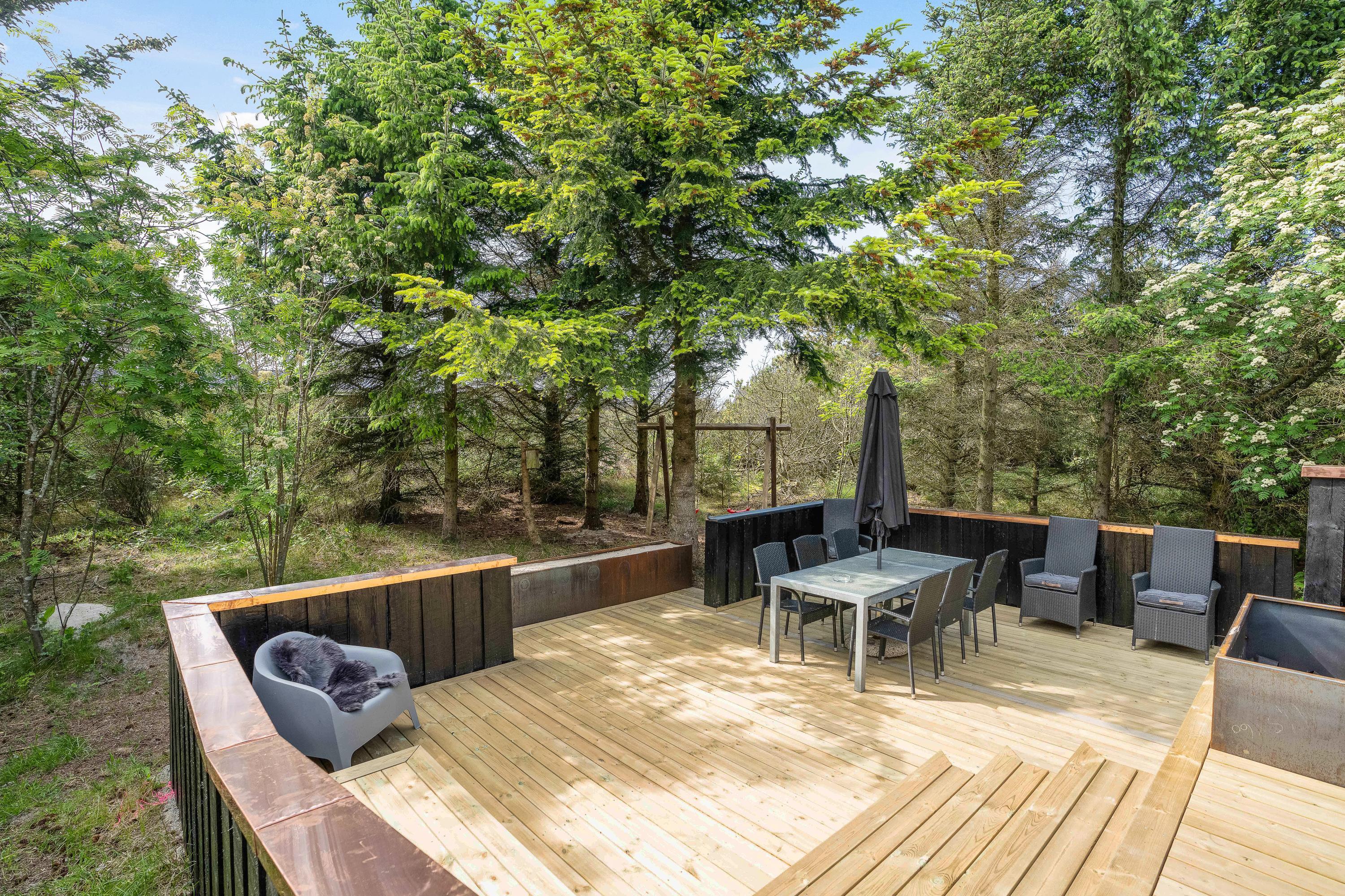 Sommerhuset ligger på en godt 3000m2 stor naturgrund i grønne omgivelser, totalt omgivet af træer. Der er virkelig dømt sommerhusstemning i feriehuset her, som er omgivet af store nybyggede terrasser, hvor I virkelig kan få slappet af og lade batterierne op.