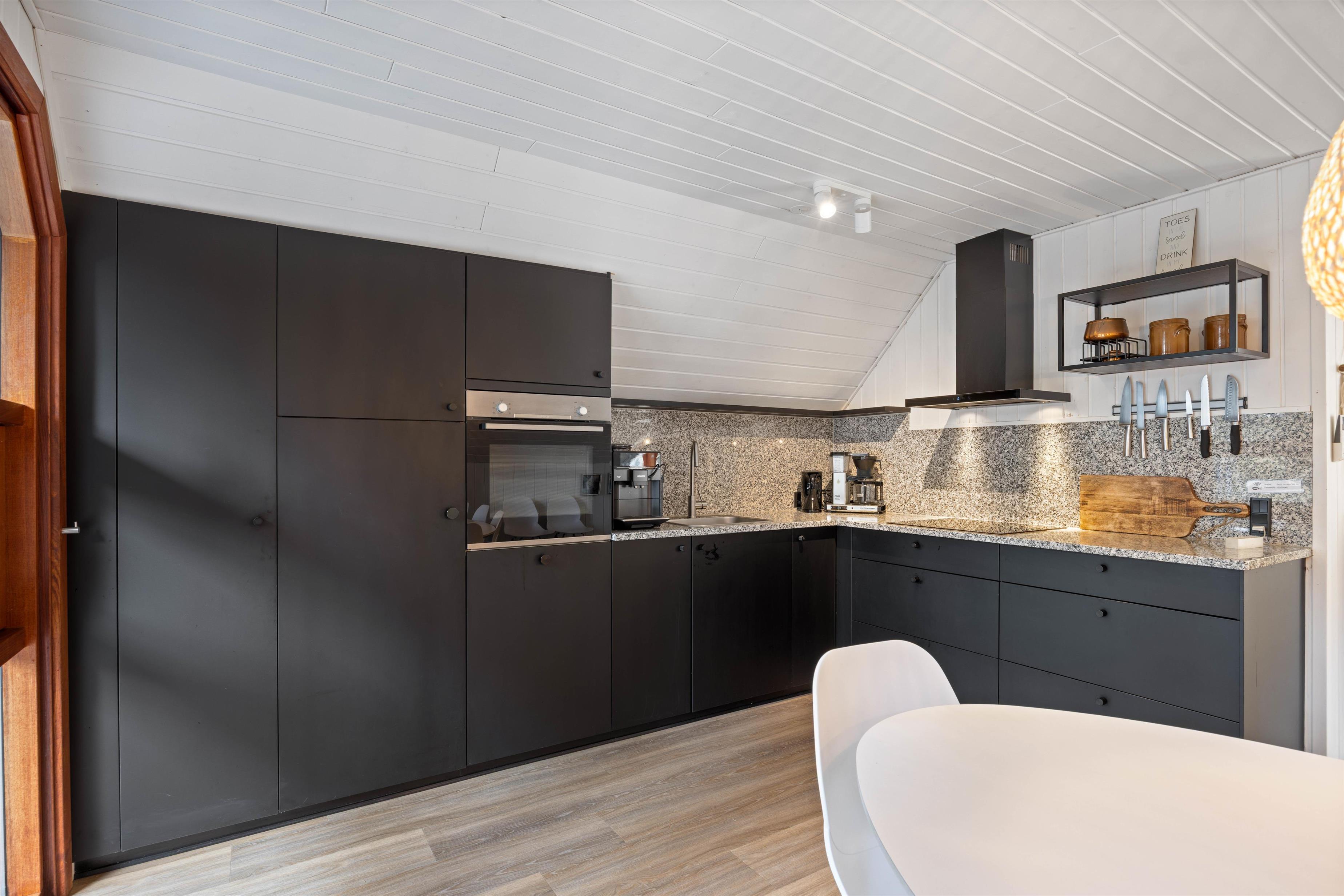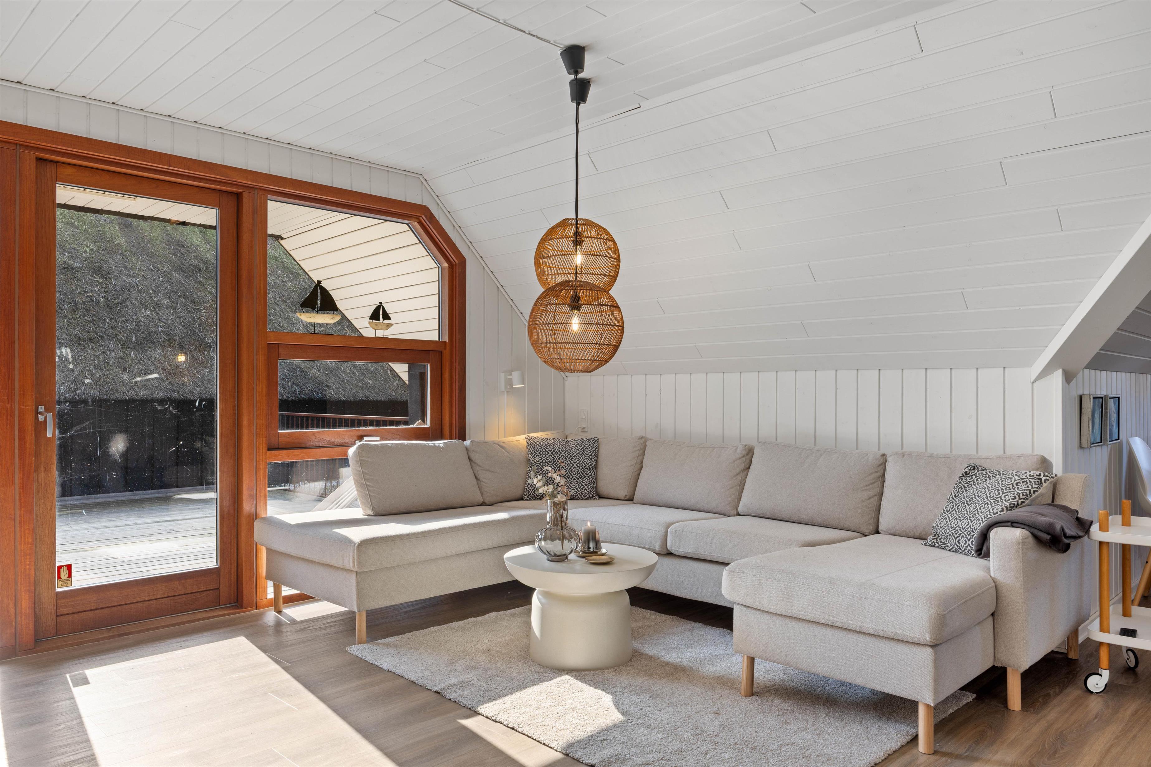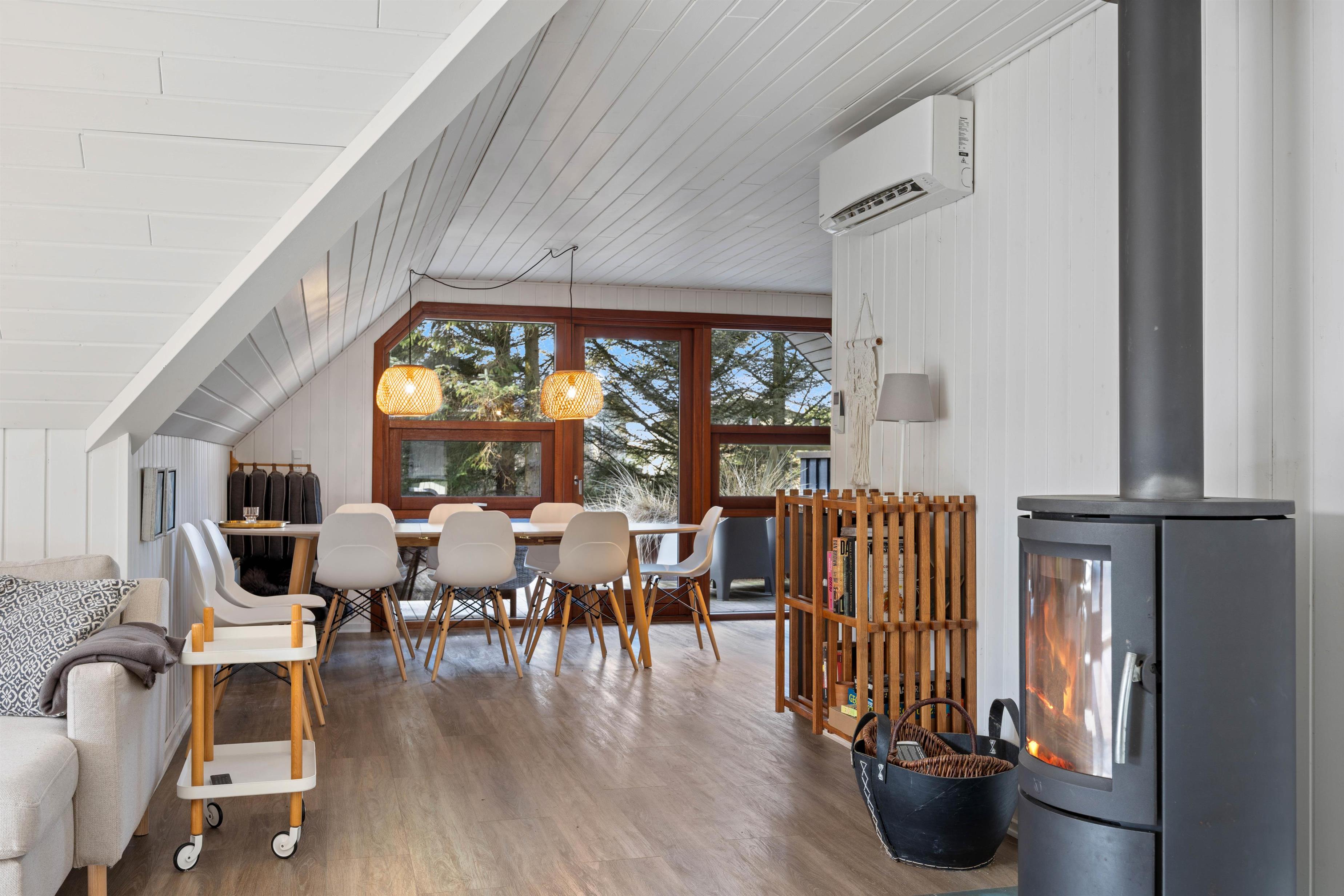 Sommerhuset er blevet renoveret i 2021, fremstår lyst og pænt og oser af sommerhusstemning og hygge, så snart man træder ind ad døren. Det er beklædt med hvide træpaneler og lofter og smukke trægulve. Indenfor er der et nyere køkken i åben forbindelse med stuen og med direkte udgang til den dejlige terrasse. På køligere dage sørger både brændeovnen i stuen og varmepumpen for, at I ikke fryser om fødderne. Der er gratis internet, fladskærms tv og Chromecast i feriehuset.