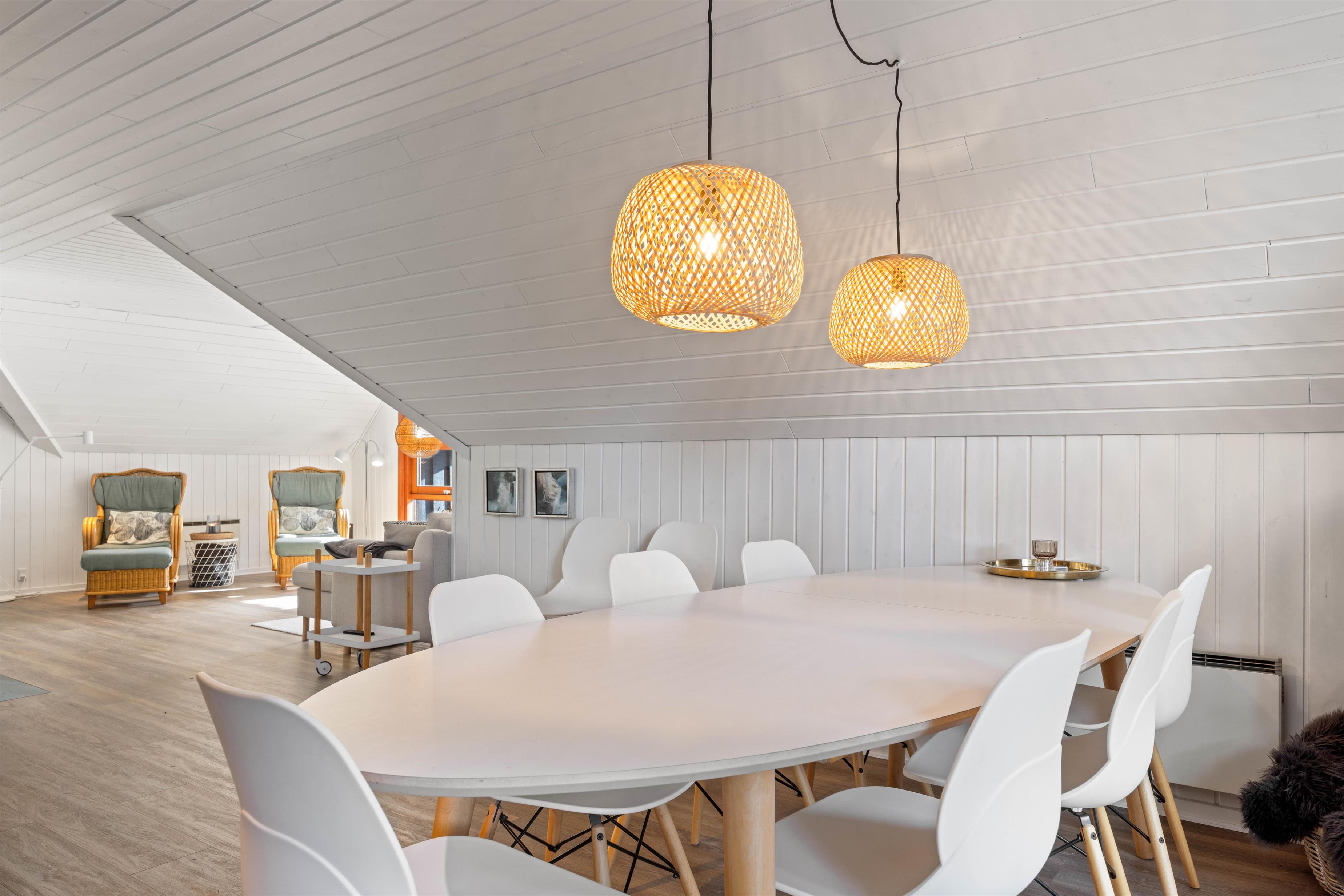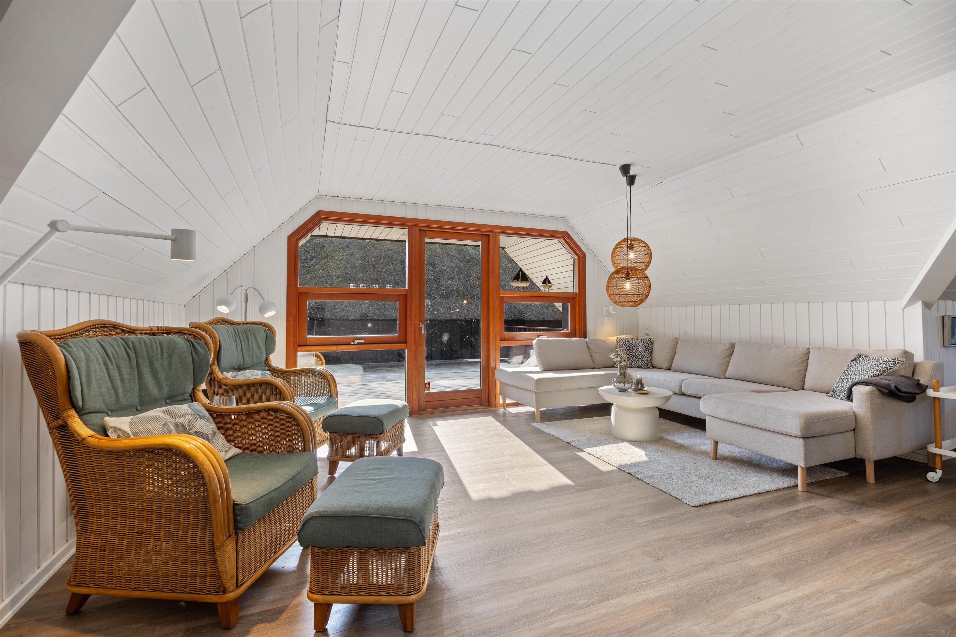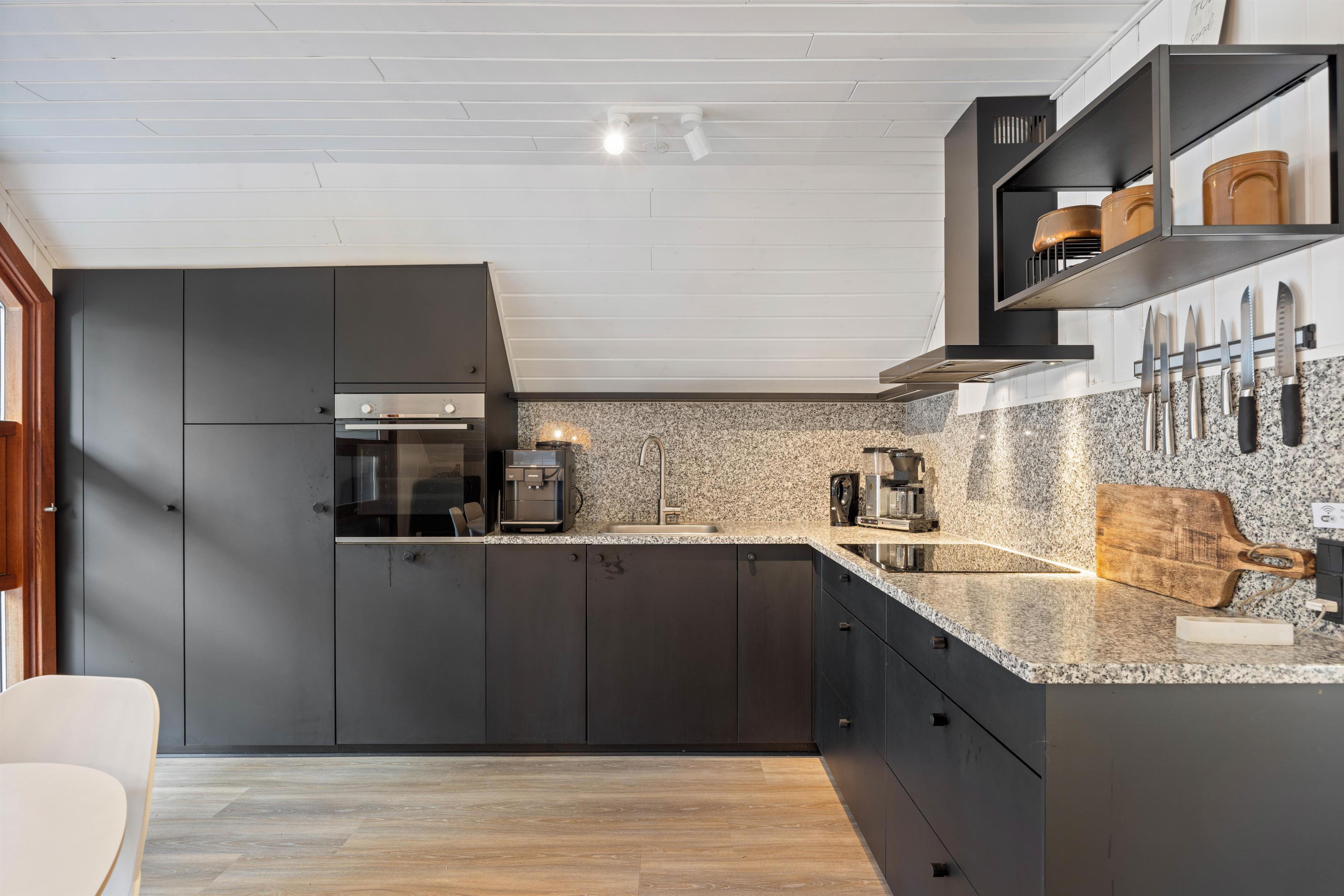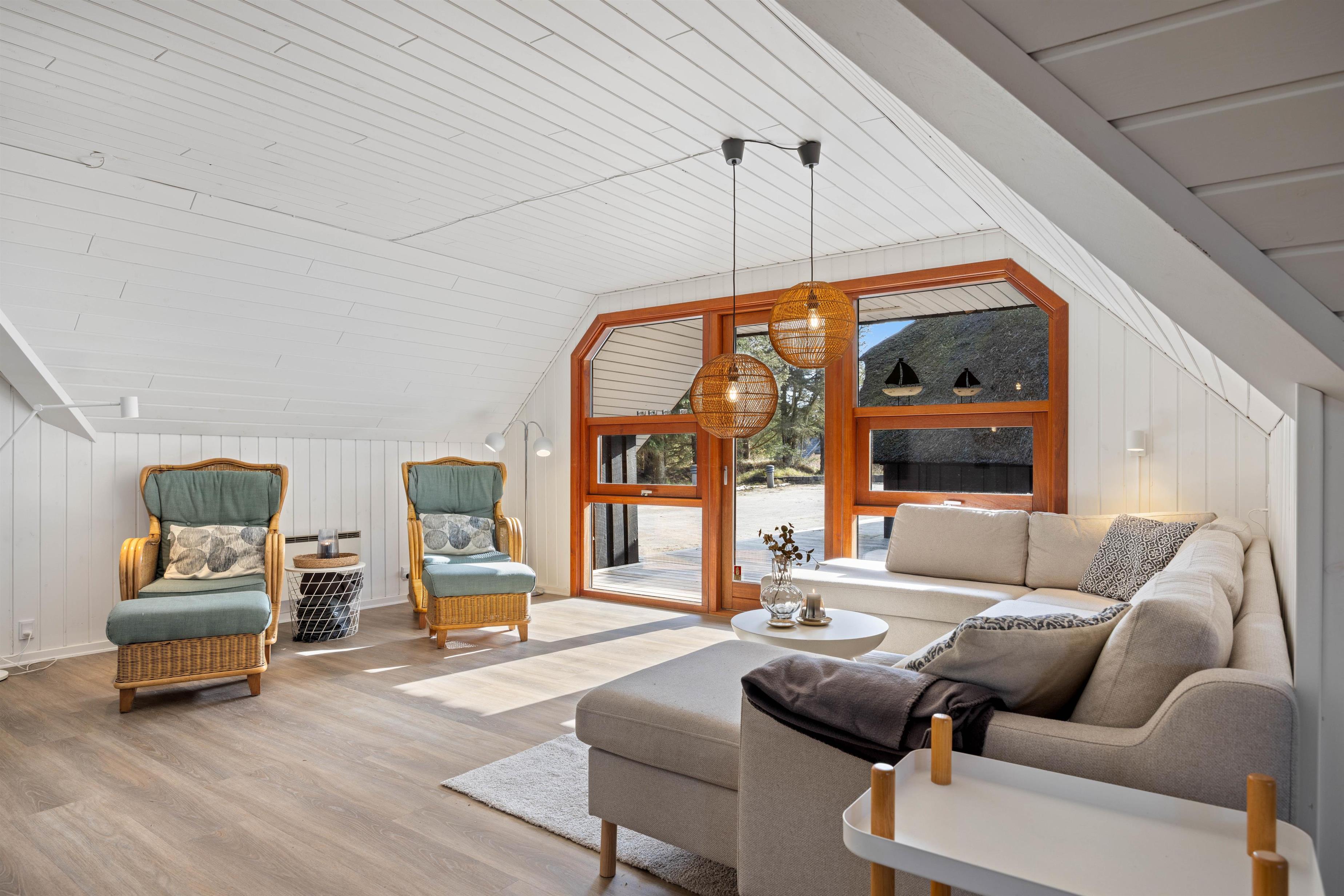 Sommerhuset er blevet renoveret i 2021, fremstår lyst og pænt og oser af sommerhusstemning og hygge, så snart man træder ind ad døren. Det er beklædt med hvide træpaneler og lofter og smukke trægulve. Indenfor er der et nyere køkken i åben forbindelse med stuen og med direkte udgang til den dejlige terrasse. På køligere dage sørger både brændeovnen i stuen og varmepumpen for, at I ikke fryser om fødderne. Der er gratis internet, fladskærms tv og Chromecast i feriehuset.