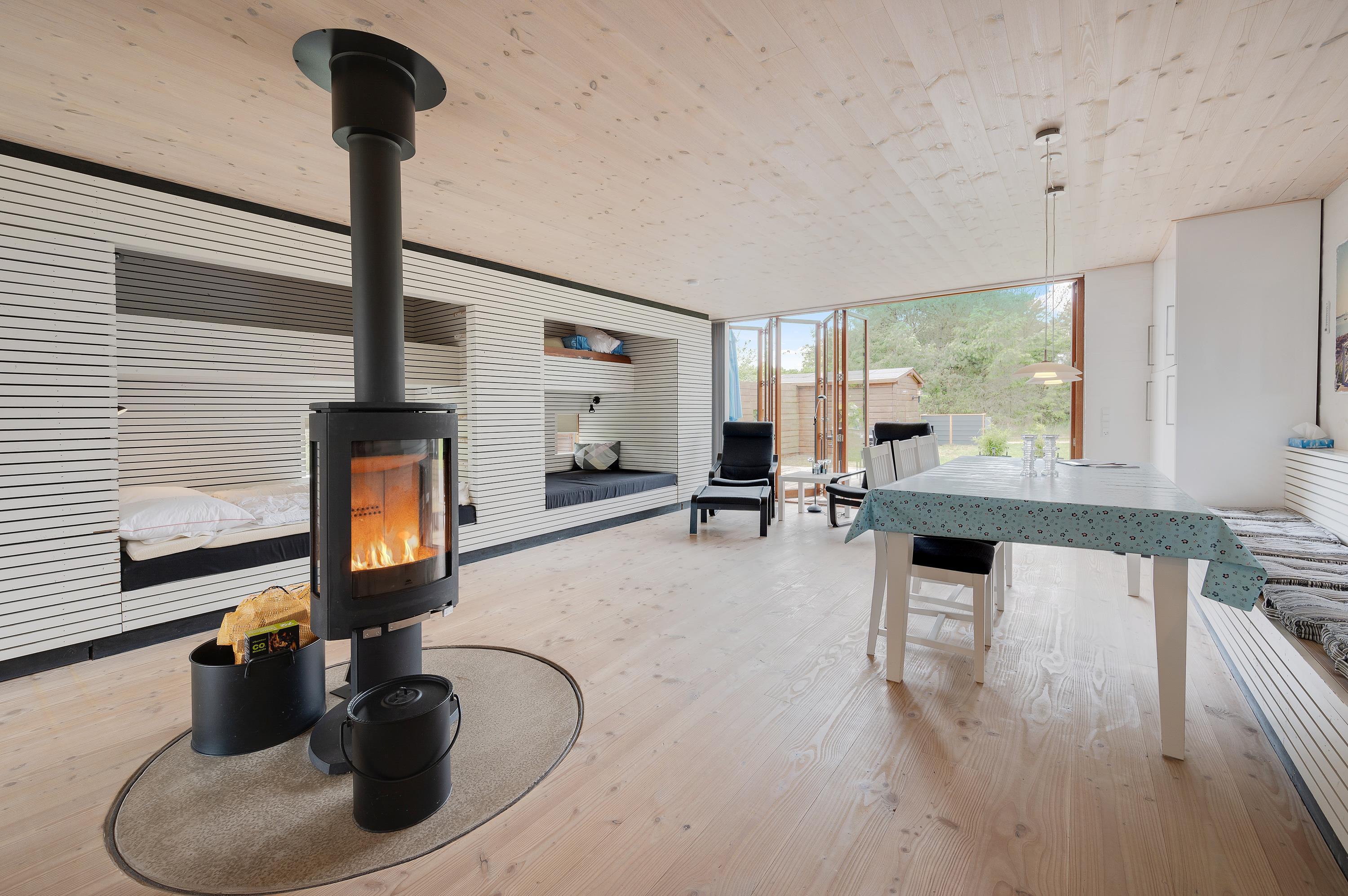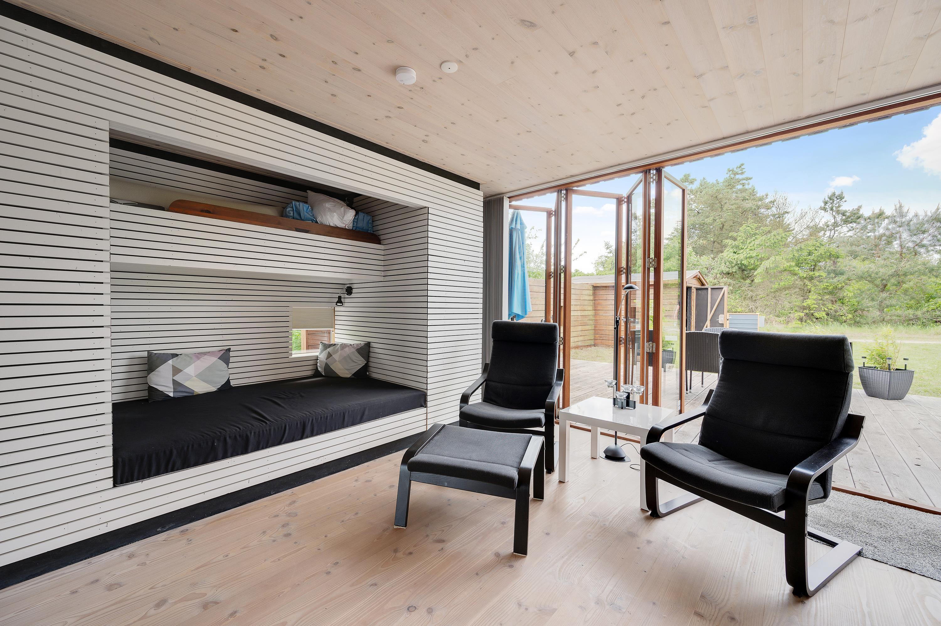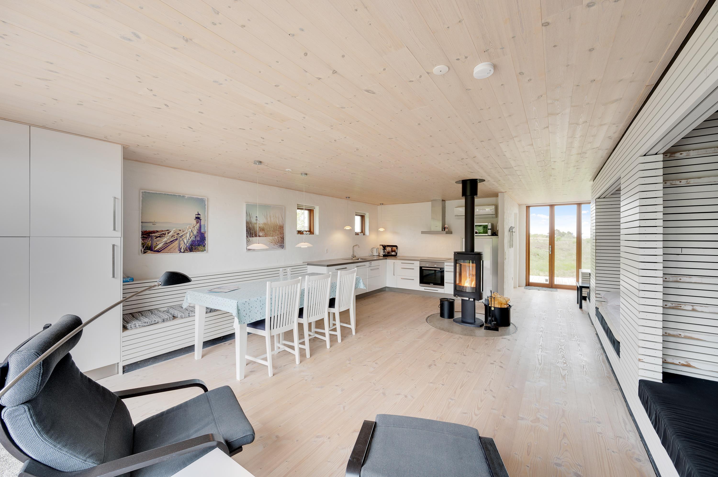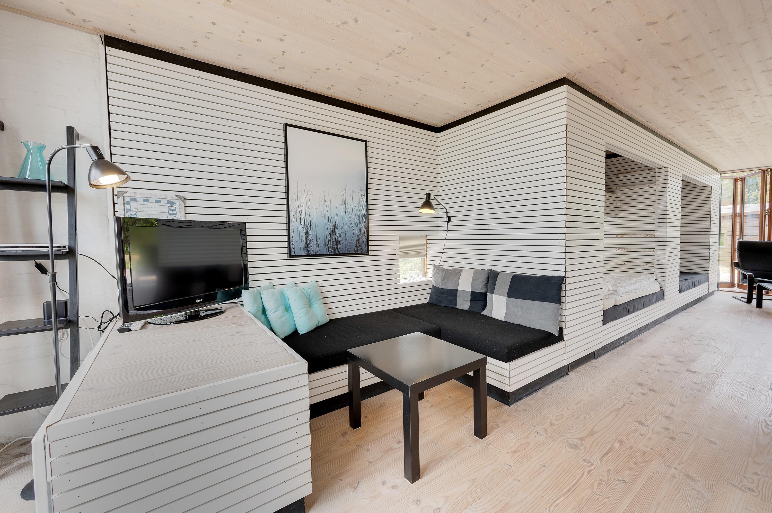 Mod øst er der et hyggeligt sofahjørne med fladskærms-tv med Allente, dog er der ikke noget internet i feriehuset. Herfra har I direkte udgang til den østvendte morgenterrasse og den kuperede naturgrund. I det store alrum mod vest er køkken, spiseplads og sovealkover samlet. I kan åbne hele det store vinduesparti op, således I kan træde ud på terrassen og nyde en ildrød solnedgang.