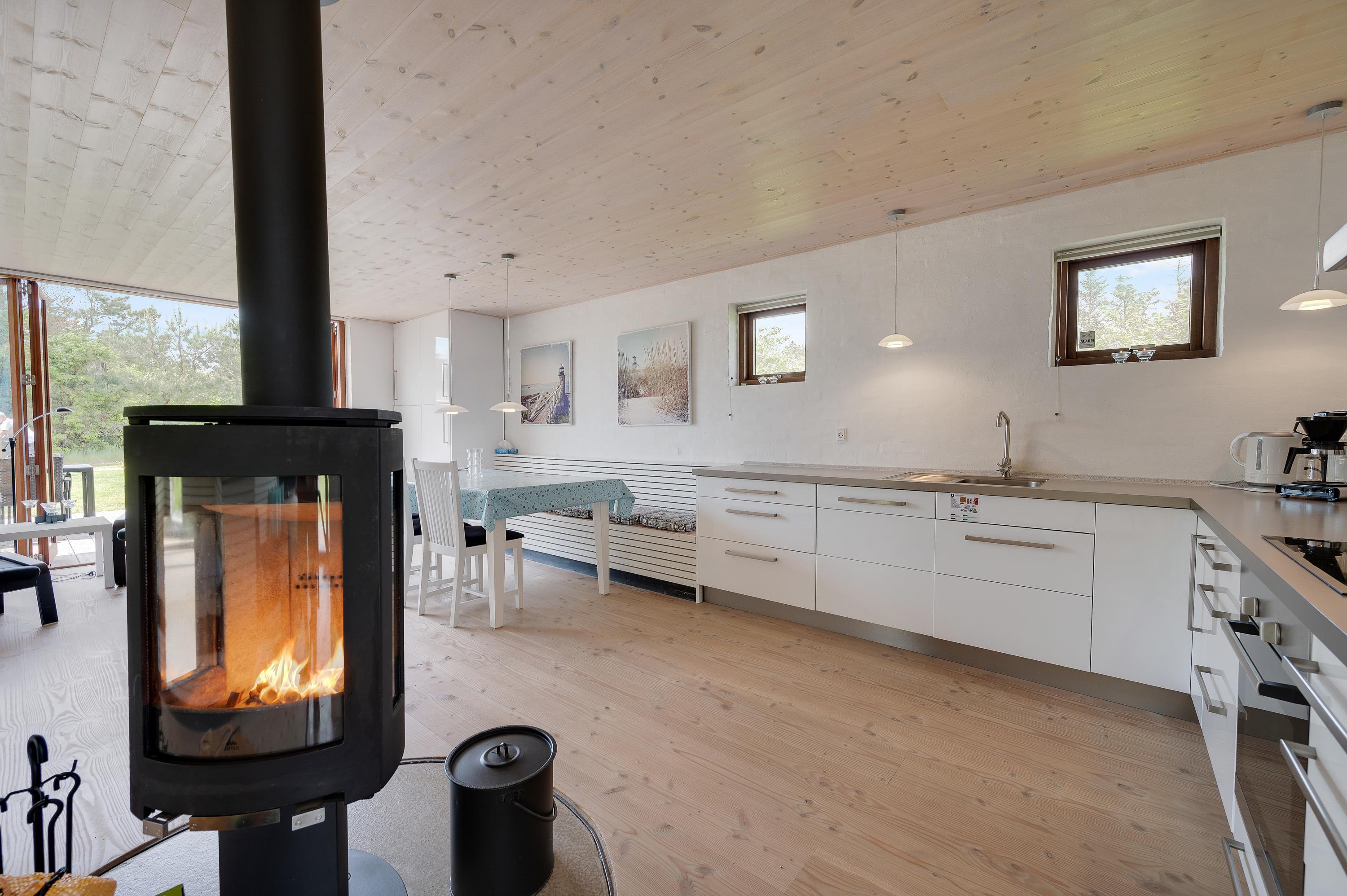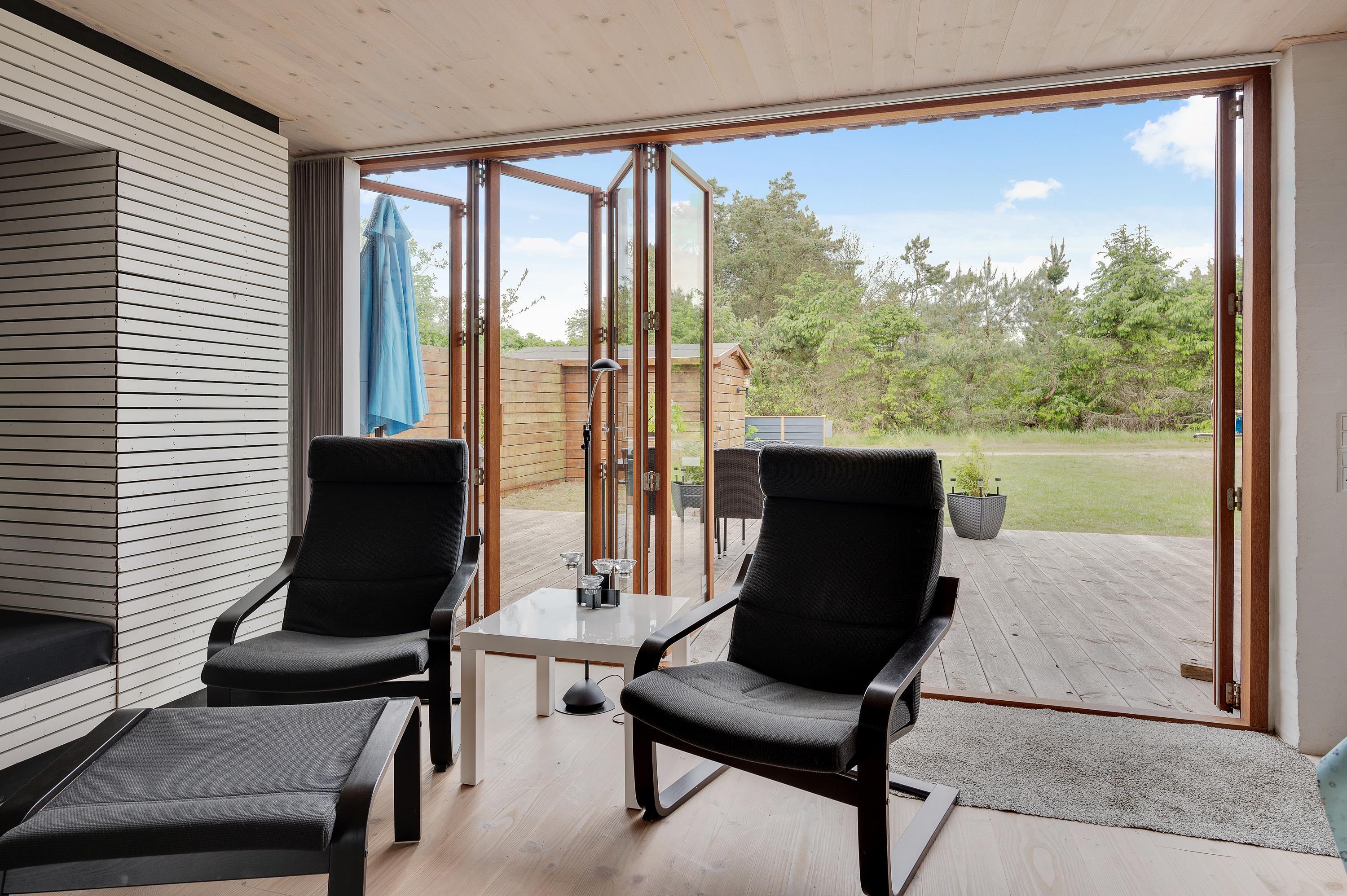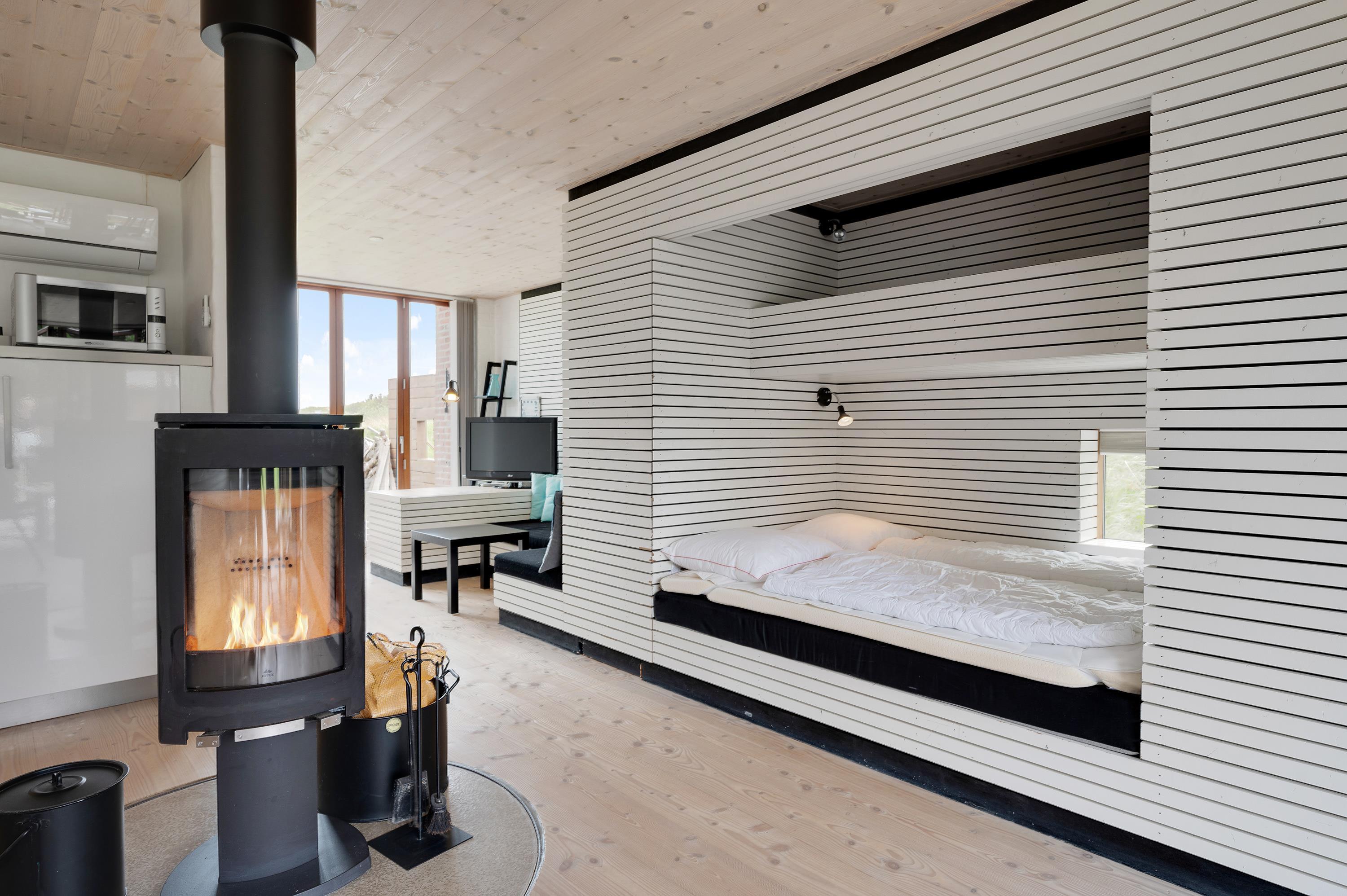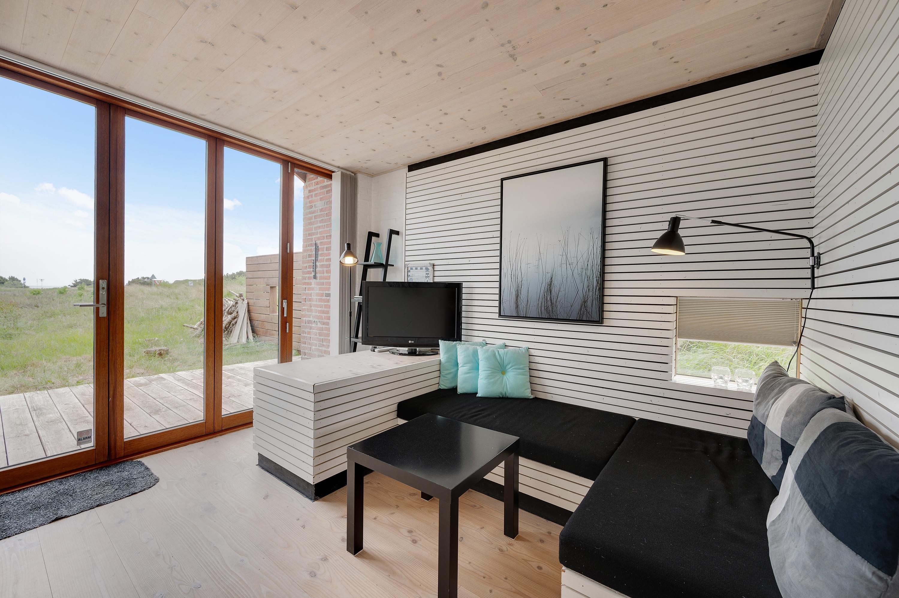 Mod øst er der et hyggeligt sofahjørne med fladskærms-tv med Allente, dog er der ikke noget internet i feriehuset. Herfra har I direkte udgang til den østvendte morgenterrasse og den kuperede naturgrund. I det store alrum mod vest er køkken, spiseplads og sovealkover samlet. I kan åbne hele det store vinduesparti op, således I kan træde ud på terrassen og nyde en ildrød solnedgang.