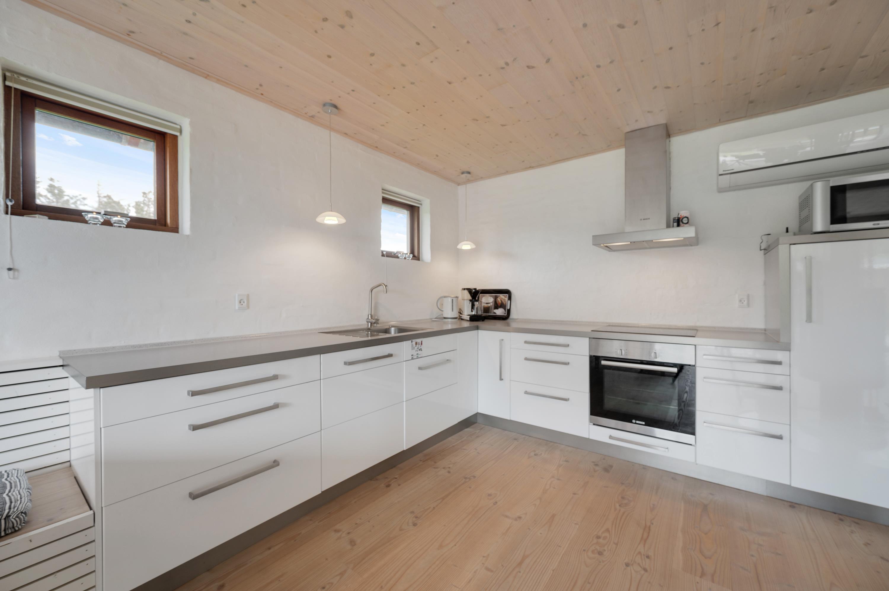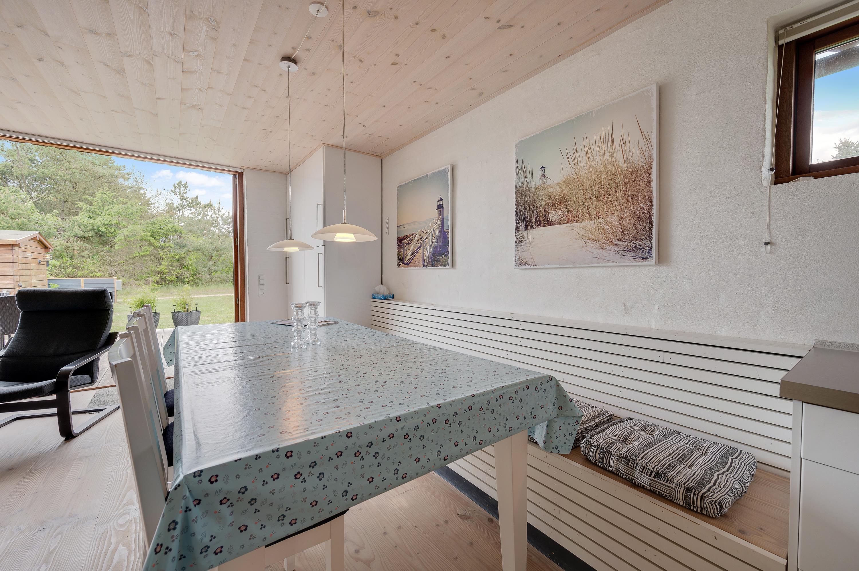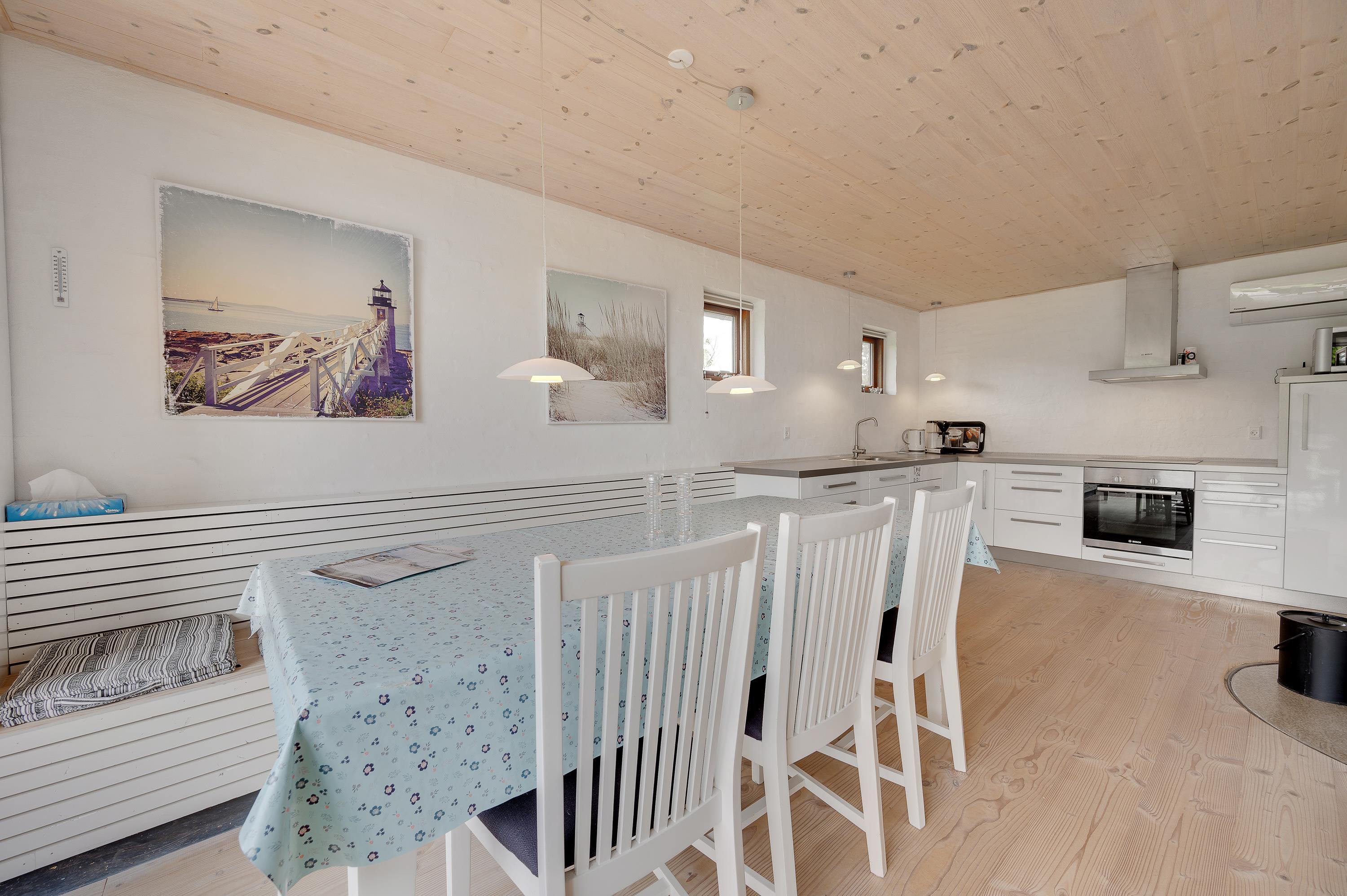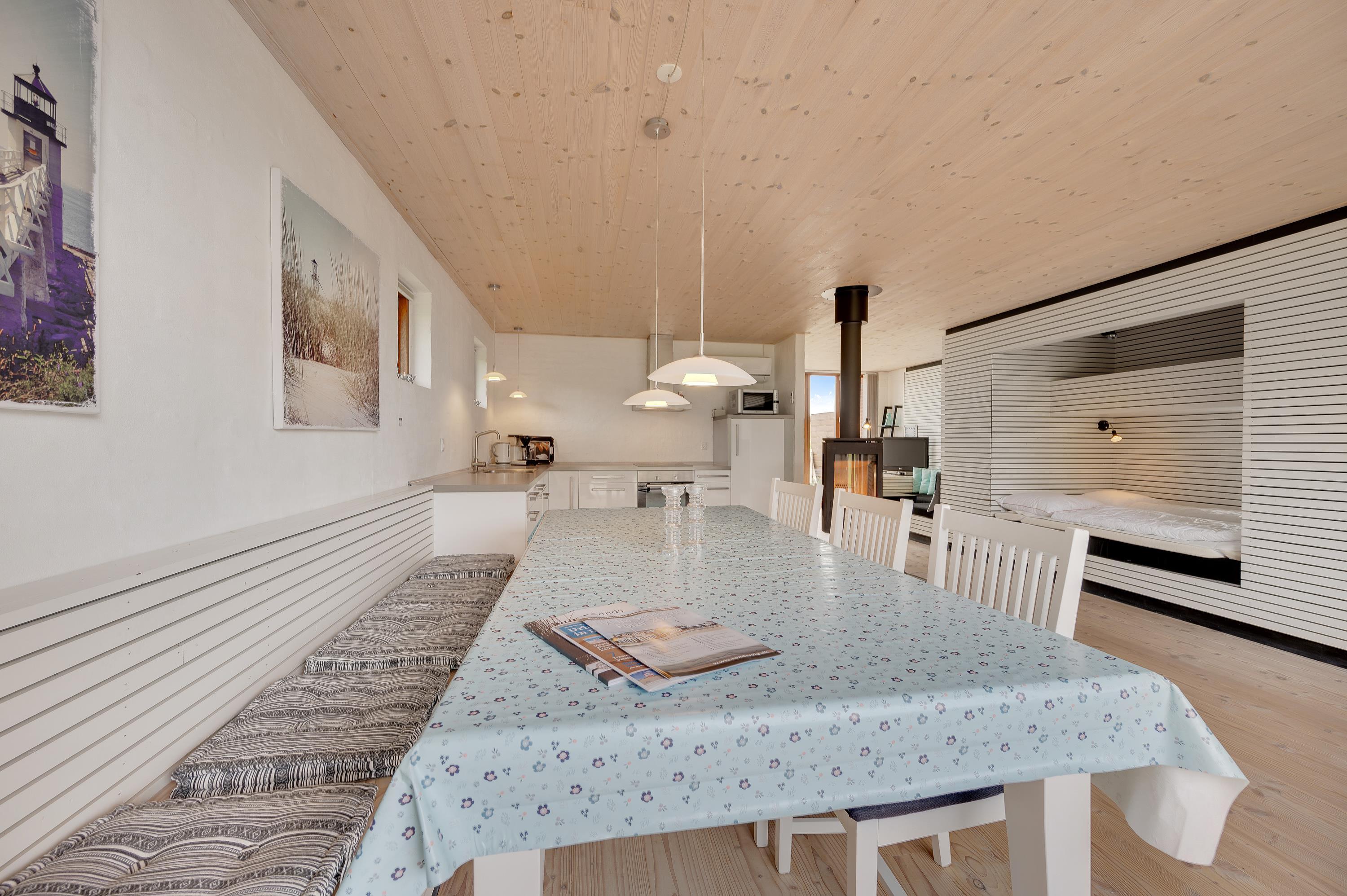 Mod øst er der et hyggeligt sofahjørne med fladskærms-tv med Allente, dog er der ikke noget internet i feriehuset. Herfra har I direkte udgang til den østvendte morgenterrasse og den kuperede naturgrund. I det store alrum mod vest er køkken, spiseplads og sovealkover samlet. I kan åbne hele det store vinduesparti op, således I kan træde ud på terrassen og nyde en ildrød solnedgang.