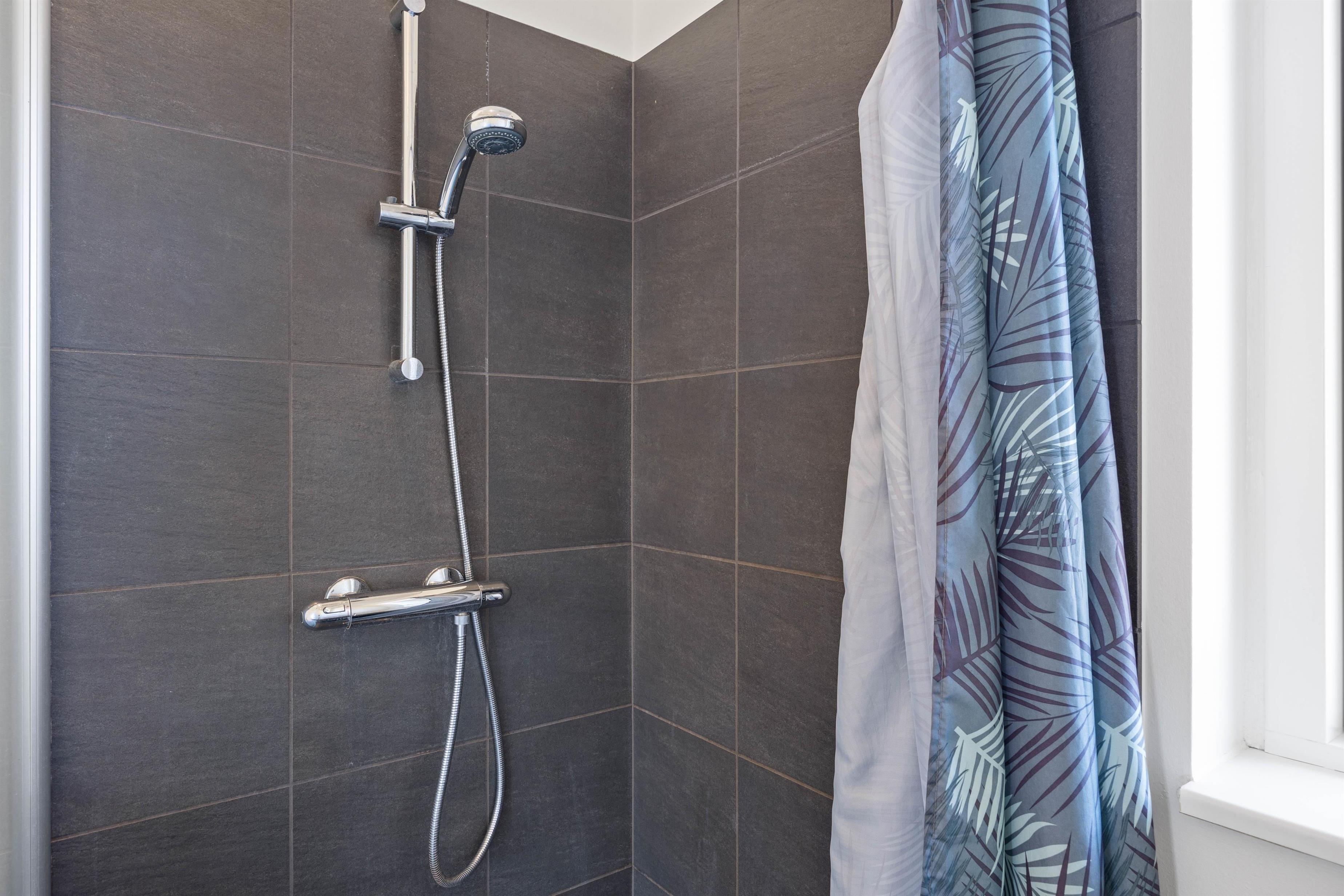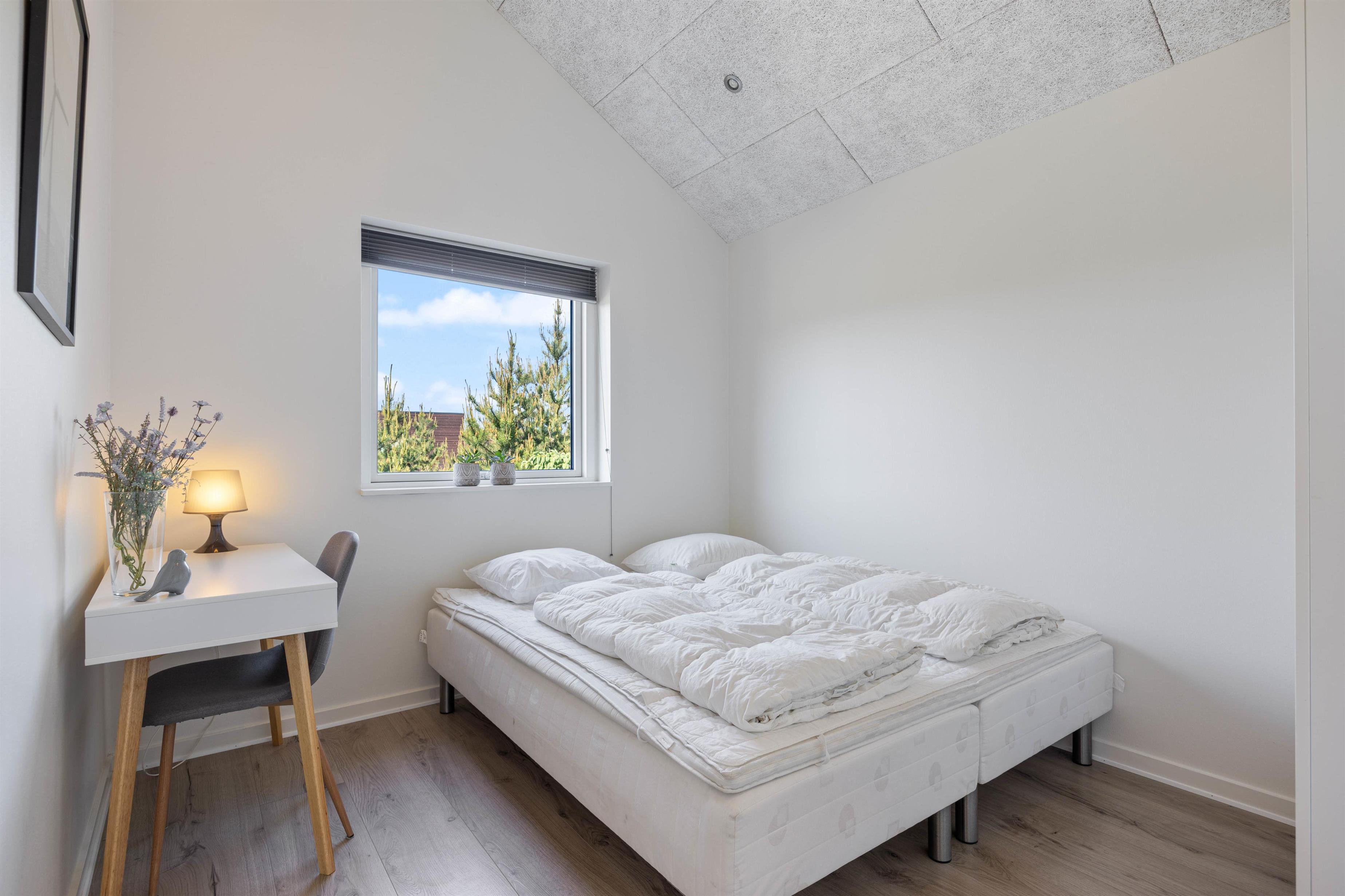 Til feriens 6 gæster er der 3 soveværelser, hvoraf 2 er placeret i den ene ende af sommerhuset, og 1 er placeret i den anden ende af sommerhuset, hvilket gør det perfekt for to familier. I hver af de to afdelinger i sommerhuset er også der et badeværelse med gulvvarme – ingen skal hverken fryse tæerne eller stå i kø til toilettet om morgenen.