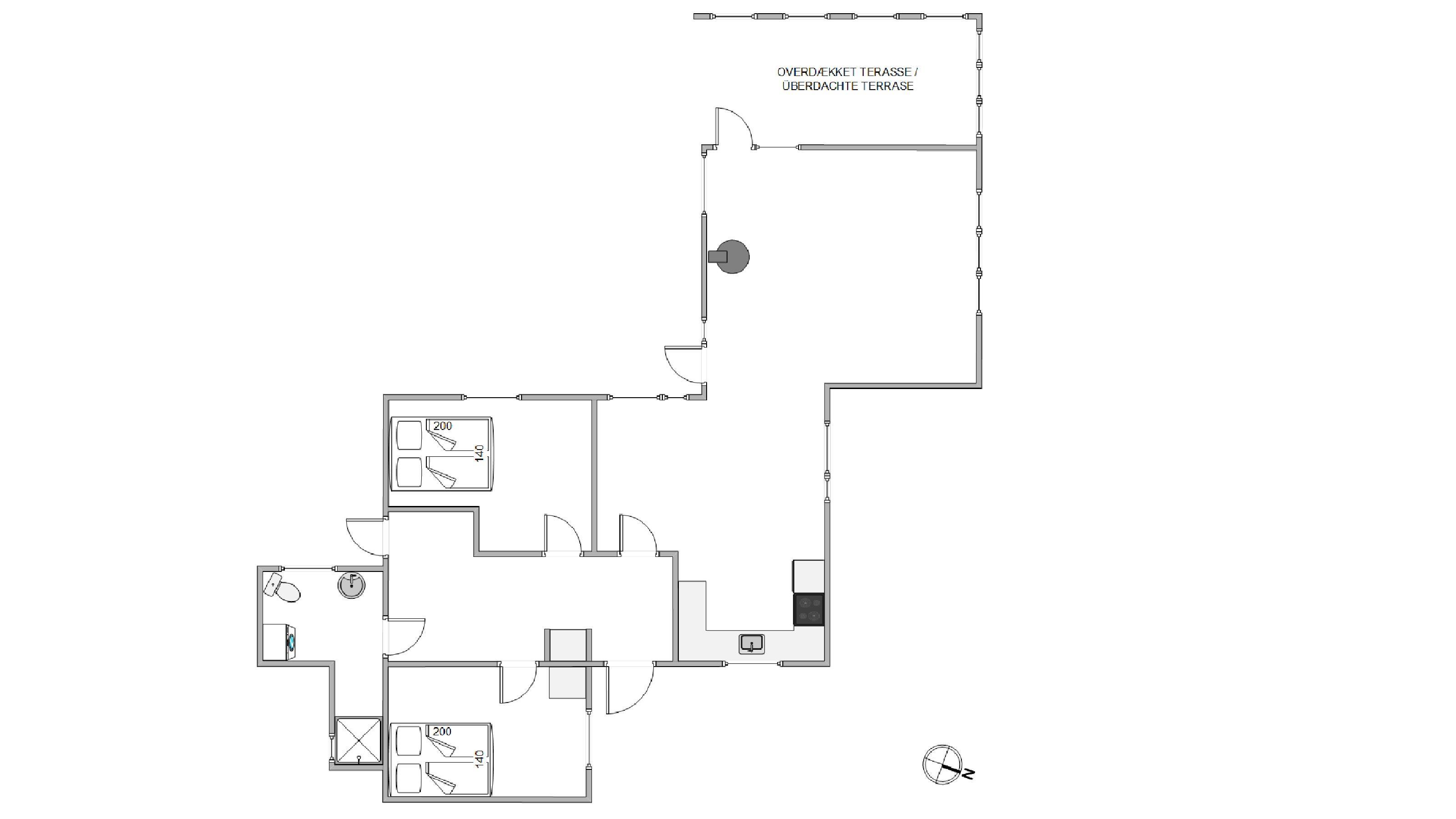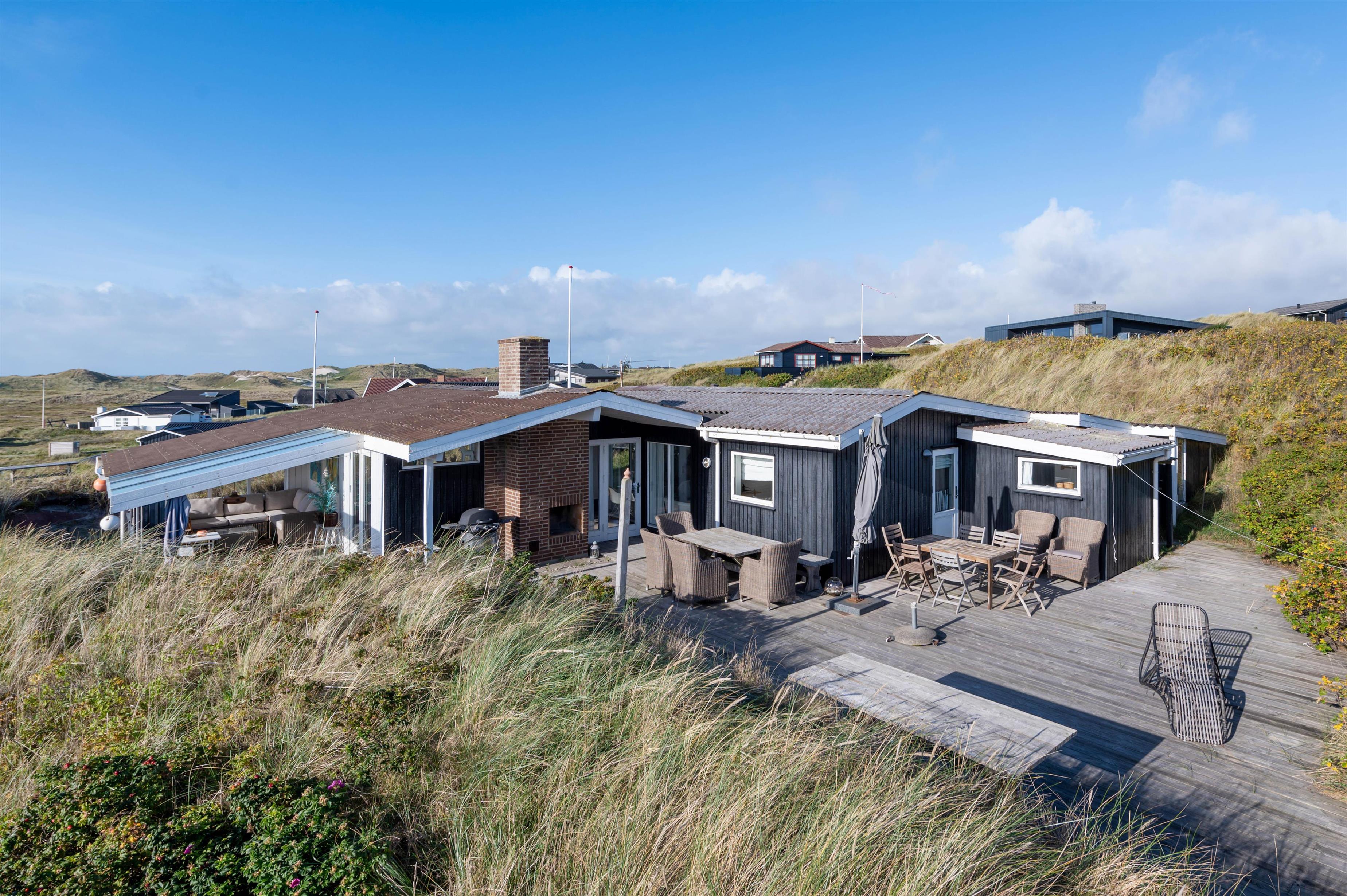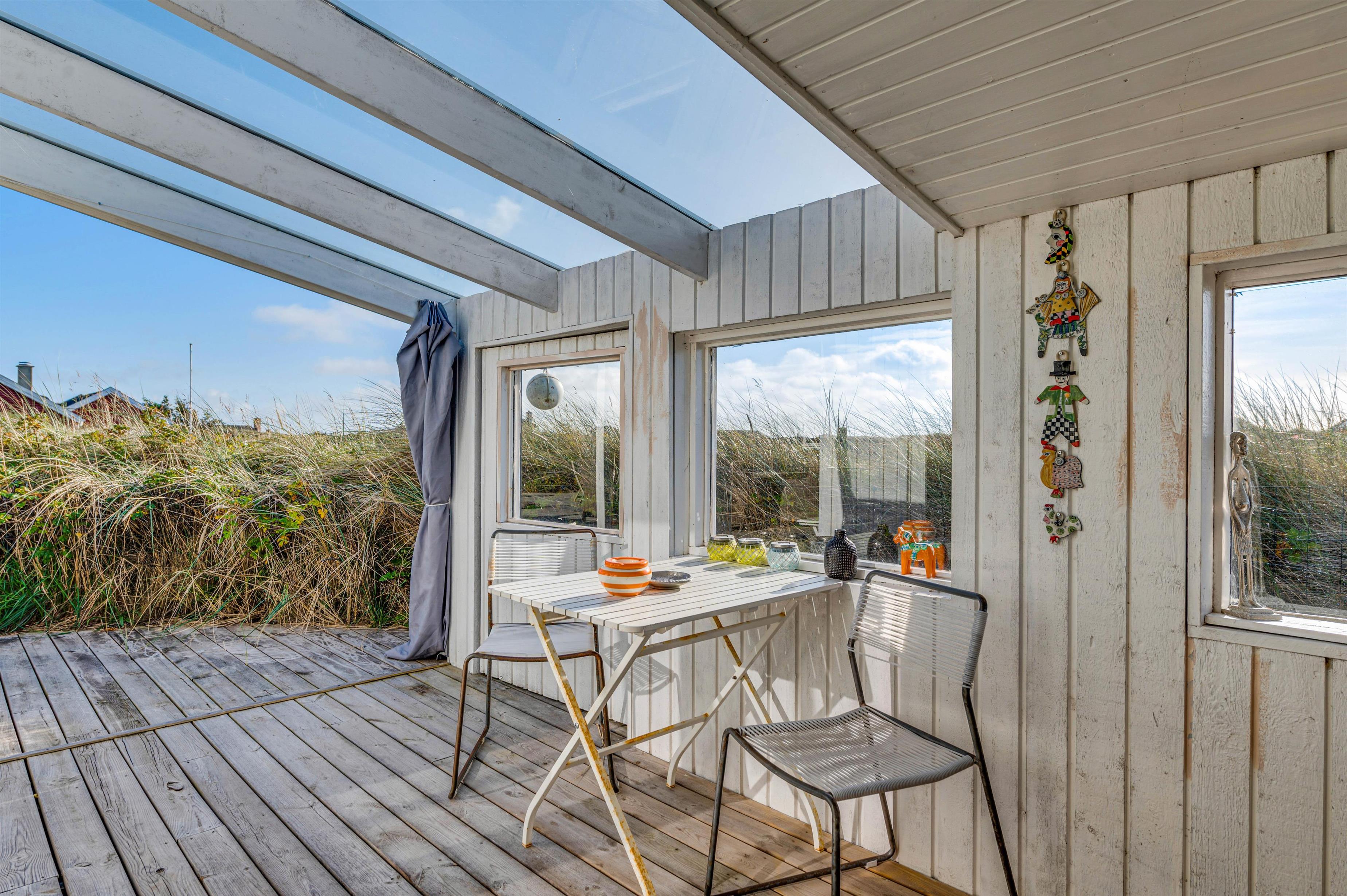 Sommerhuset byder desuden på et skønt udeområde. Her kan I nyde de solrige feriedage på sommerhusets terrasse, hvor I kan sætte jer godt til rette i havemøblerne, mens I slapper af og lytter til de brusende bølger i baggrunden. En del af terrassen er overdækket og afskærmet, og derfor er der også mulighed for, at I kan sidde i ly og læ.