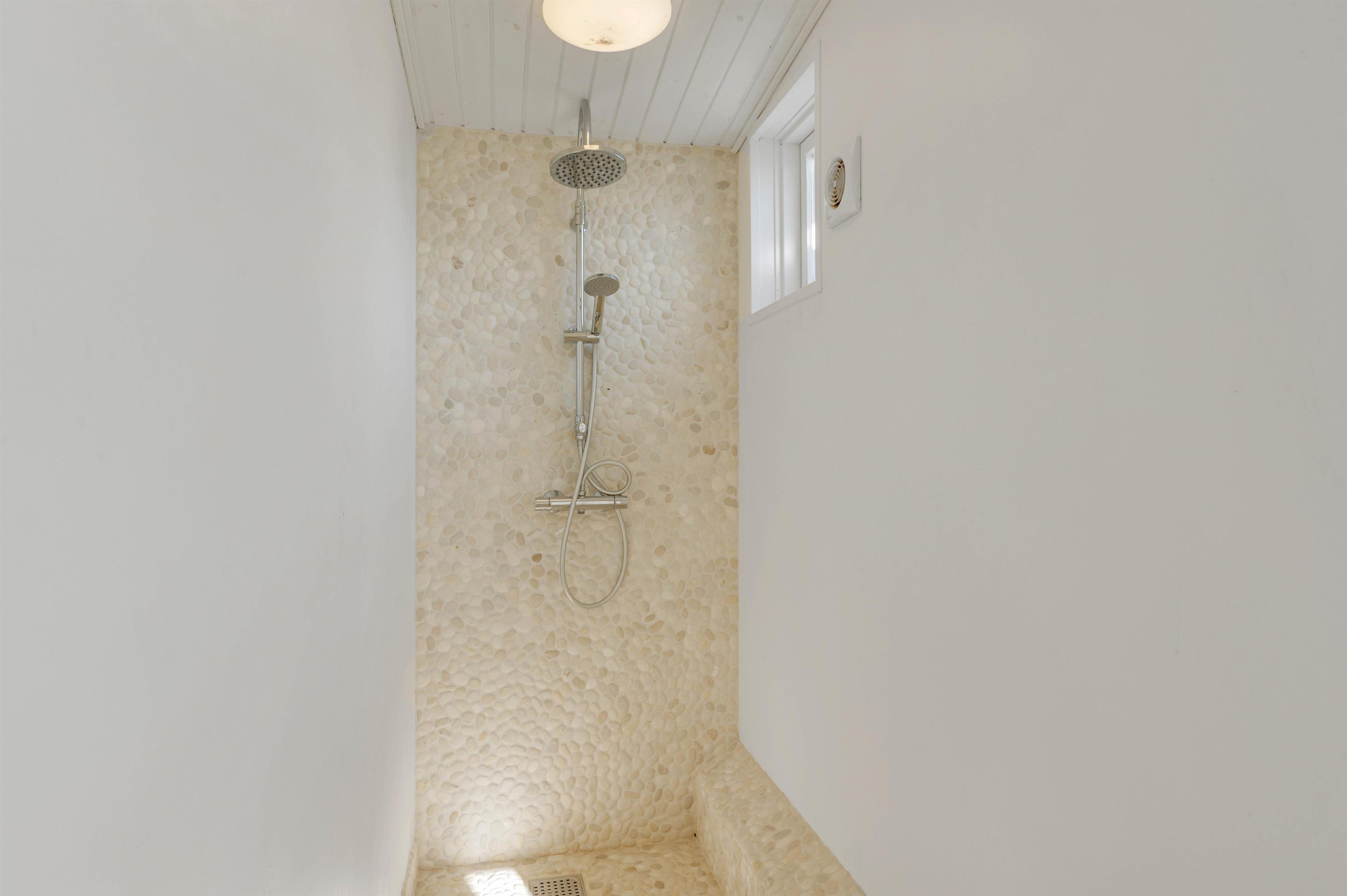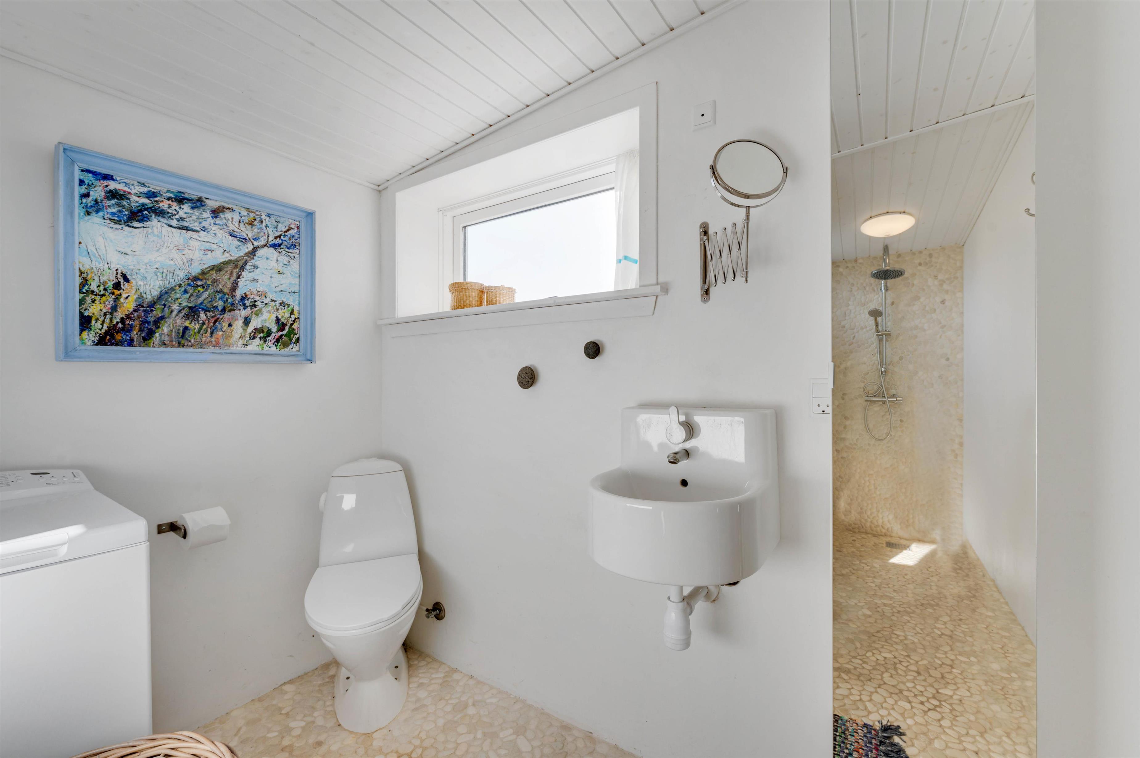 I sommerhuset er der også en energivenlig varmepumpe, der sørger for, at I har et godt indeklima på jeres ferie. Desuden er der gulvvarme på badeværelset, så I slipper for at starte jeres feriedage ud med kolde fødder.