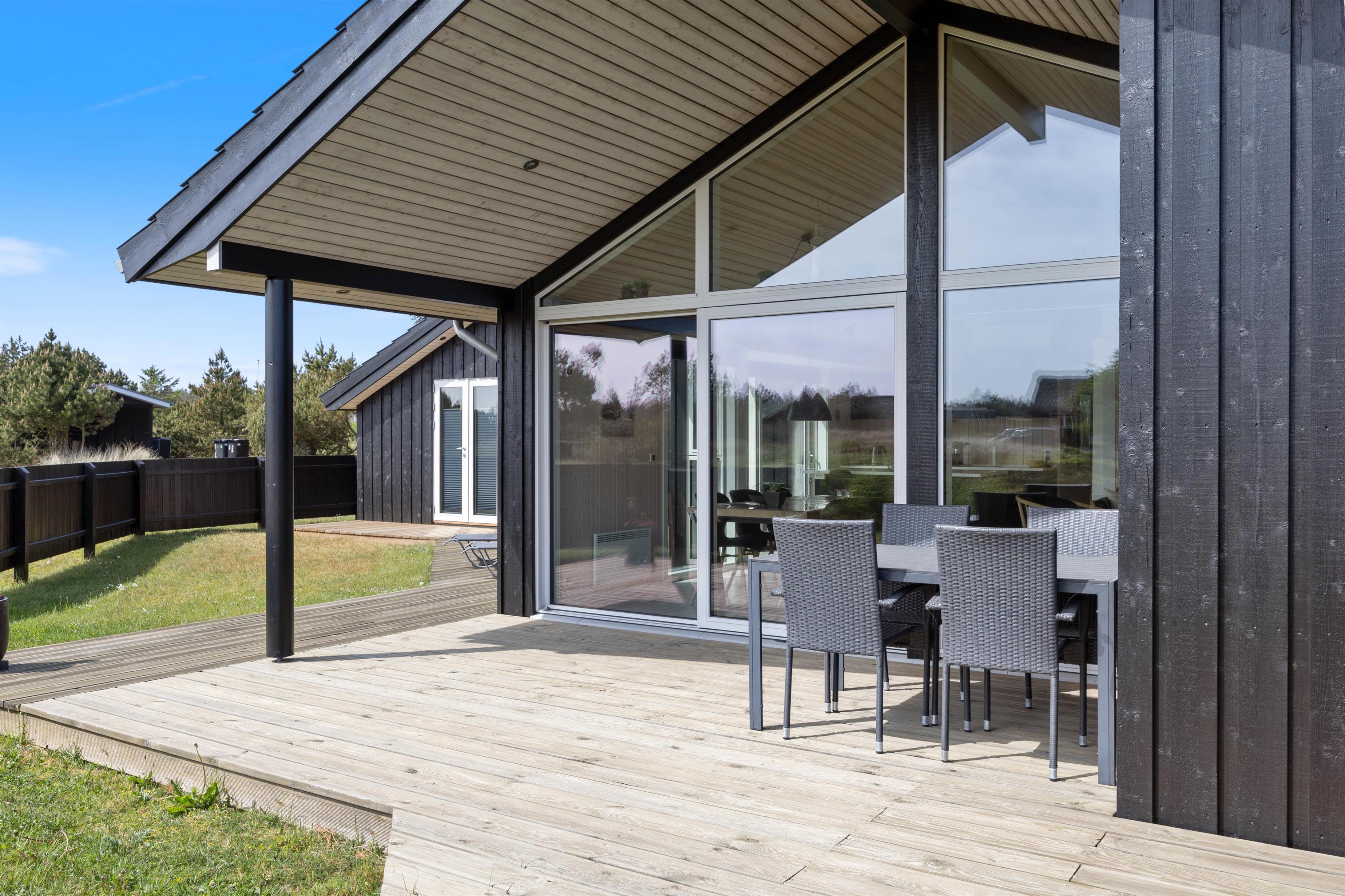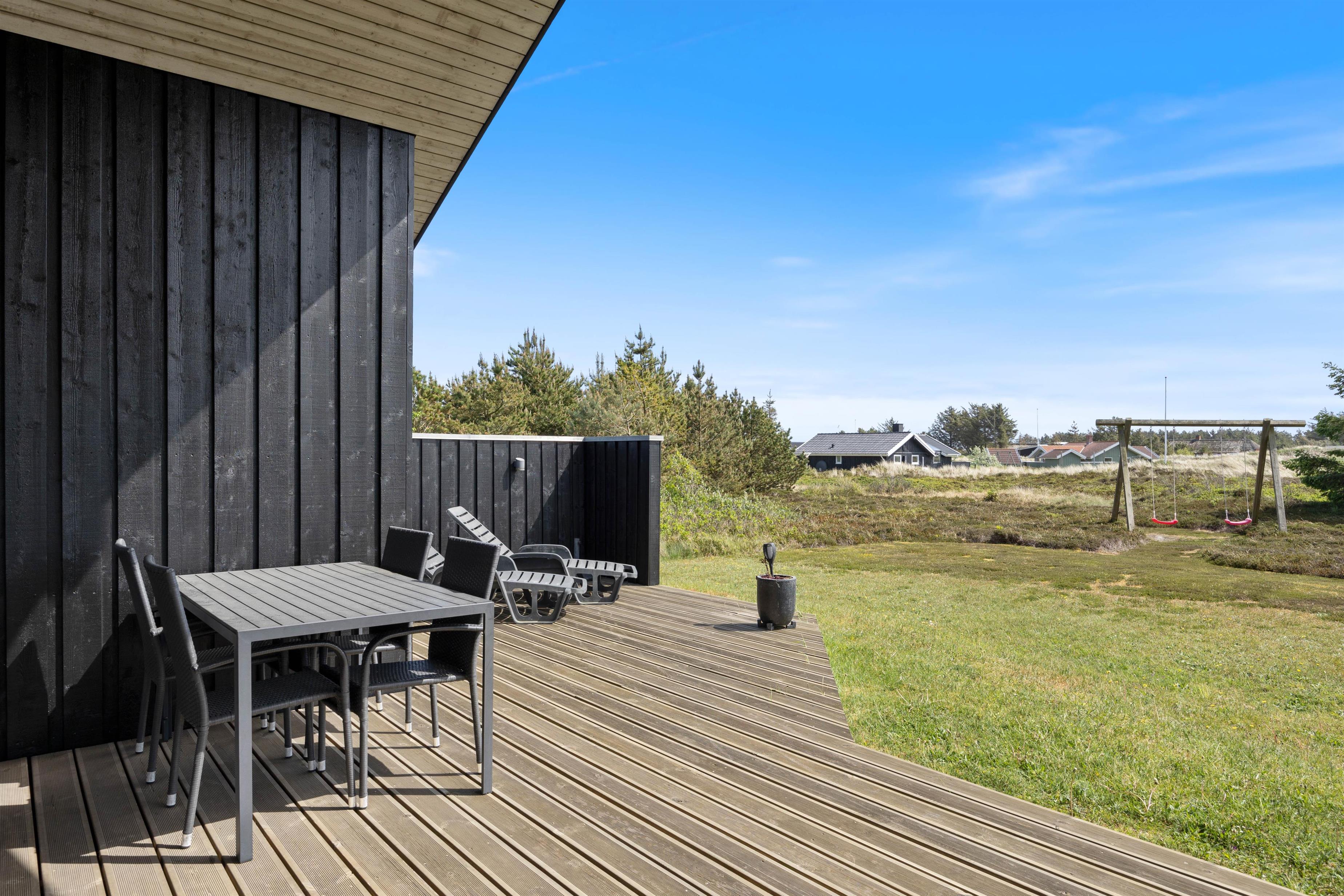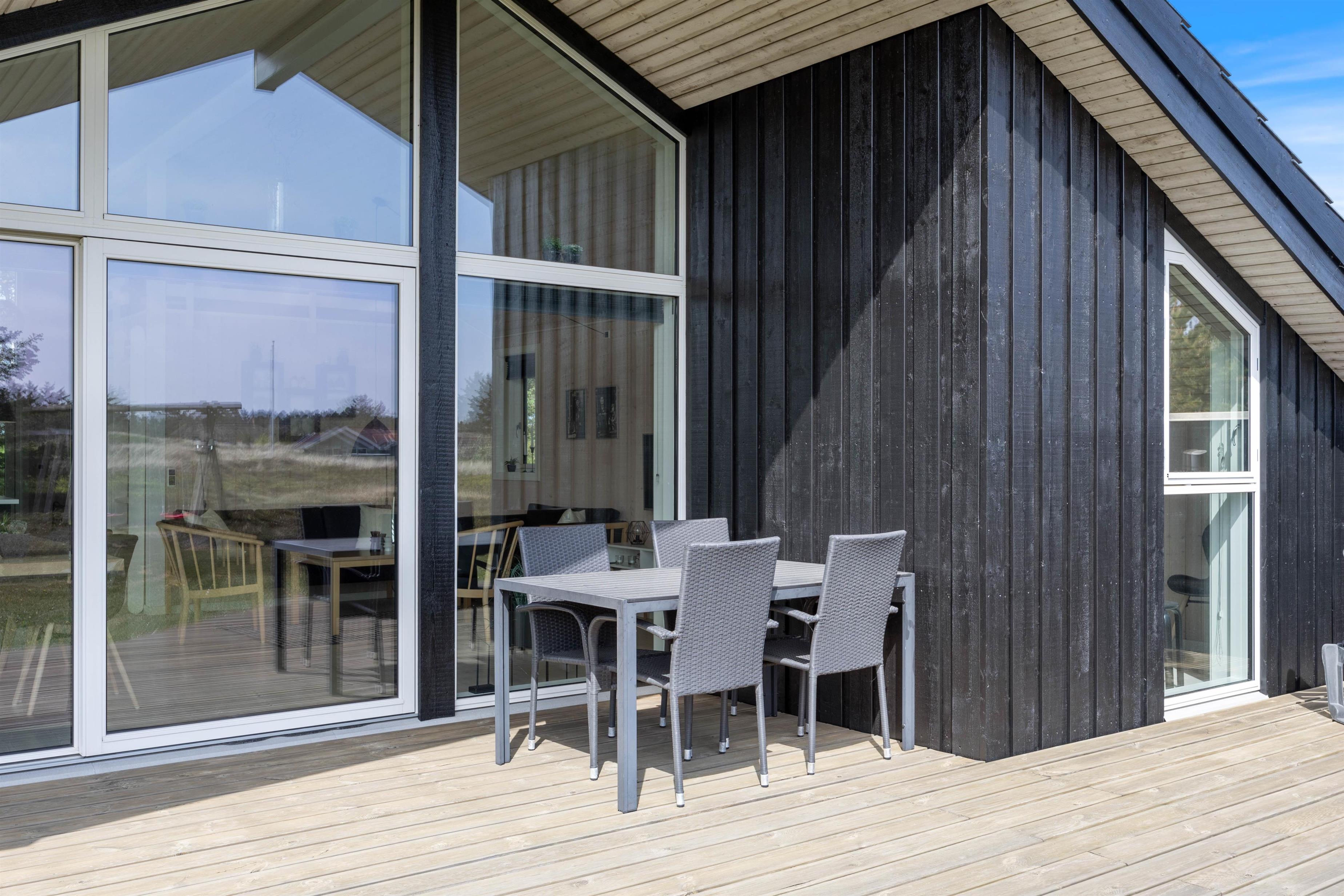 Både fra køkkenet og stuen er der udgang til den store lækre træterrasse, hvor I kan nyde det gode vejr fra liggestolene og spise en god frokost i solen. Terrassen er godt afskærmet hele vejen rundt, og her finder I læ, selv når vestenvinden suser.
