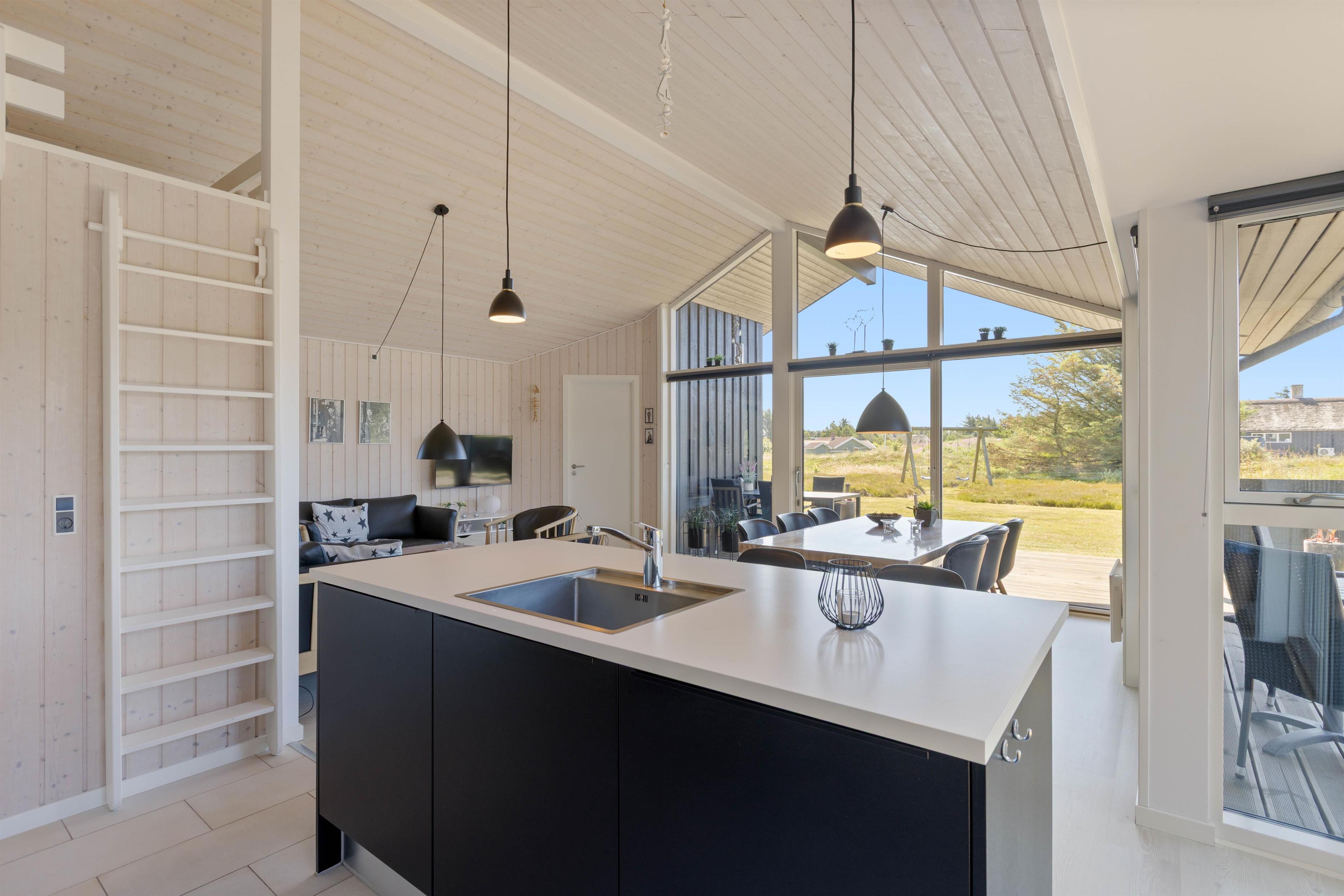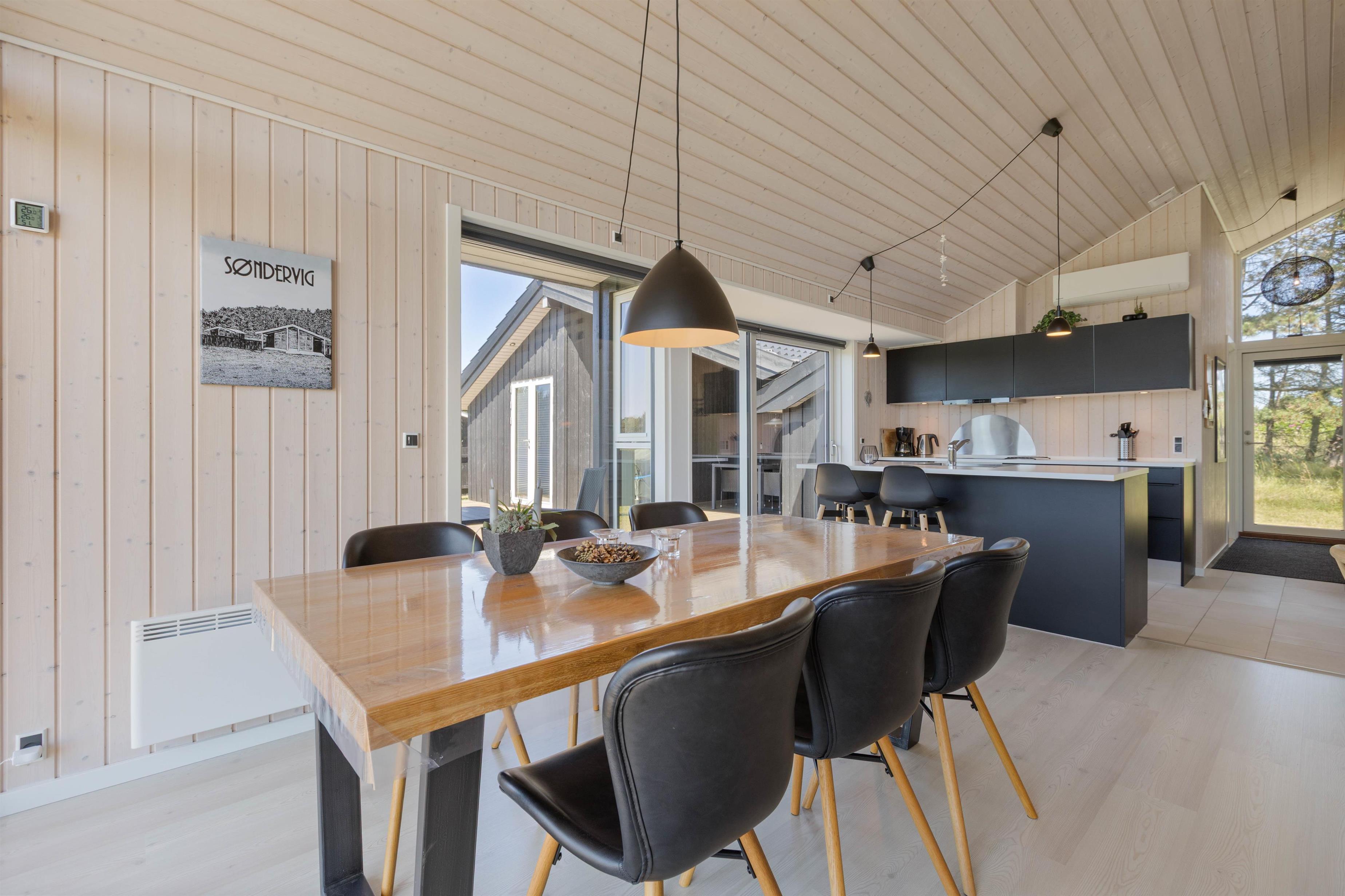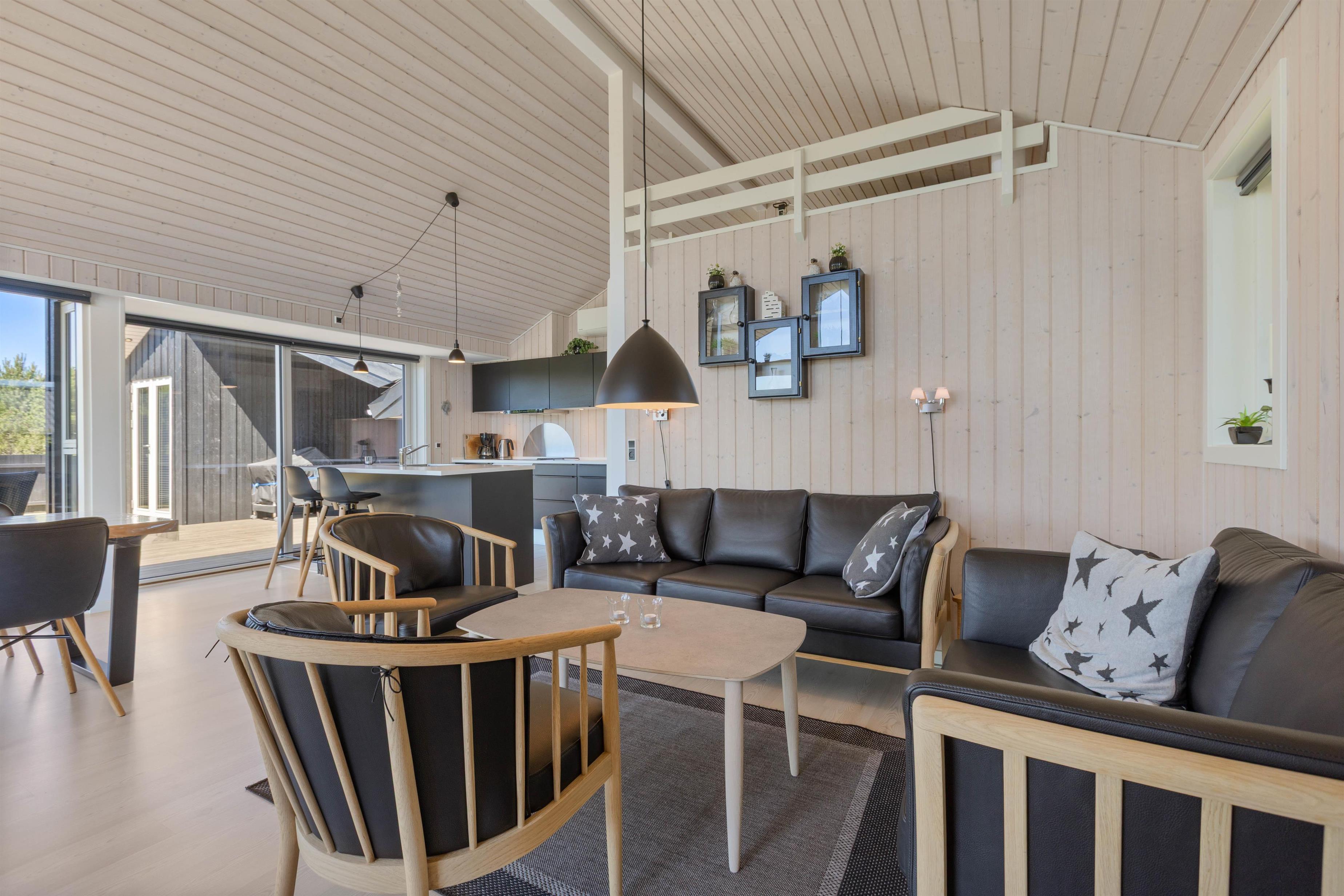 De lyse trælofter, gulve og vægge sørger for en venlig atmosfære, hvor I fra første ferieøjeblik vil føle jer godt tilpas. I det kombinerede opholdsrum med stue, køkken og spiseafdeling er rammerne sat for en ferie med masser af samvær og fællesskab.