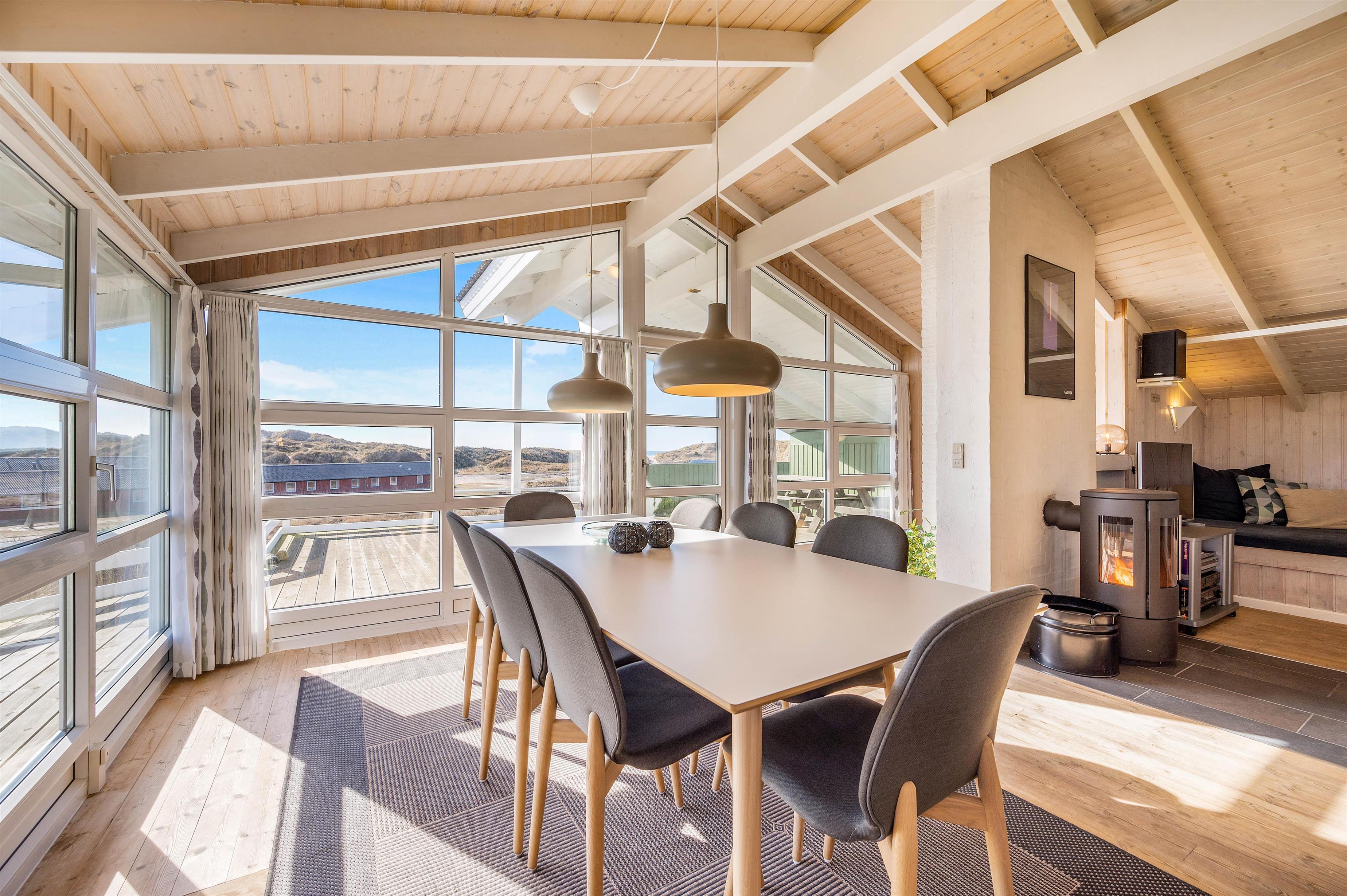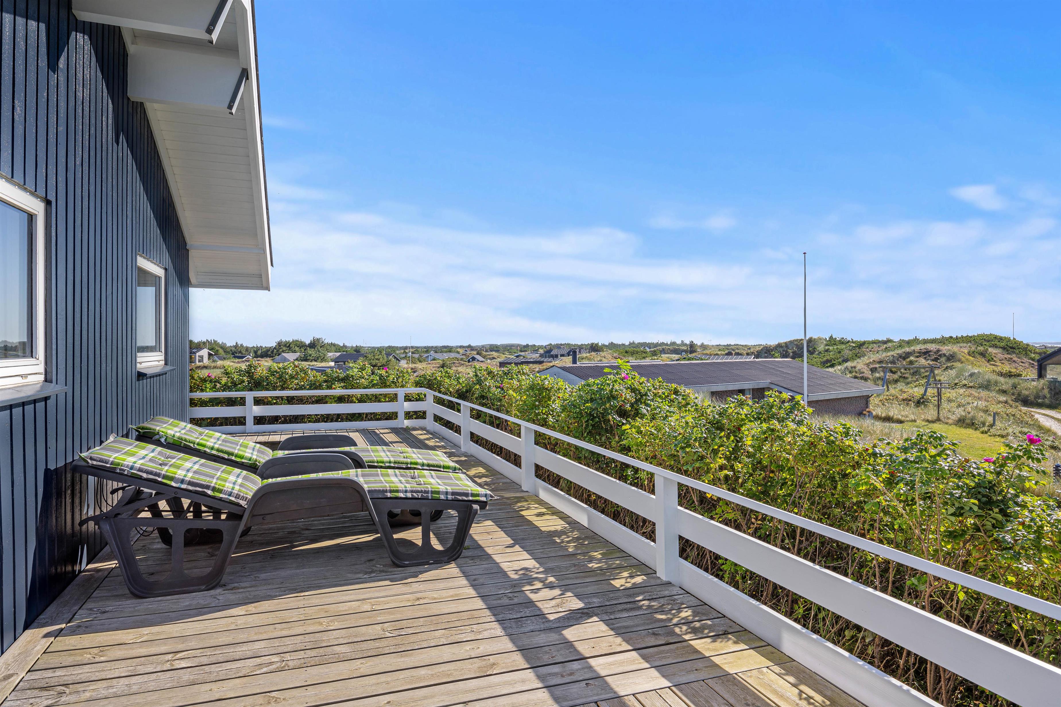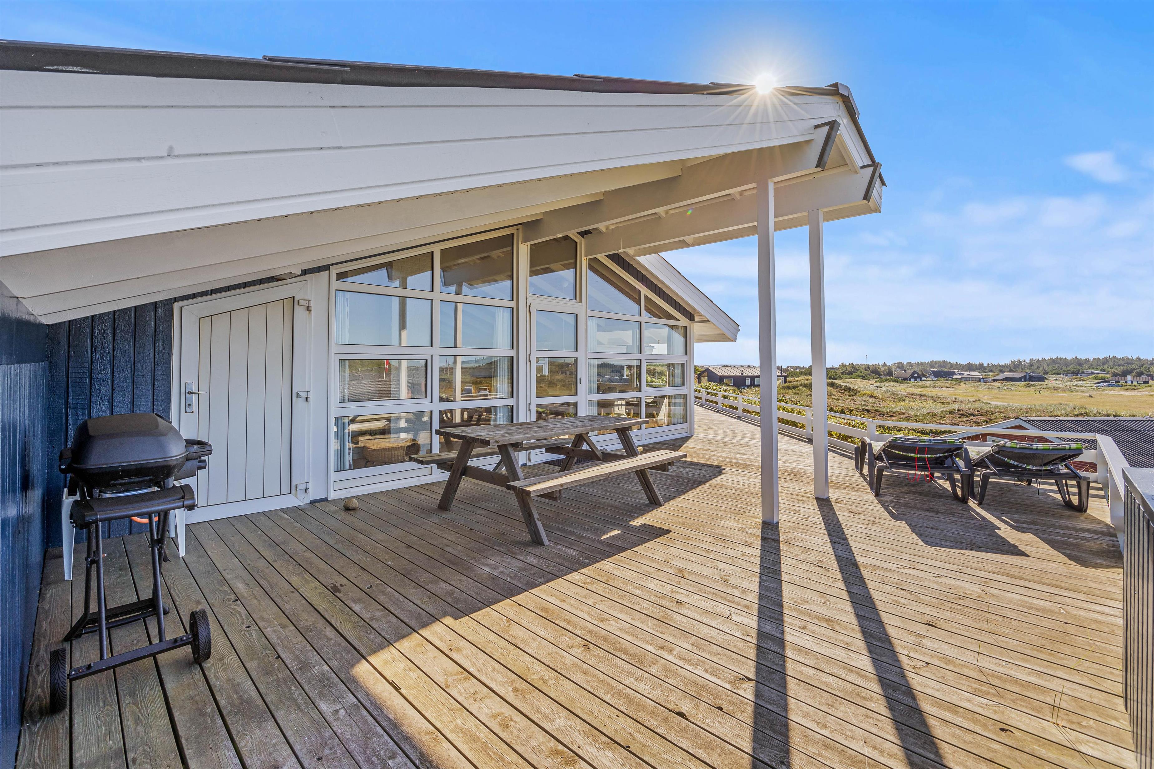 Fra stuen træder I direkte ud på den skønne syd-, øst-, og vestvendte terrasse med områdets måske nok flotteste udsigt. Terrassen er ideel som morgenterrasse, hvor I har solen i øst. I løbet af dagen kan I nyde solen henslængt i en liggestol, mens I om aftenen kan tænde op i grillen og stege et par saftige bøffer, alt imens I betragter den røde solnedgang bag klitterne og lytter til Vesterhavets brusende bølger i baggrunden.
