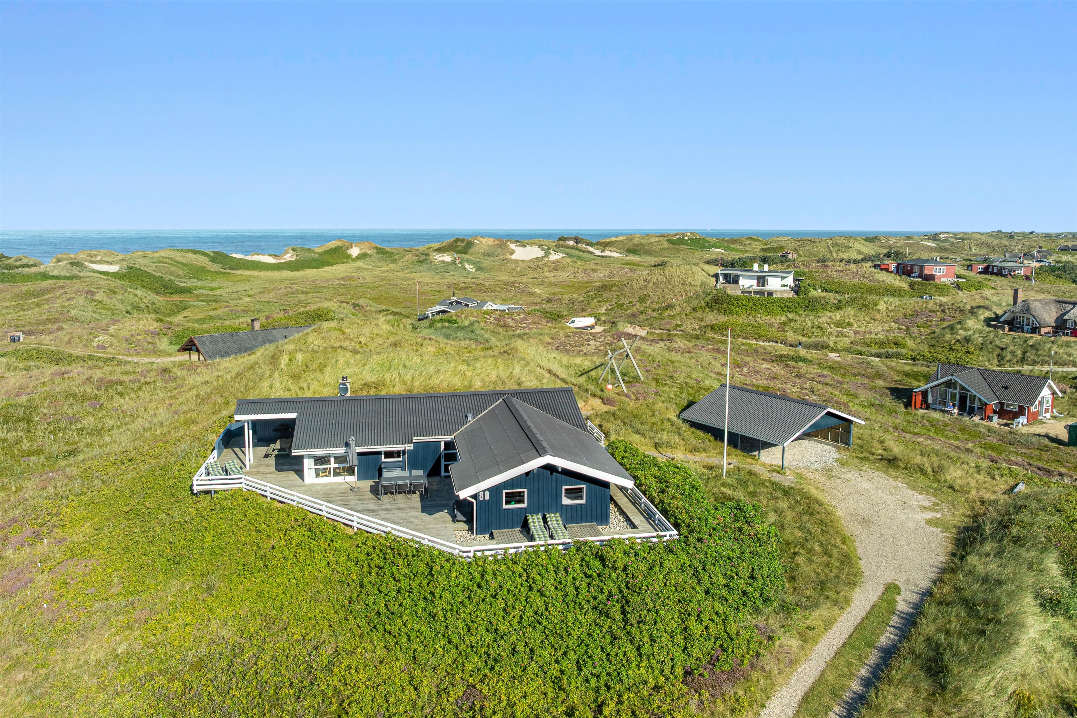 På Holmsborgvej 80 i Søndervig får I en af områdets nok bedste beliggenheder kun 250 meter fra Vesterhavet. I det 125 kvadratmeter store sommerhus med plads til 8 personer kan I se frem til at tilbringe jeres ferie i skønne omgivelser med blandt andet spabad og sauna, ligesom I kan nyde den skønneste panoramaudsigt ud over Vesterhavet og det flotte omkringliggende klitlandskab. Der er desuden et kraftstik til rådighed til at opladning, hvis I ankommer i jeres el-bil.
