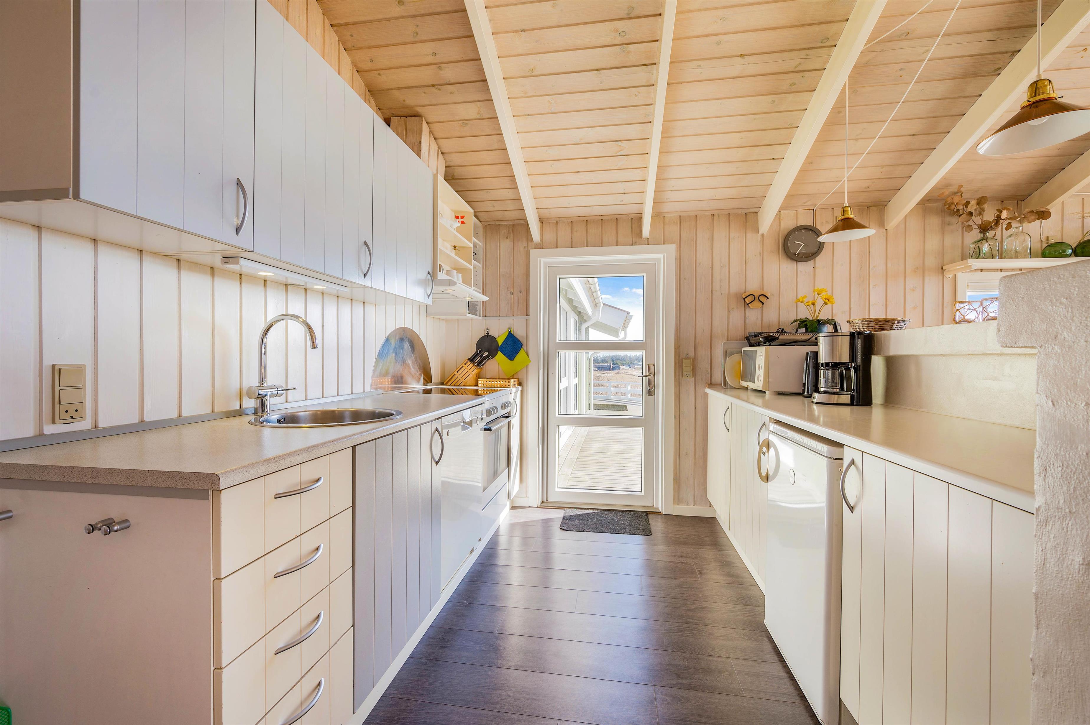 Straks I træder indenfor i det lyse og velindrettede sommerhus, vil I mærke, hvordan feriestemningen langsomt sænker sig over jer. De hvidemalede trævægge og brede loftbjælker gør indretningen ekstra charmerende, og det er tydeligt, at træhuset emmer af ægte sommerhusstemning